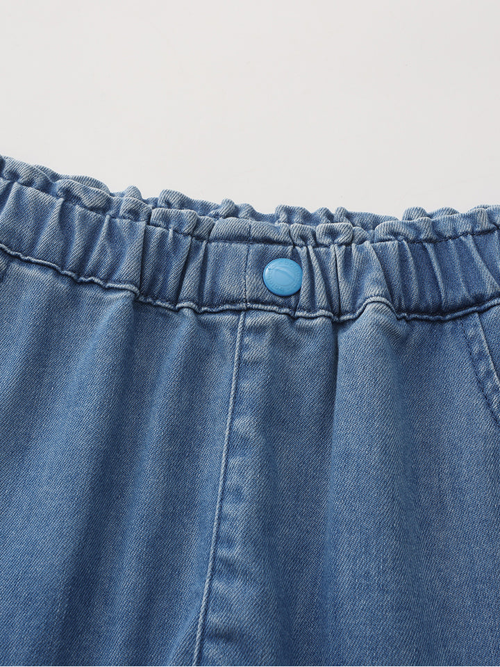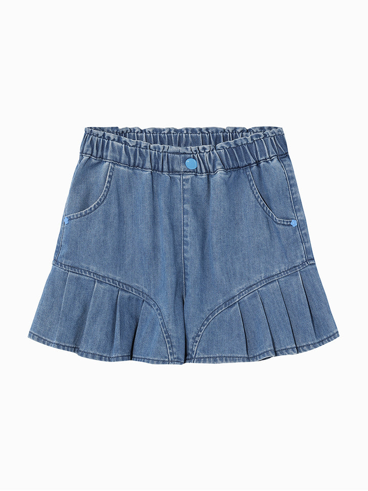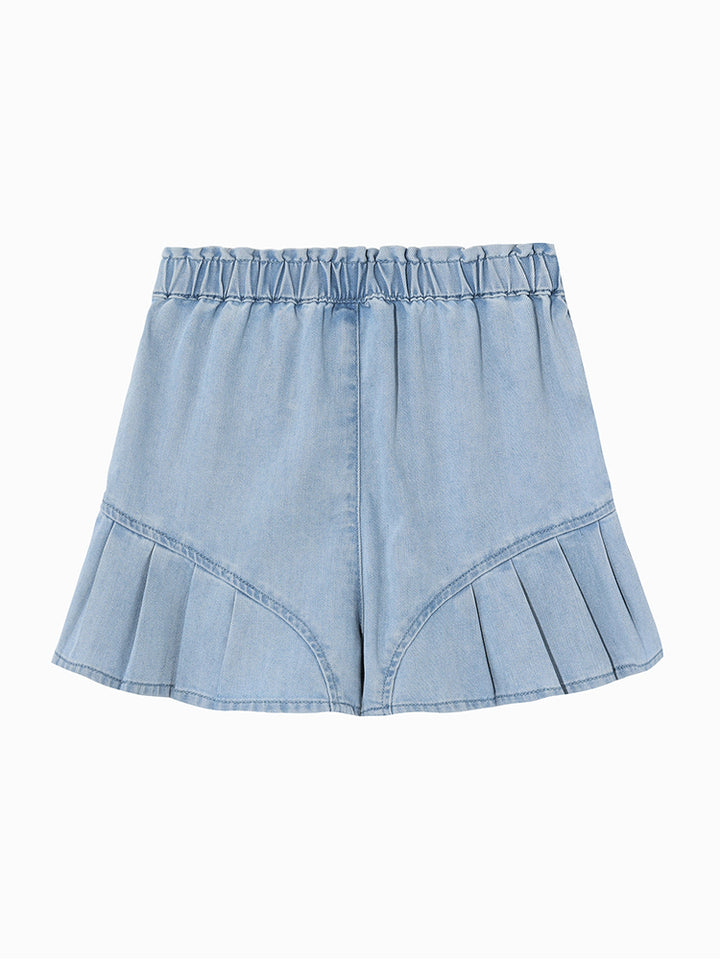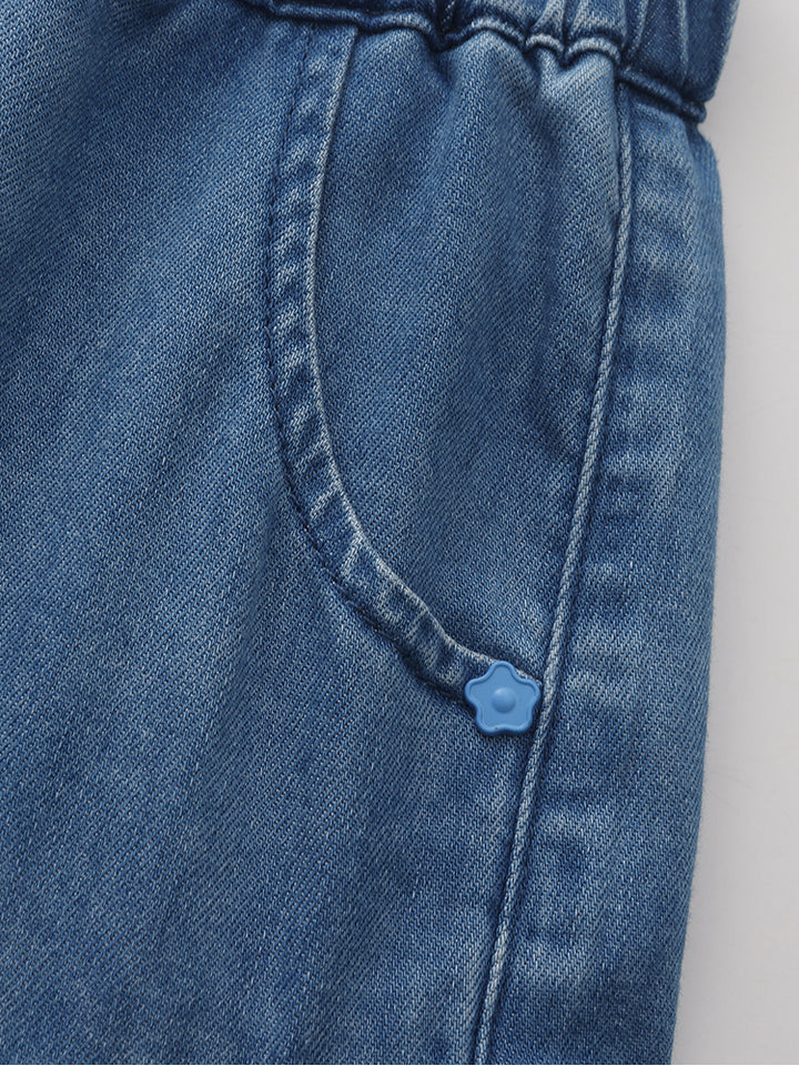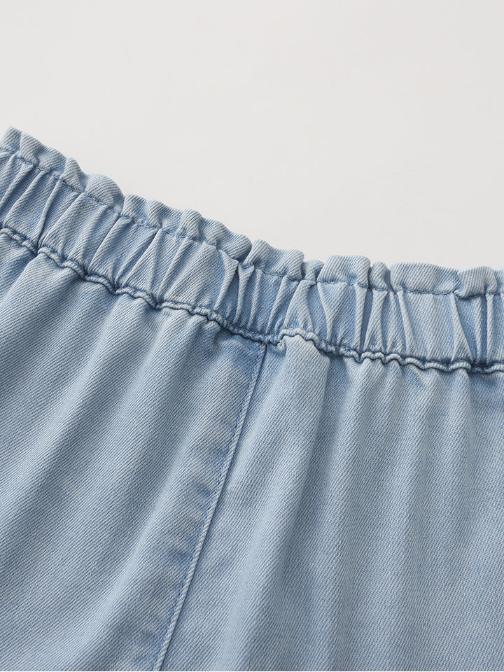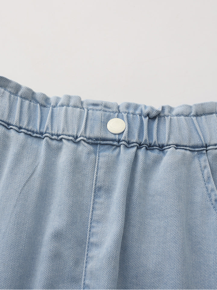 شورت جينز كاجوال بنمط ذو لون موحد ومزين بتفاصيل كسرات، يأتي بجيوب أمامية وبخصر مطاطي مريح
