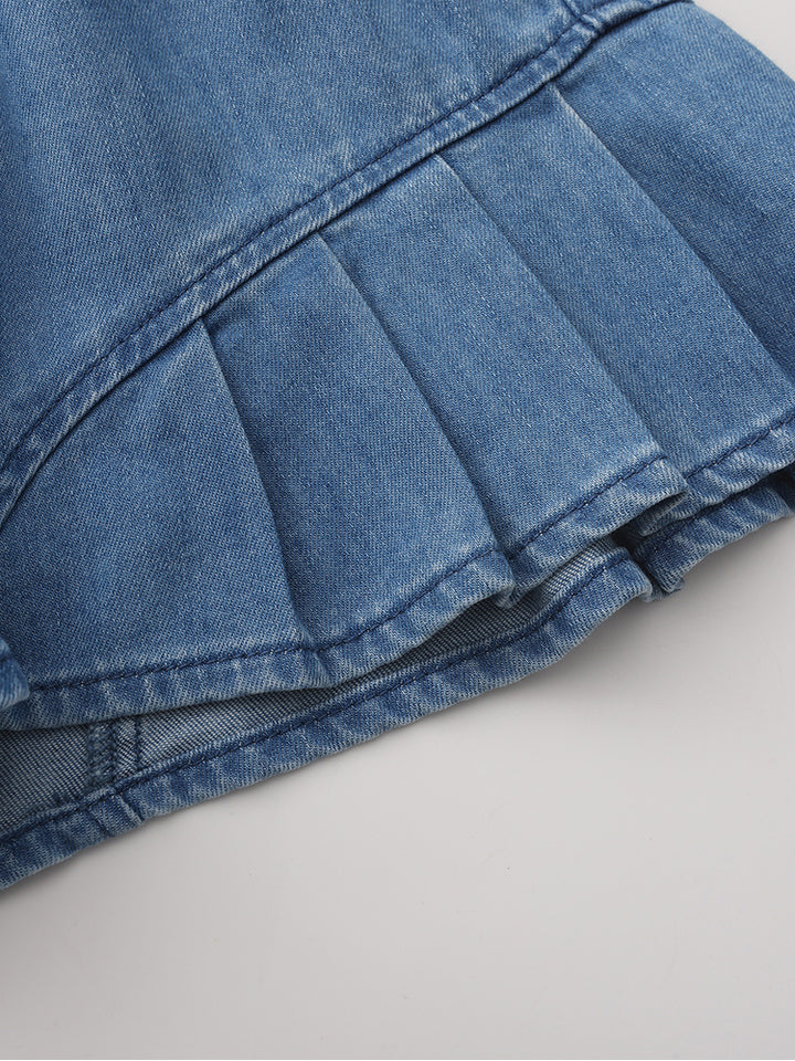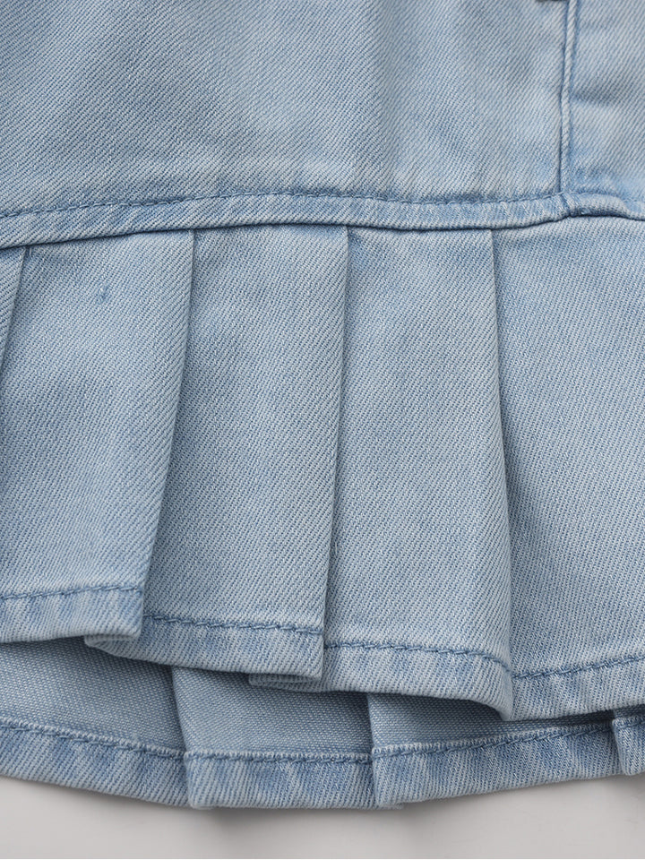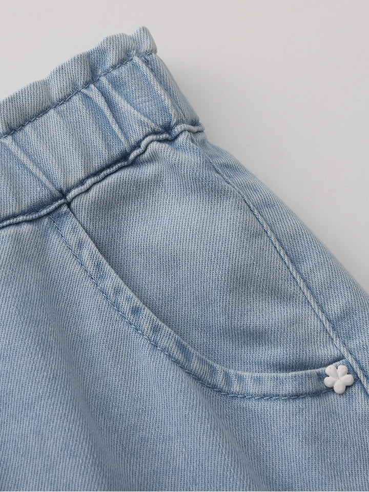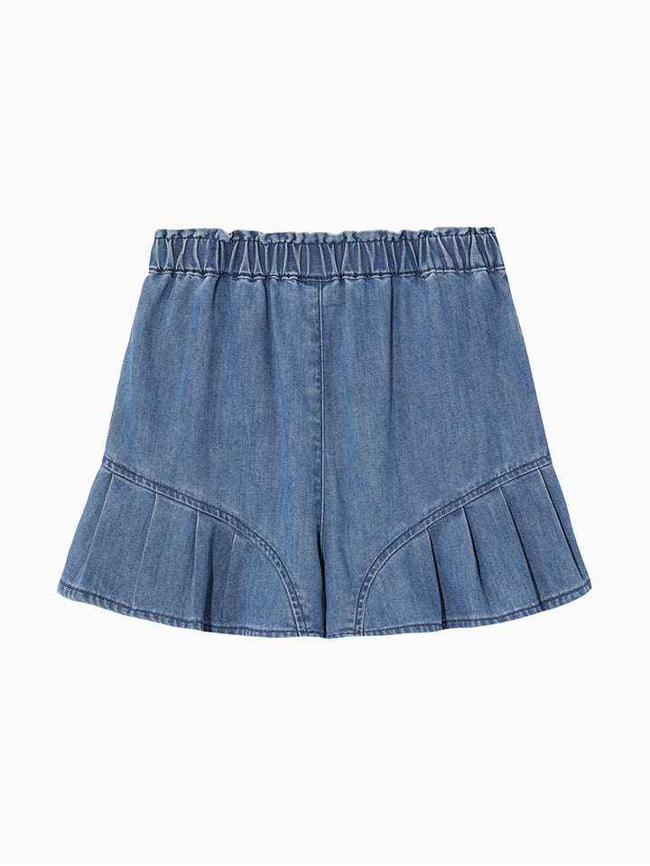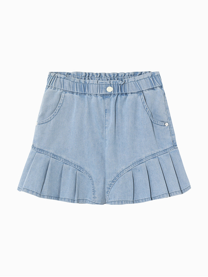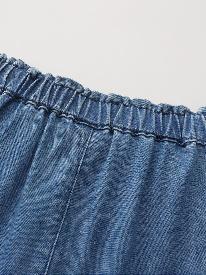 شورت جينز كاجوال بنمط ذو لون موحد ومزين بتفاصيل كسرات، يأتي بجيوب أمامية وبخصر مطاطي مريح