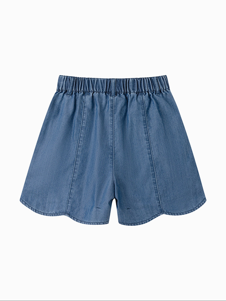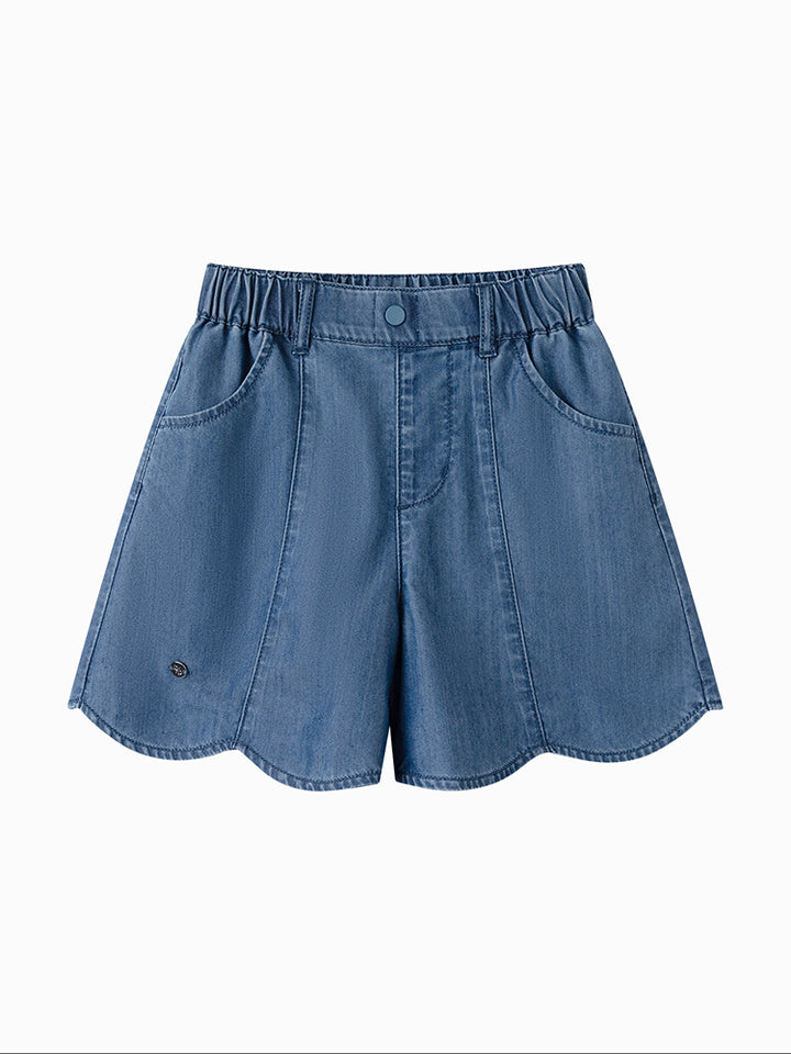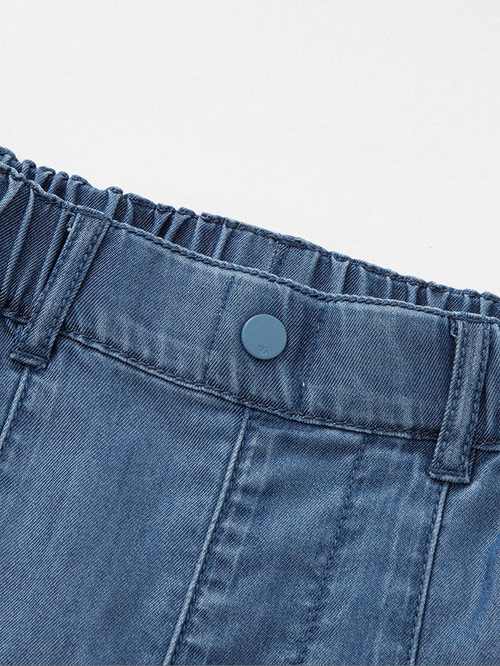 شورت جينز عصري للأطفال بتصميم بلون ثابت وحواف سفلية ملتوية لإضفاء لمسة أنيقة. الخصر المطاطي يضمن ملاءمة مريحة وآمنة، مما يجعله مثاليًا لأيام الصيف غير الرسمية