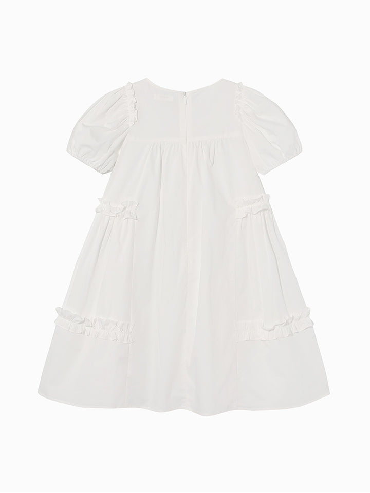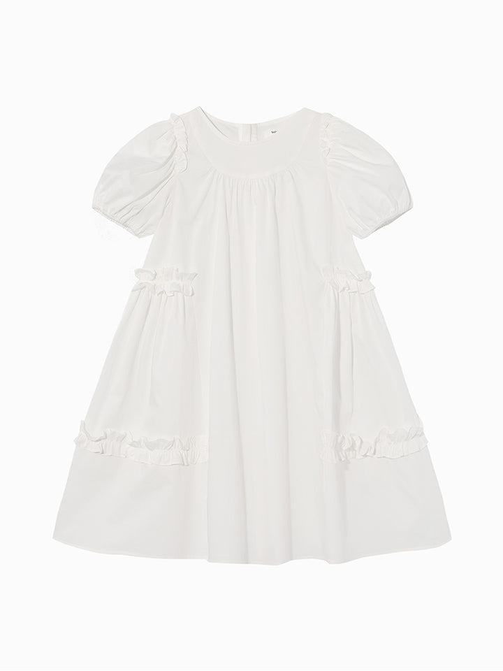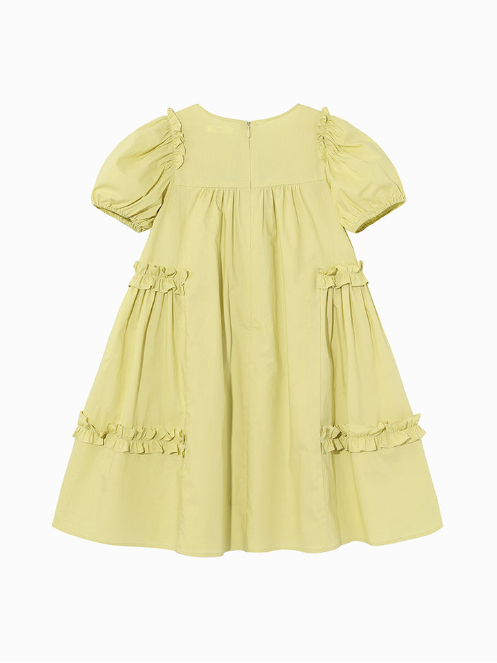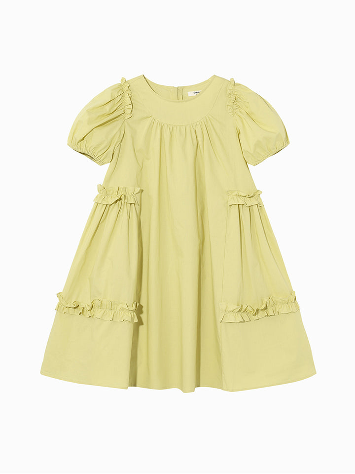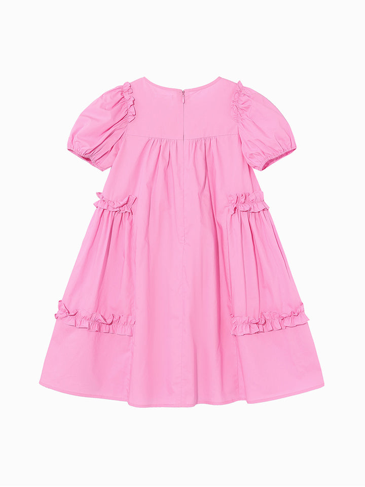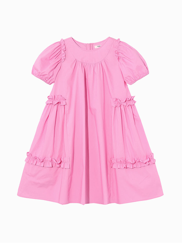 فستان بأكمام قصيرة ونمط بلون موحد ومزين بتفاصيل كشكش، يأتي بسحاب خلفي للإغلاق وياقة مدورة الشكل