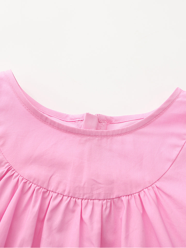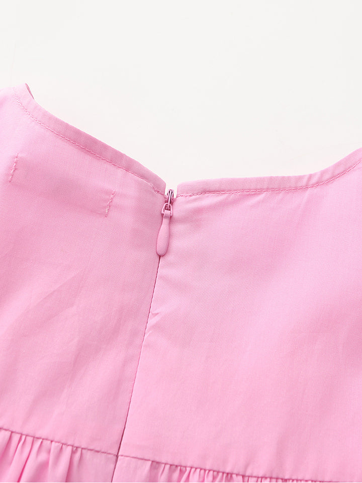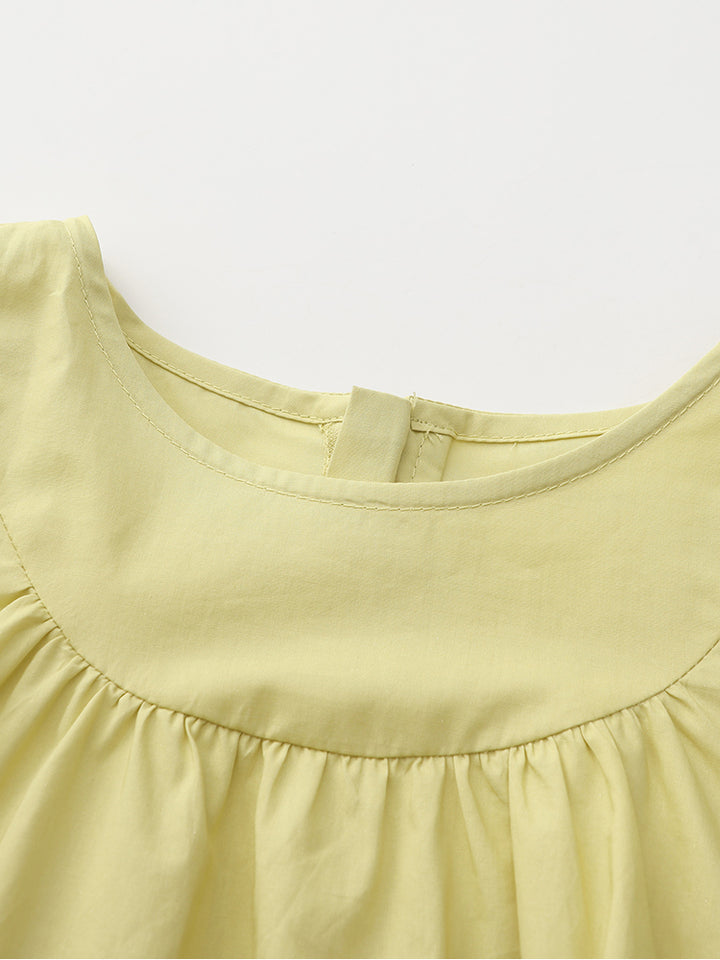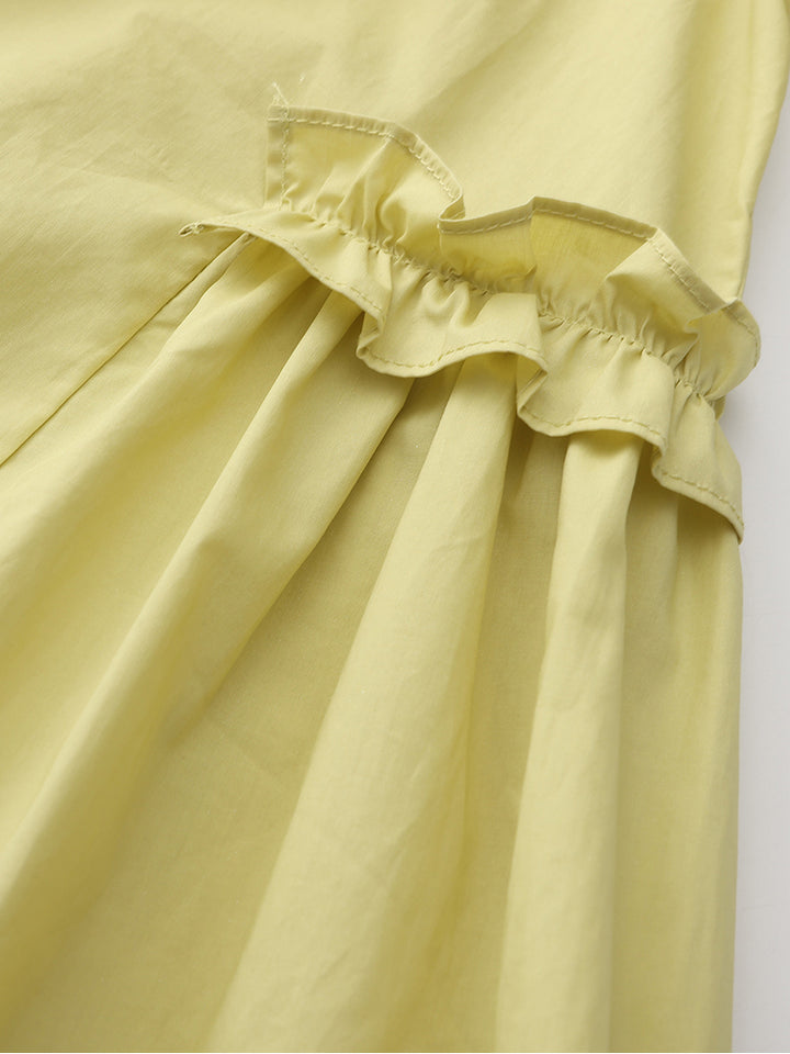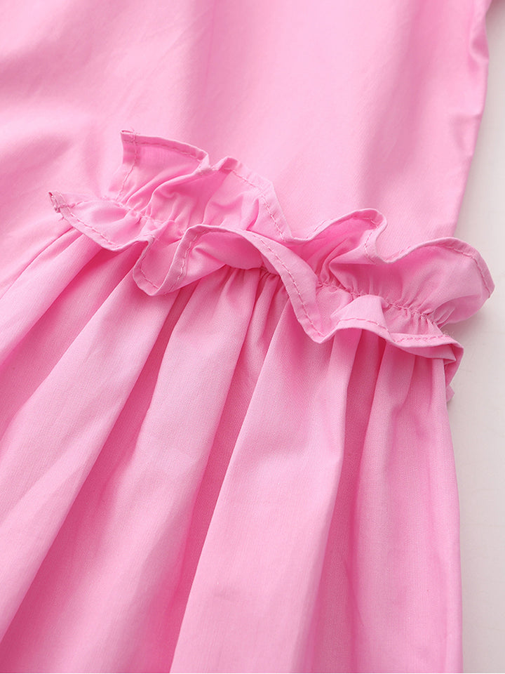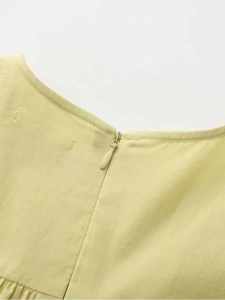 فستان بأكمام قصيرة ونمط بلون موحد ومزين بتفاصيل كشكش، يأتي بسحاب خلفي للإغلاق وياقة مدورة الشكل