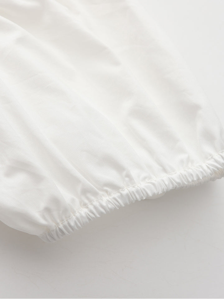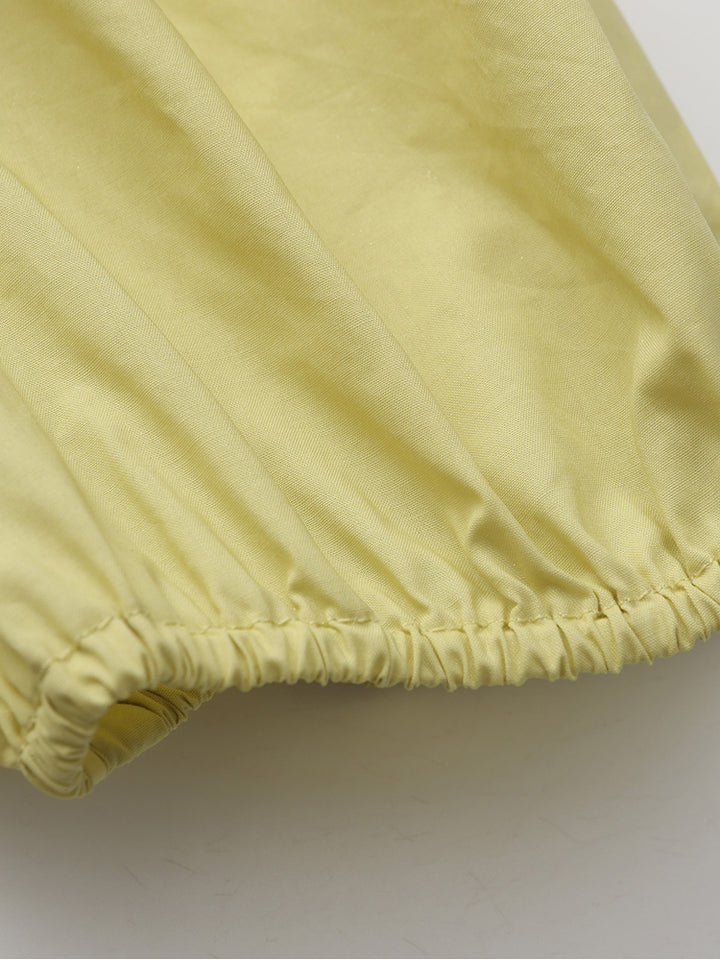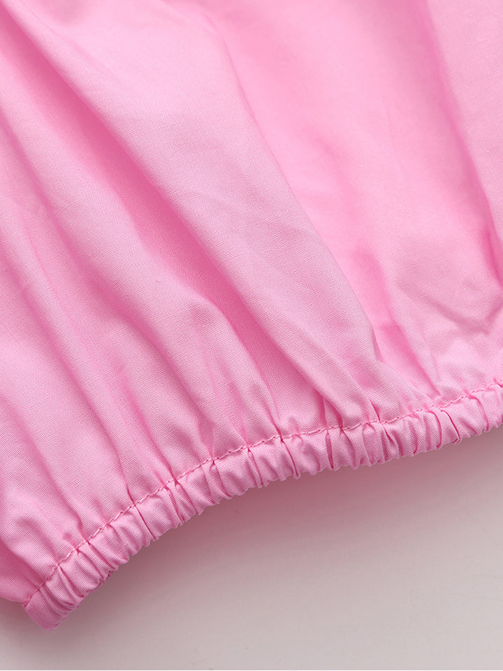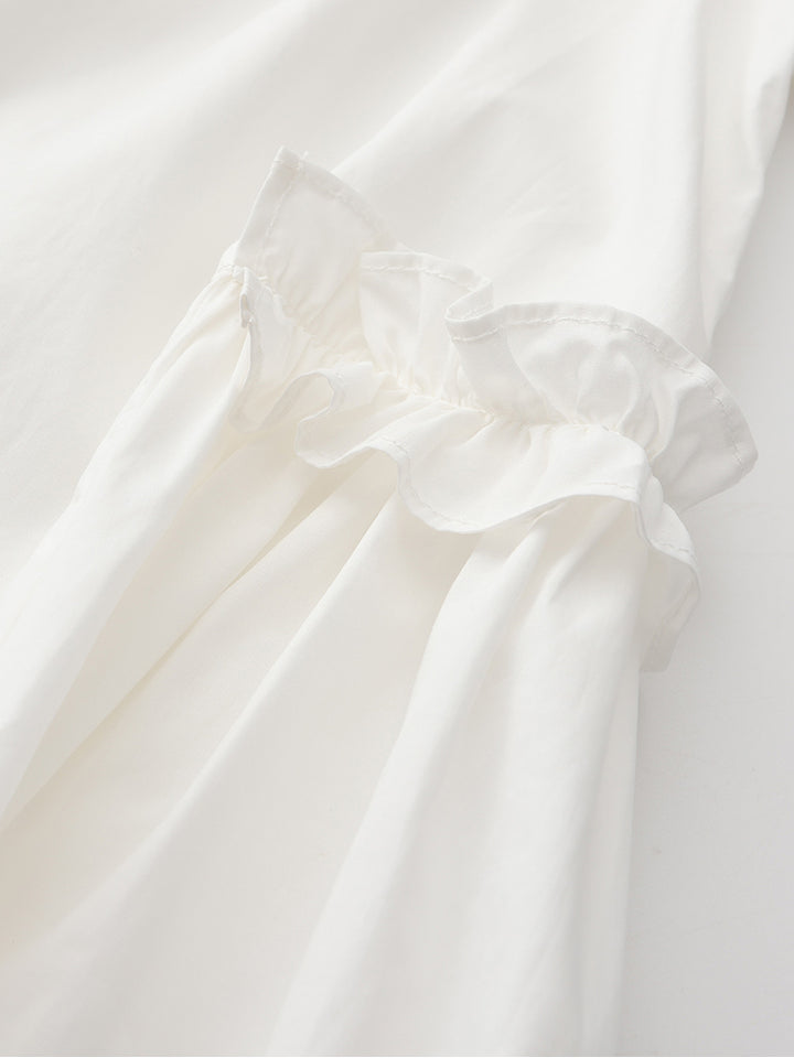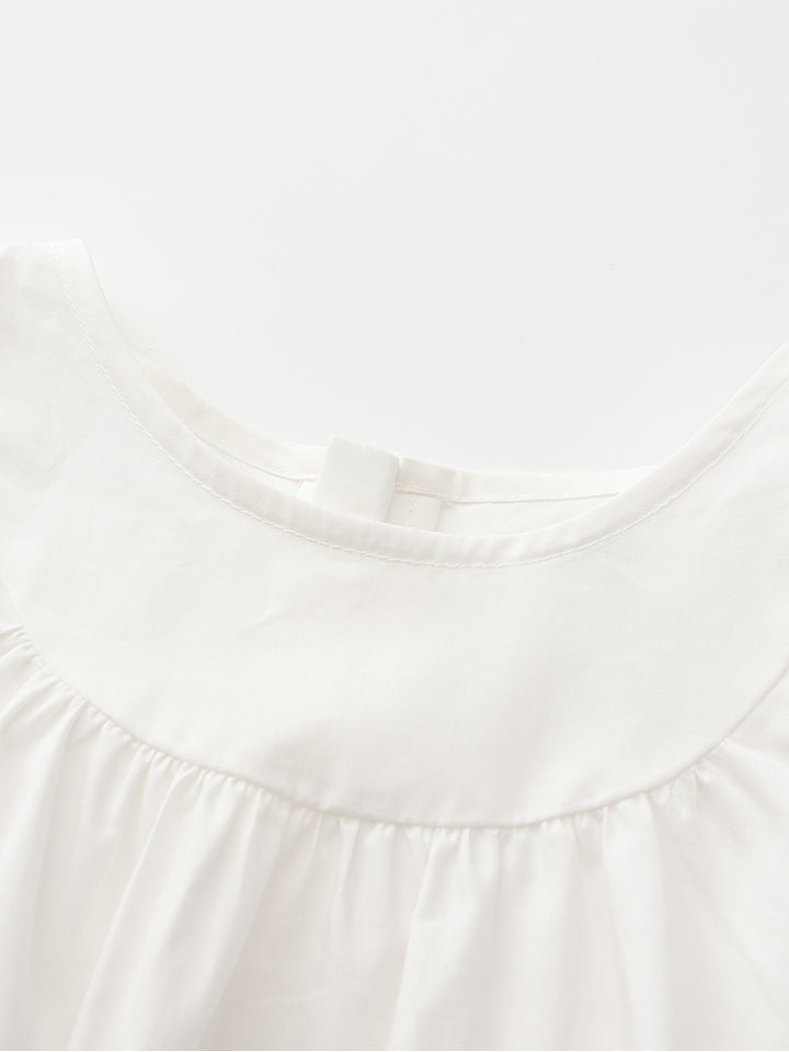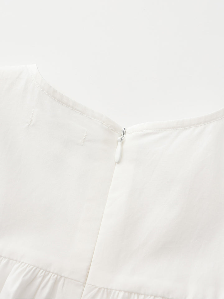 فستان بأكمام قصيرة ونمط بلون موحد ومزين بتفاصيل كشكش، يأتي بسحاب خلفي للإغلاق وياقة مدورة الشكل
