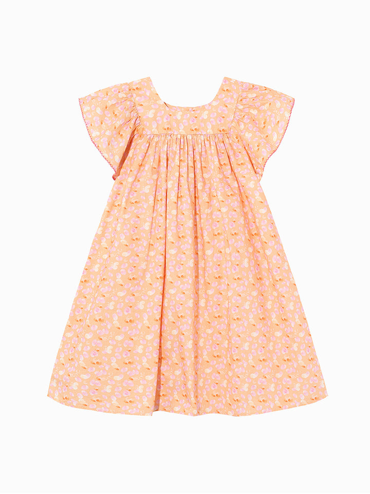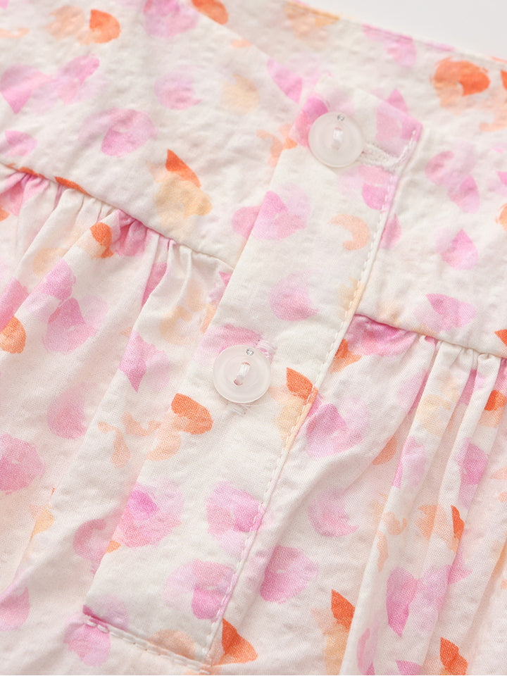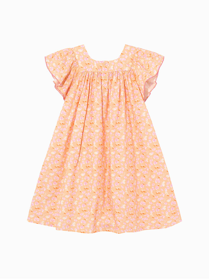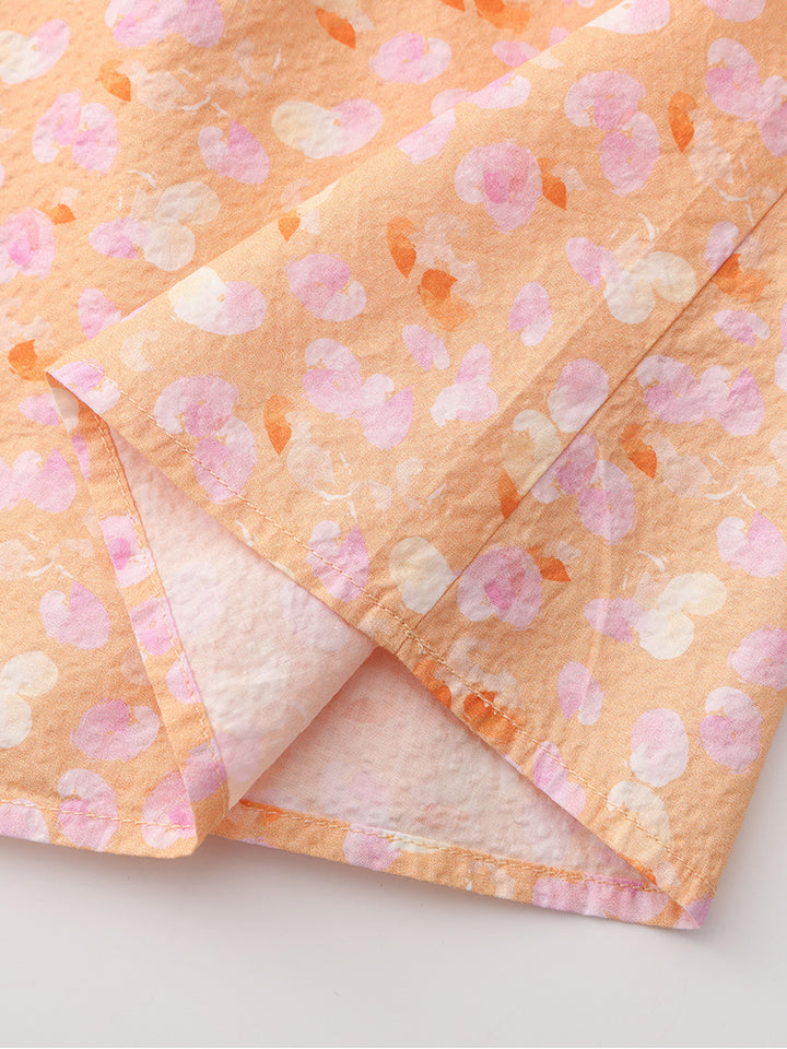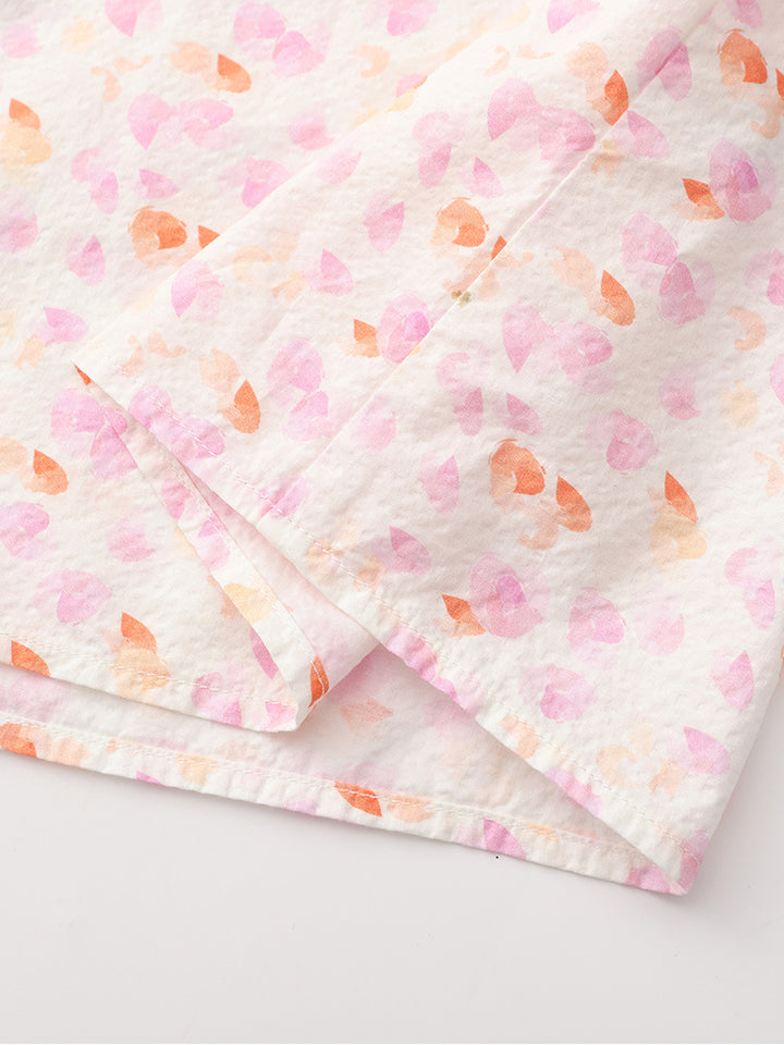 فستان بأكمام قصيرة مزين بنمط طبعات، يأتي بأزرار خلفية للإغلاق وياقة مستقيمة الشكل