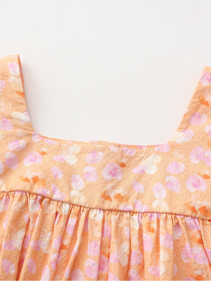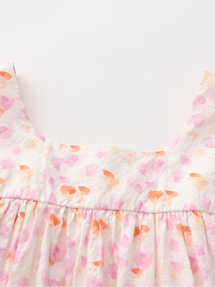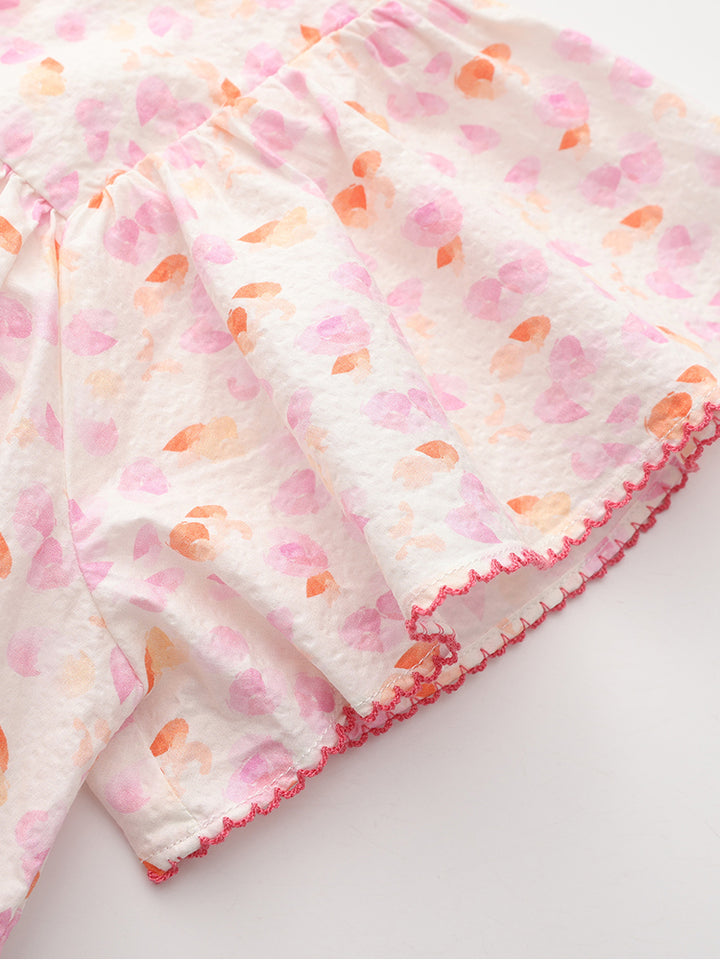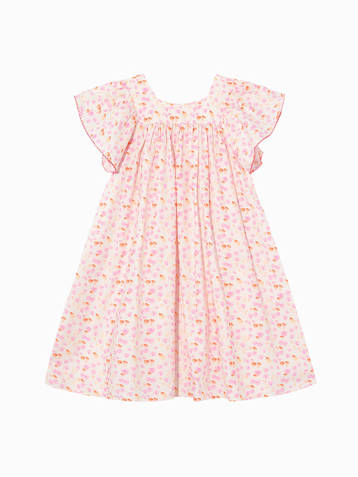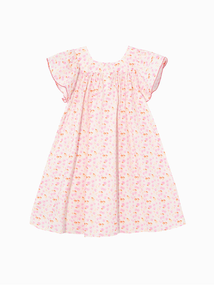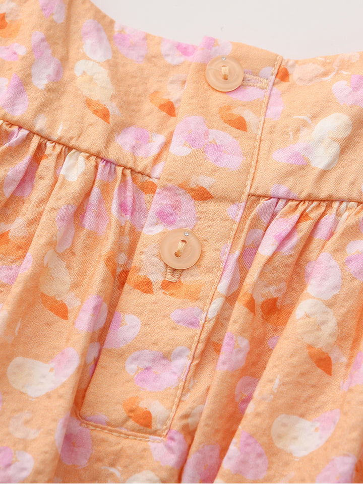 فستان بأكمام قصيرة مزين بنمط طبعات، يأتي بأزرار خلفية للإغلاق وياقة مستقيمة الشكل