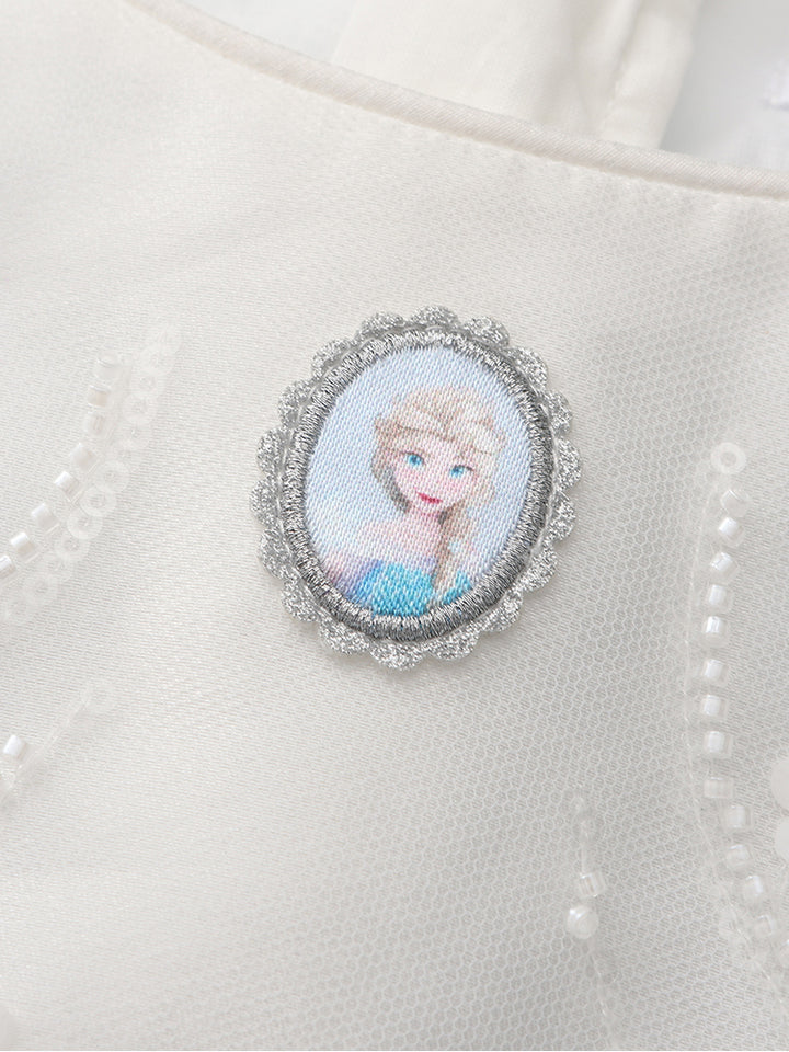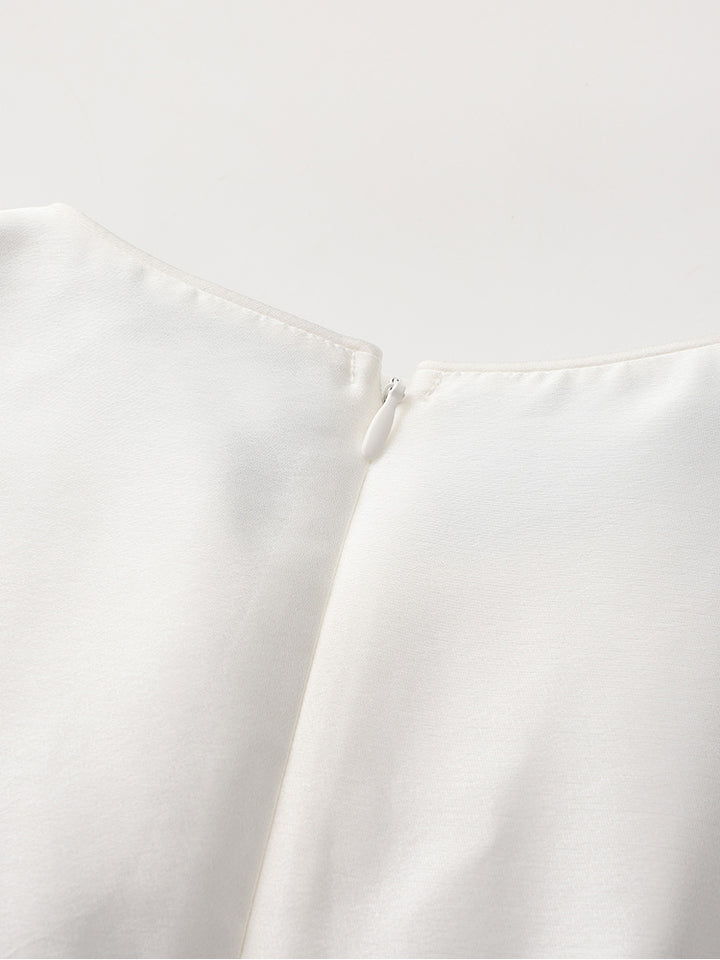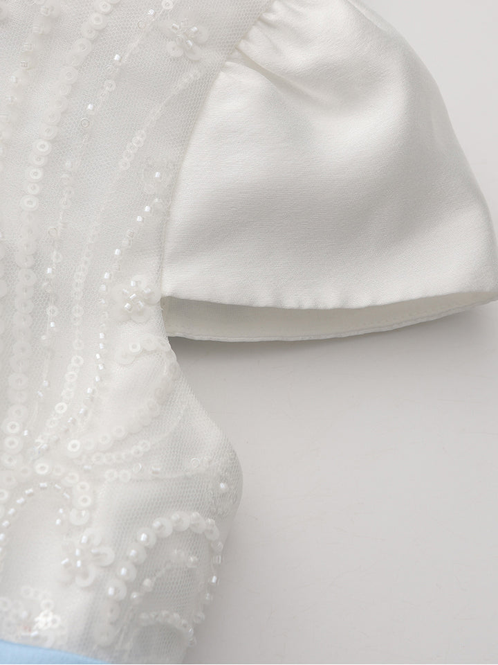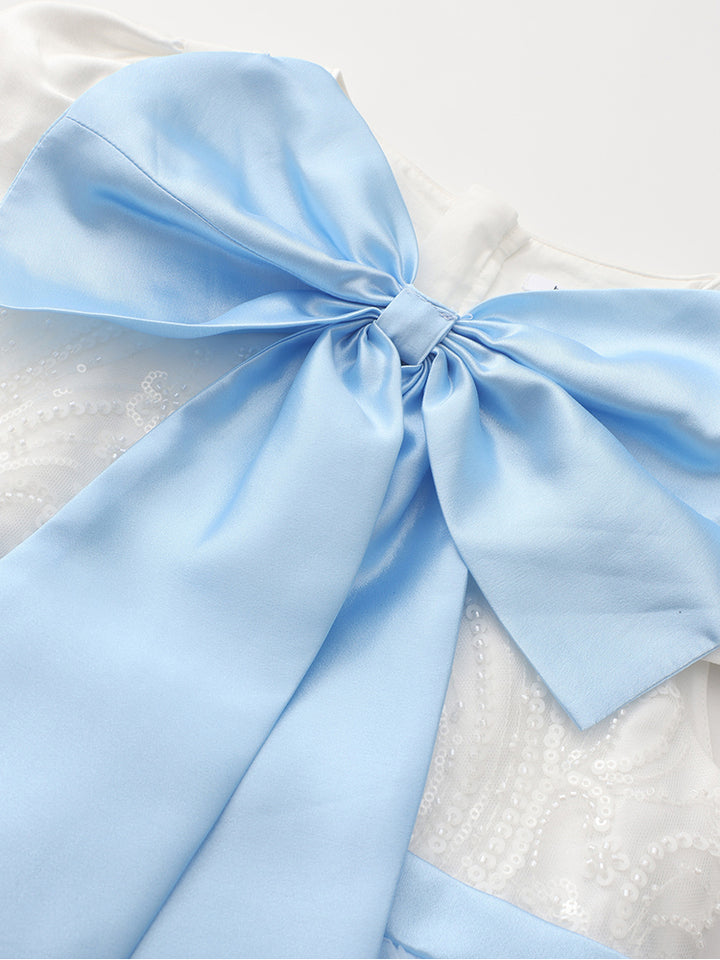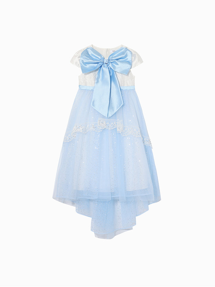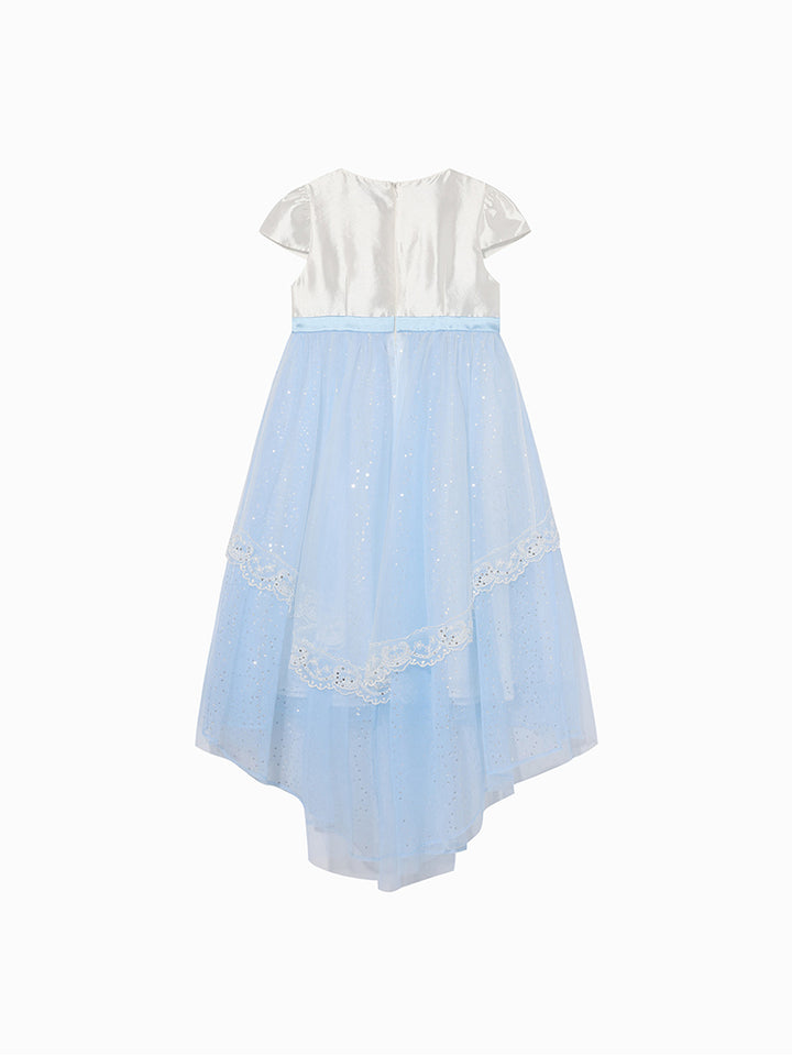 فستان بأكمام قصيرة يأتي بستايل متباين اللون والخامة، الجزء العلوي قماش ناعم والجزء السفلي تل مكشكش، يأتي بسحاب خلفي وياقة مدورة الشكل