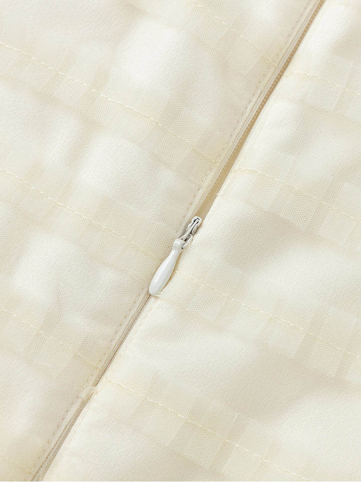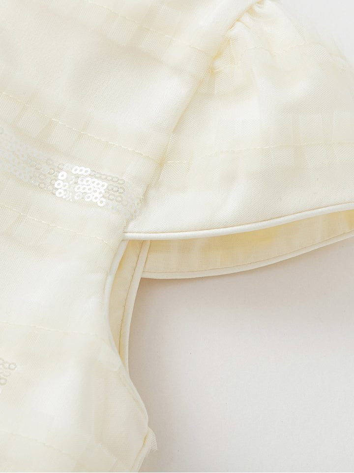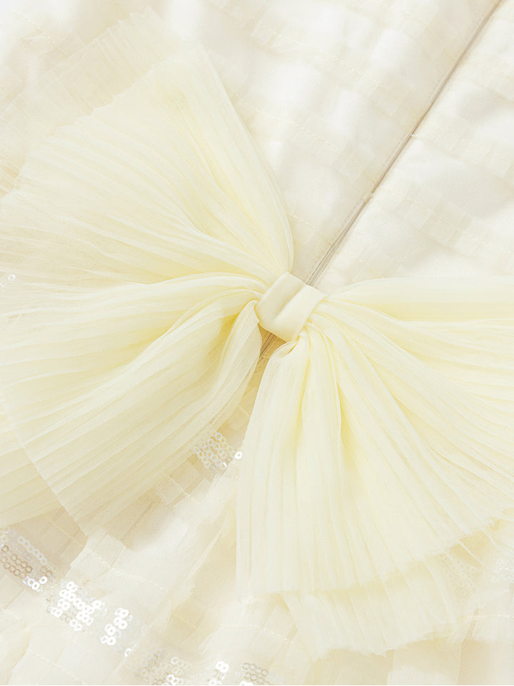 فستان فضفاض بأكمام قصيرة ونمط لون موحد، مزين بنمط خطوط بخامة تل وتفاصيل ترتر من نفس اللون وببيونة من الجهة الخلفية، يأتي بسحاب من الجهة الخلفية وبياقة مدورة الشكل
