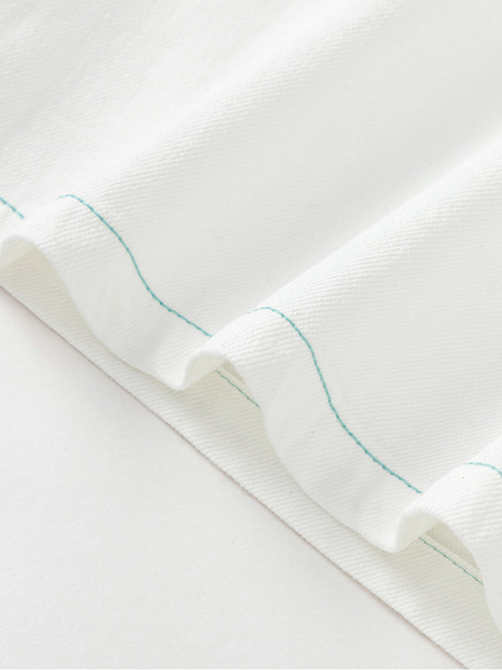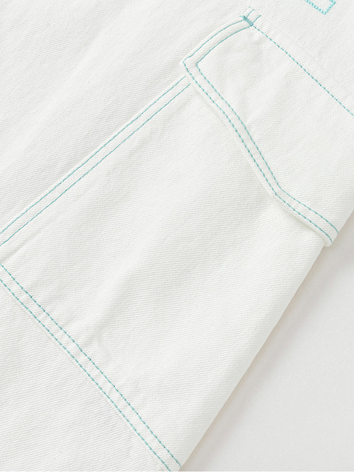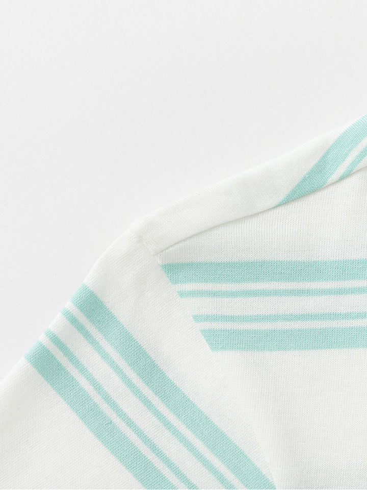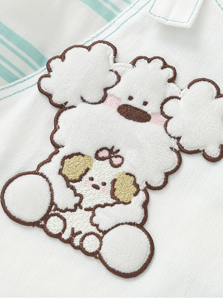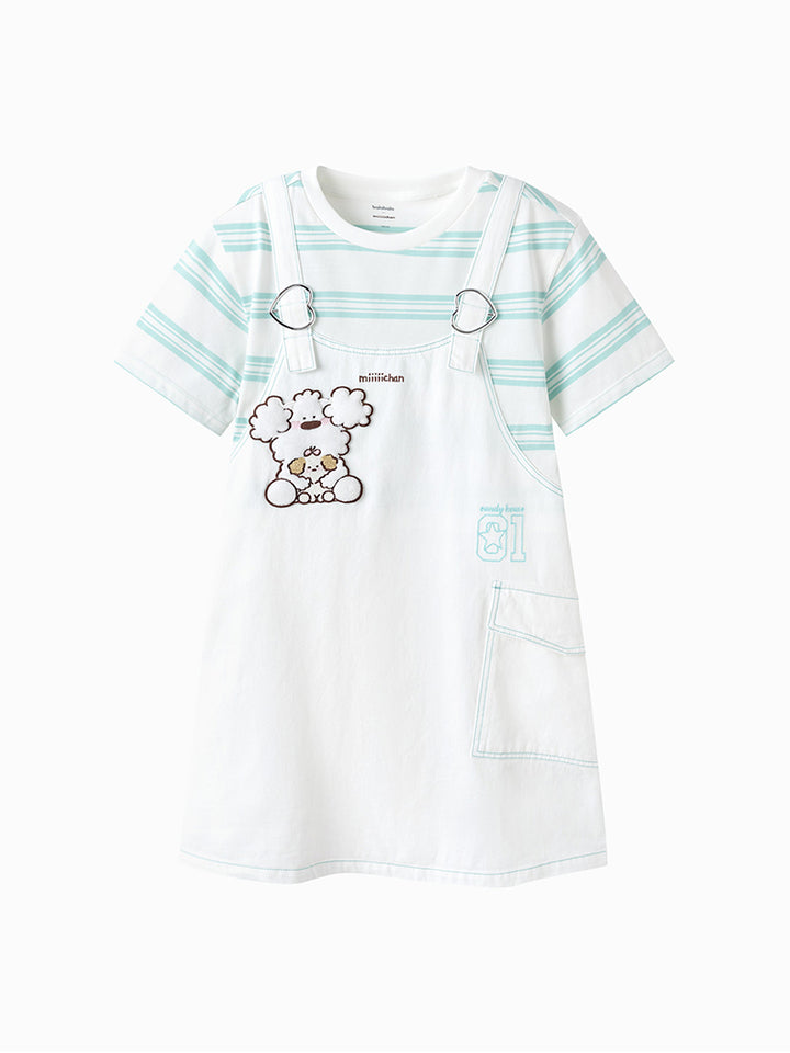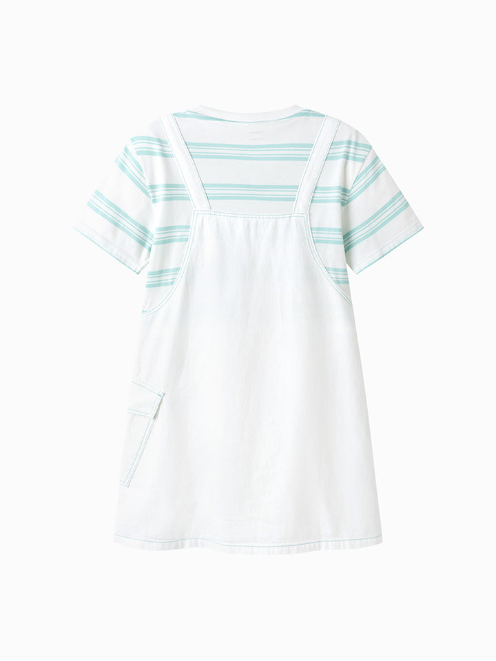 فستان جينز كاجوال بأكمام قصيرة وبتصميم متباين الخامة من الجهة العلوية على شكل تيشيرت بنمط مخطط ومن الجهة السفلية خامة جينز بحمالات كتف ومزين بتطريز من الجهة الأمامية، يأتي بجيب جانبي وبياقة مدورة الشكل
