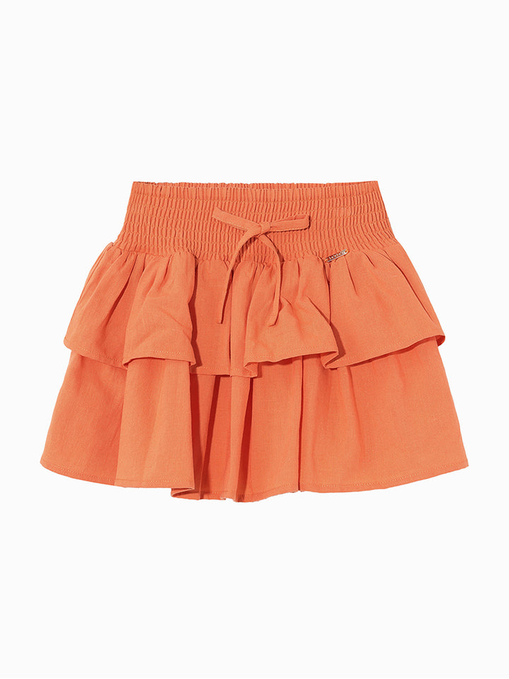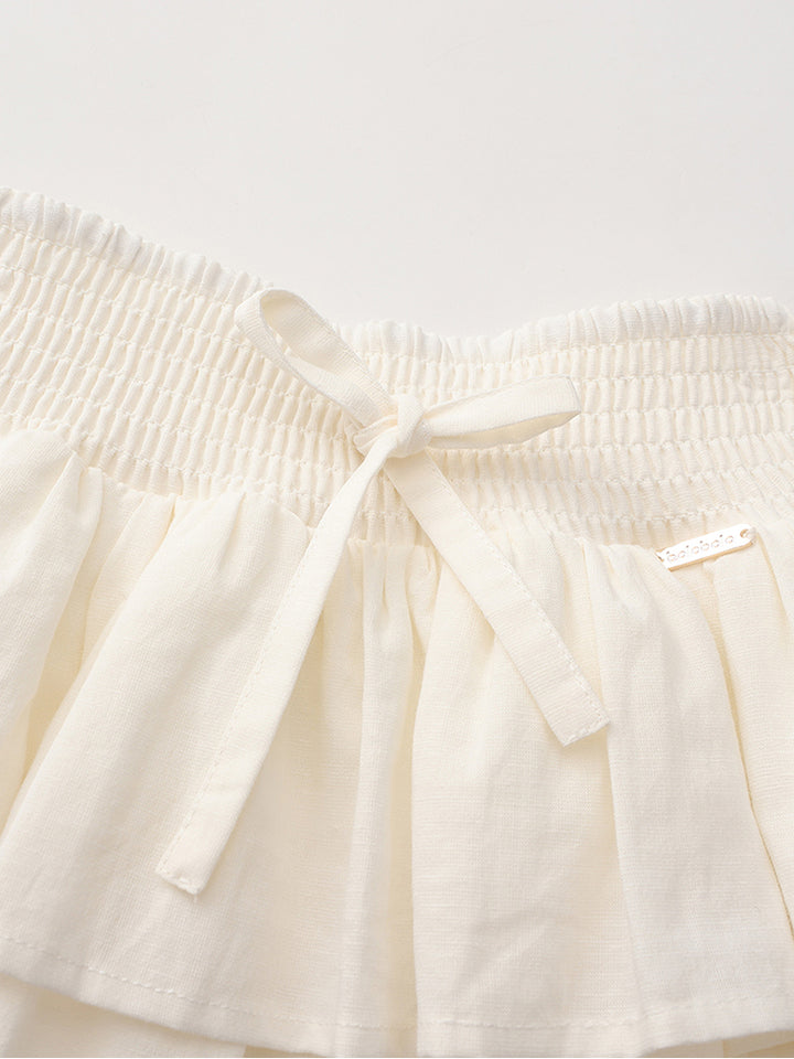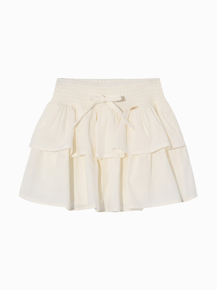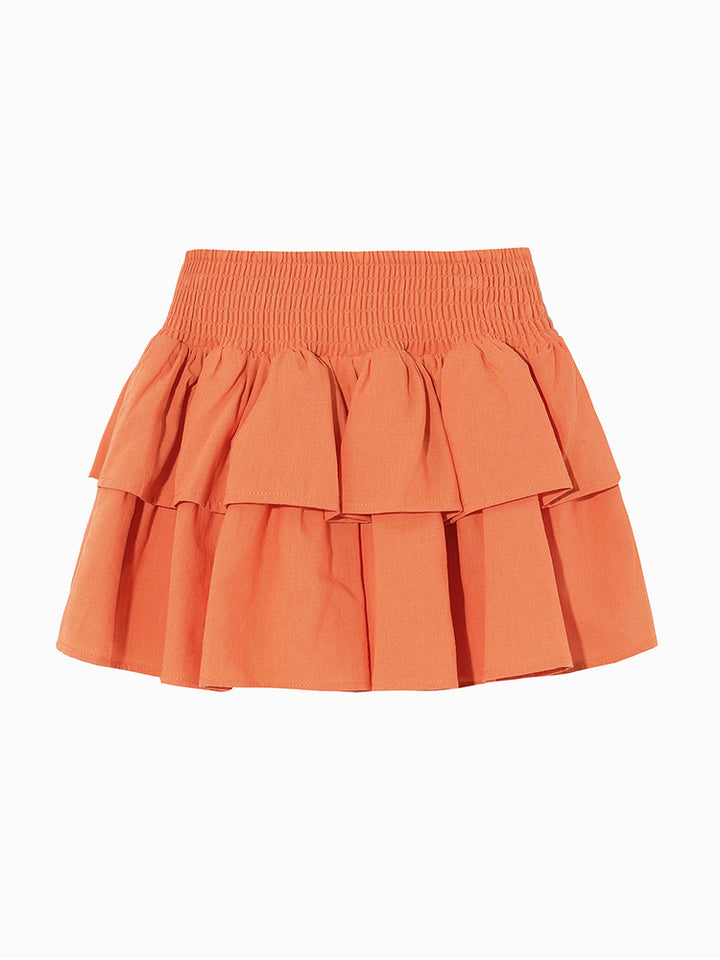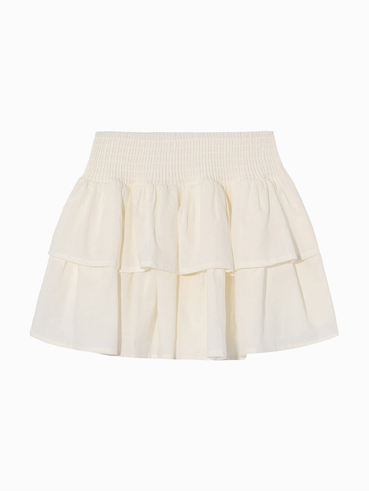 تنورة قصيرة بنمط لون موحد، مزينة بنمط طبقات مكشكشة وتأتي بخصر مطاطي مريح