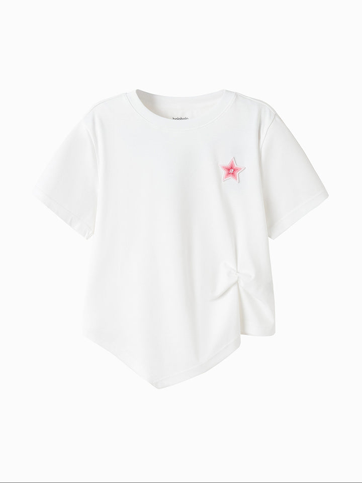تيشيرت أطفال عصري بأكمام قصيرة وتصميم غير متماثل، مع شارة تطريز أنيقة في الأمام. يتميز بياقة دائرية مريحة، مما يجعله إضافة رائعة لملابسهم اليومية