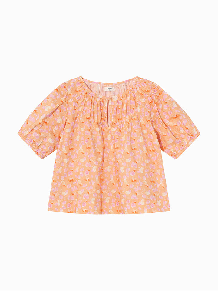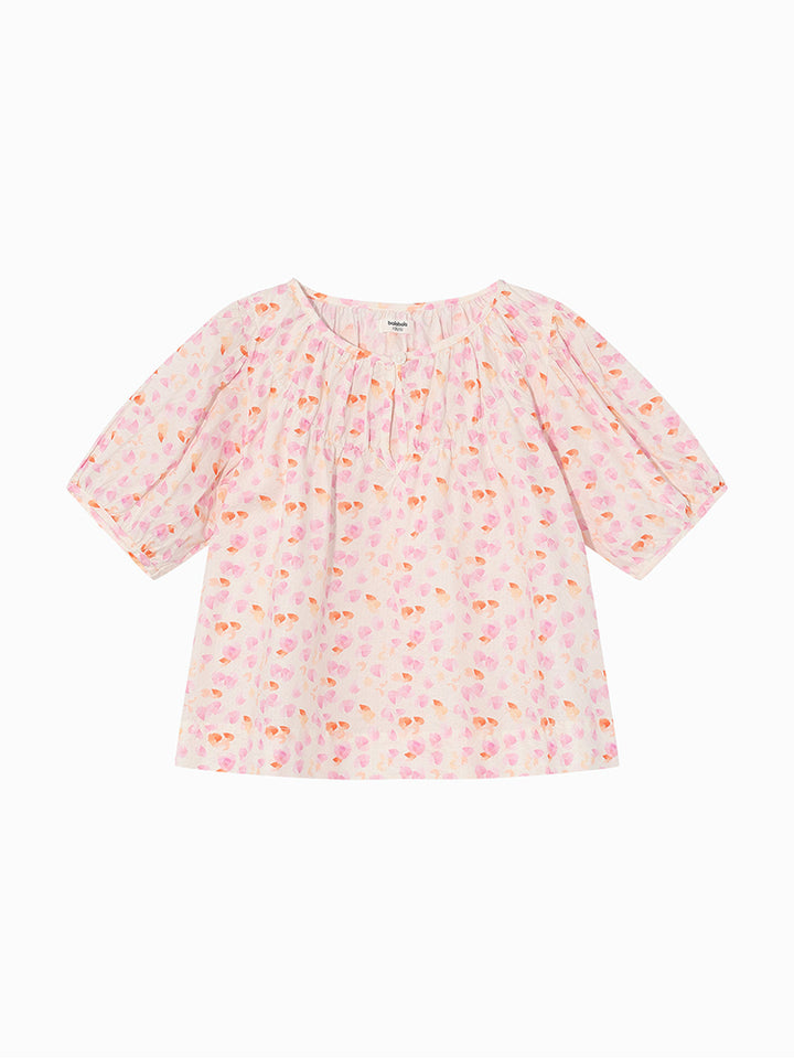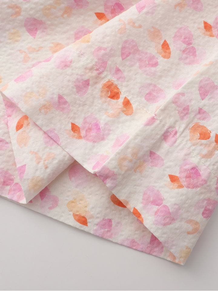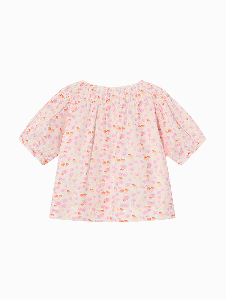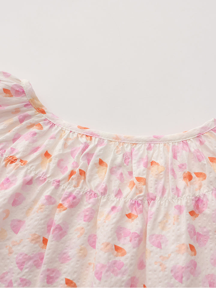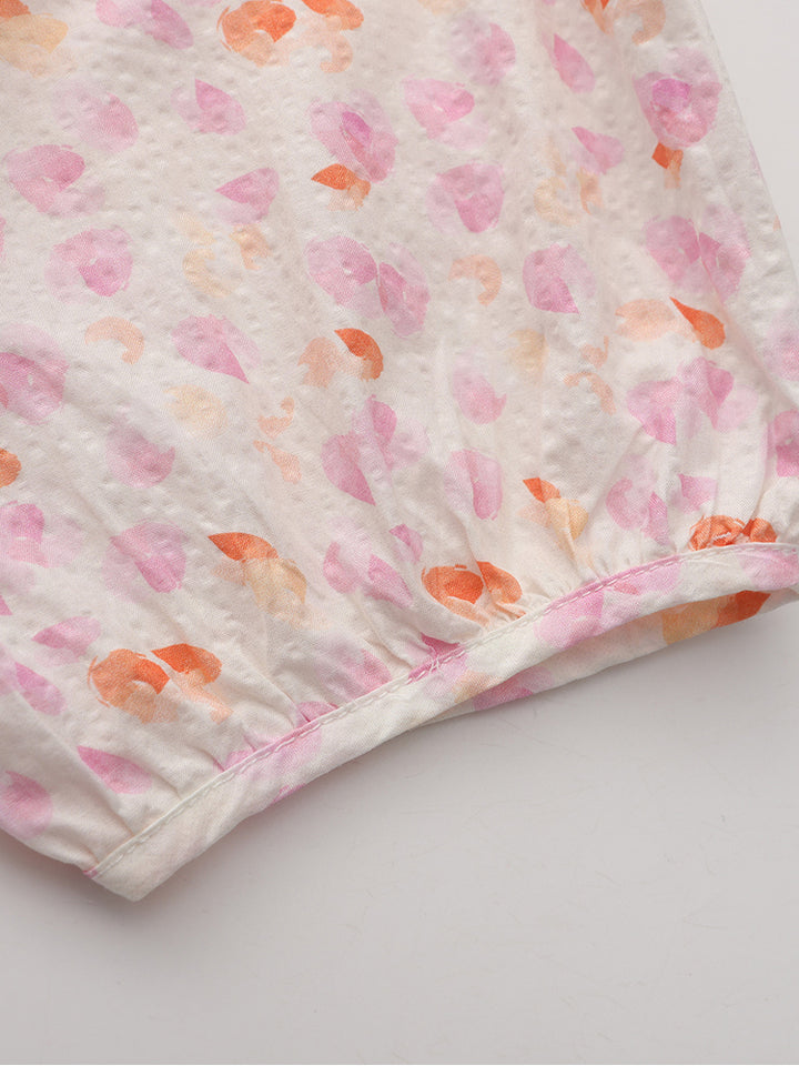 بلوزة بأكمام قصيرة مزينة بنمط طبعات، تأتي بزر خلفي للإغلاق وبياقة مدورة الشكل