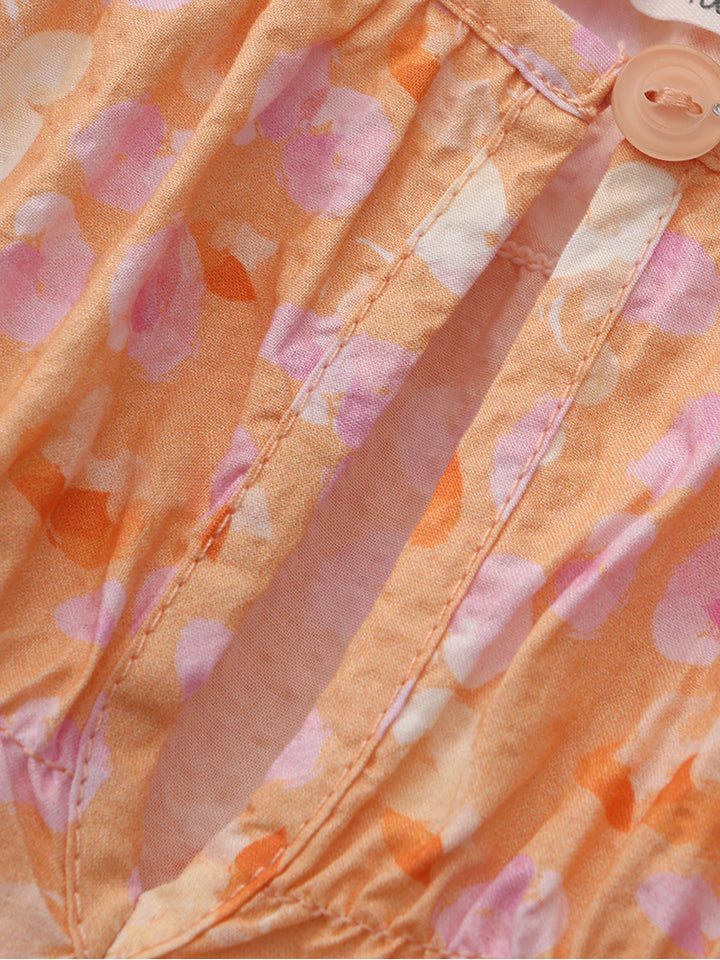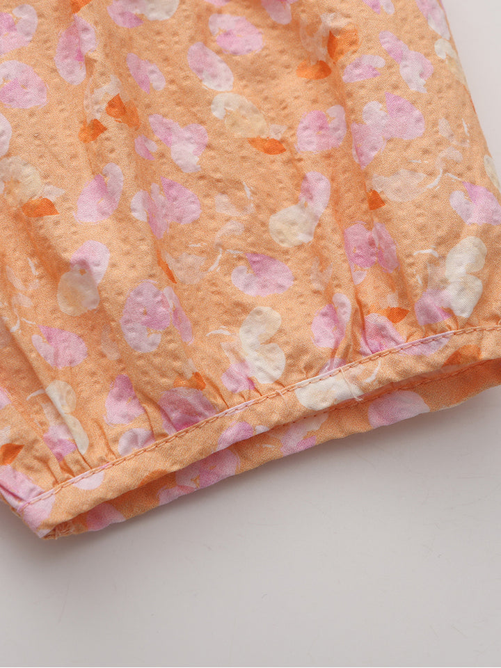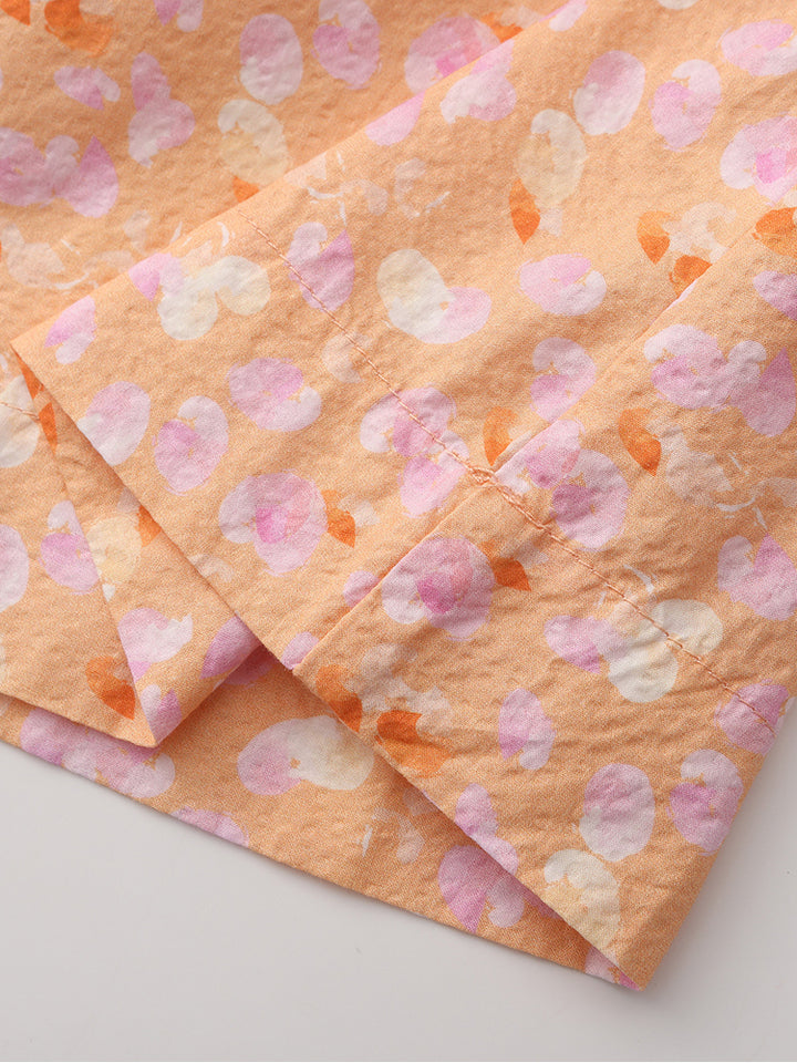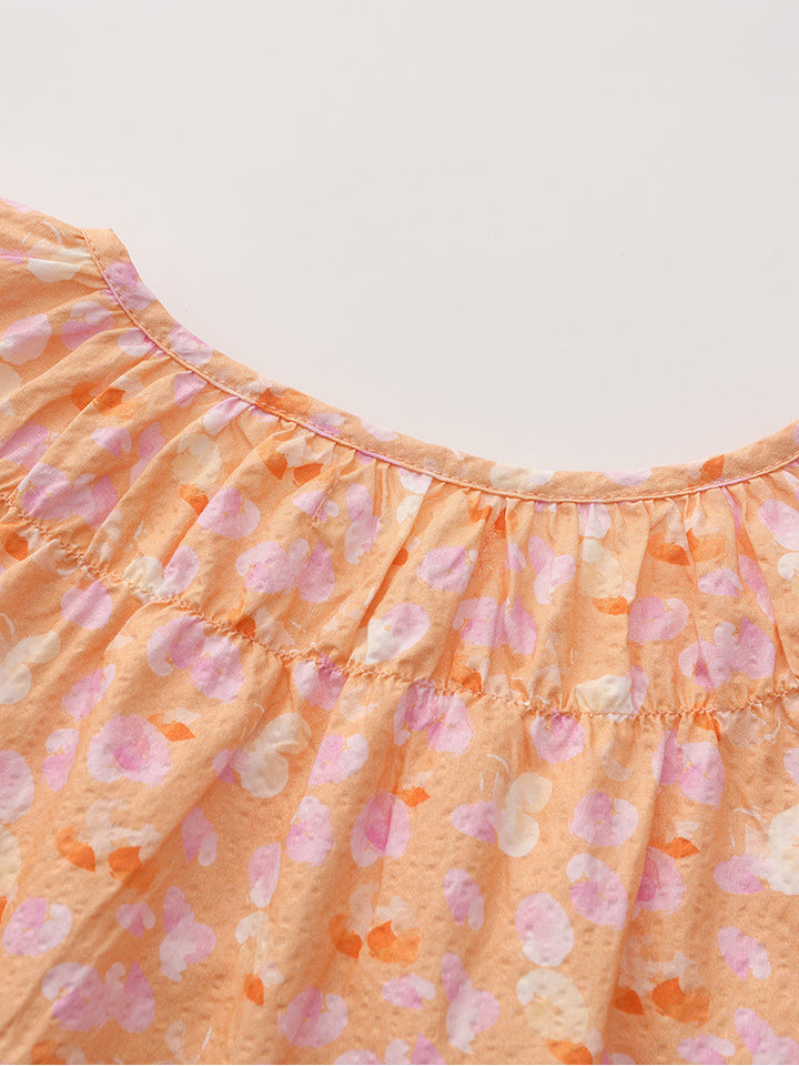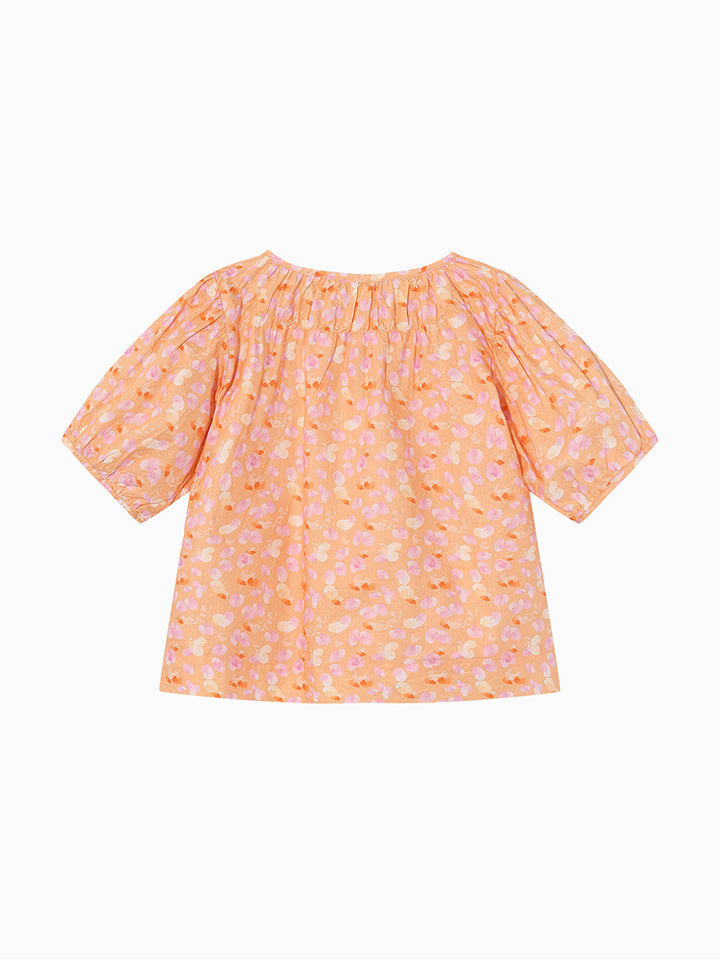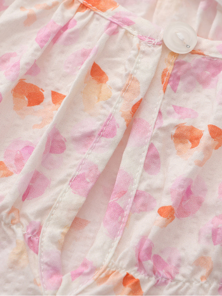 بلوزة بأكمام قصيرة مزينة بنمط طبعات، تأتي بزر خلفي للإغلاق وبياقة مدورة الشكل