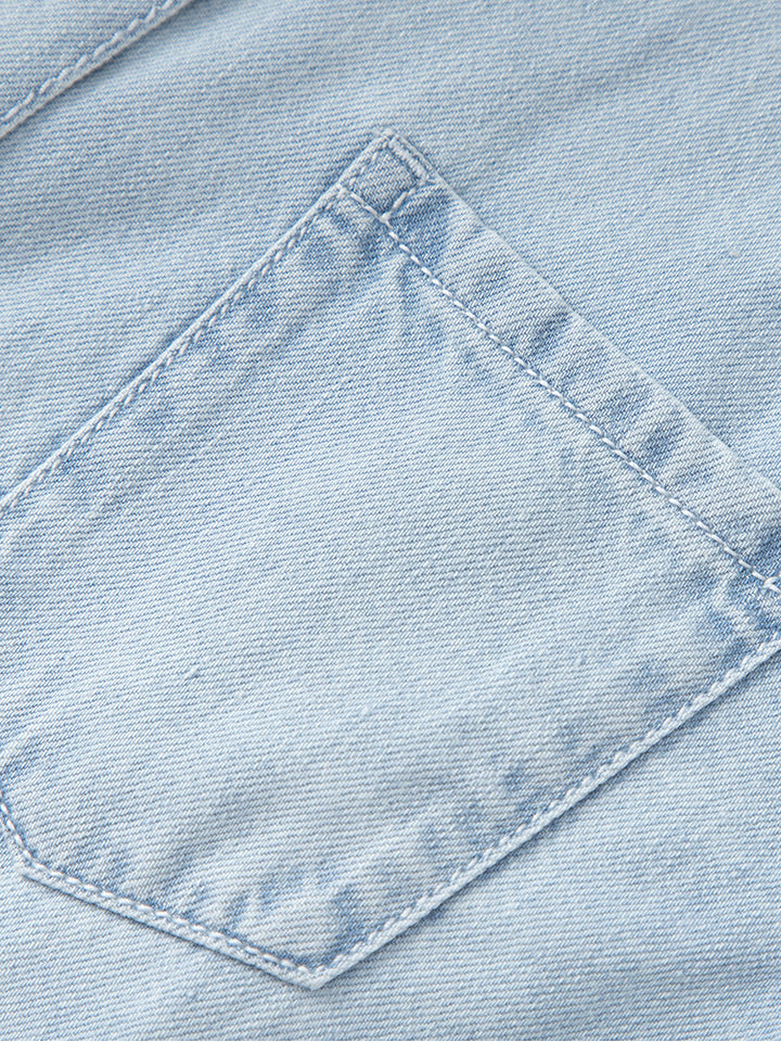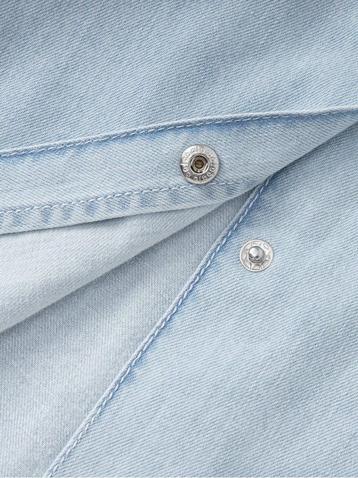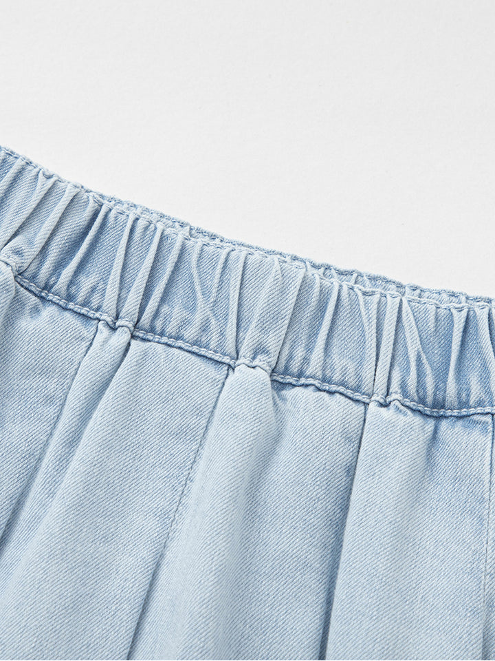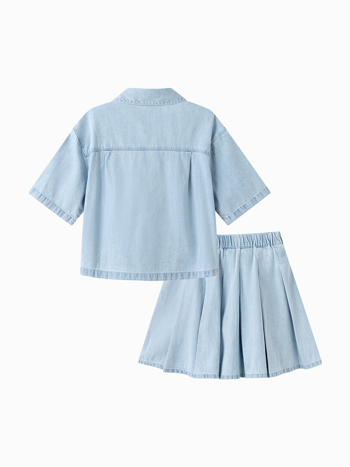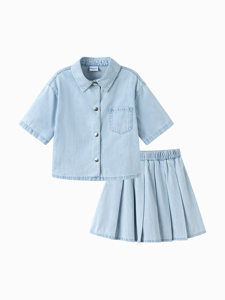 طقم بناتي مكون من قطعتين، قميص جينز بأكمام قصيرة ونمط لون موحد، يأتي بجيب أمامي، أزرار من الجهة الأمامية وياقة كلاسيكية مطوية، وتنورة قصيرة بنمط لون موحد سادة مزينة بنمط كسرات، تأتي بخصر مطاطي مريح وسروال تحتي