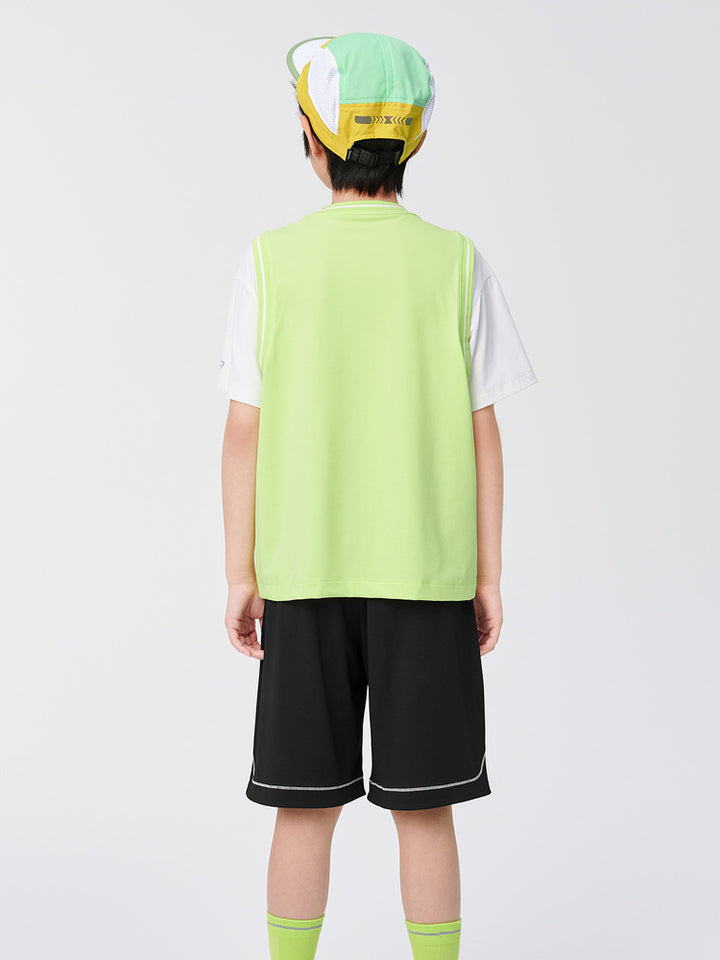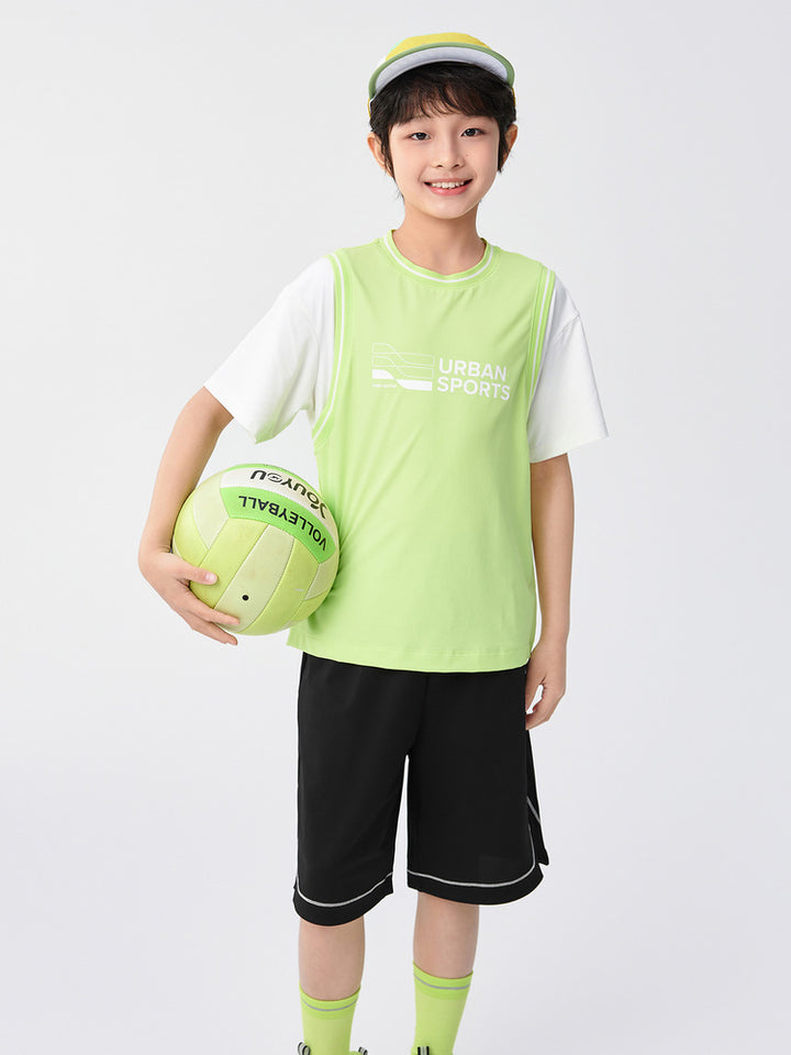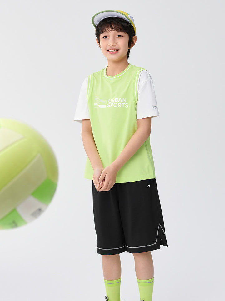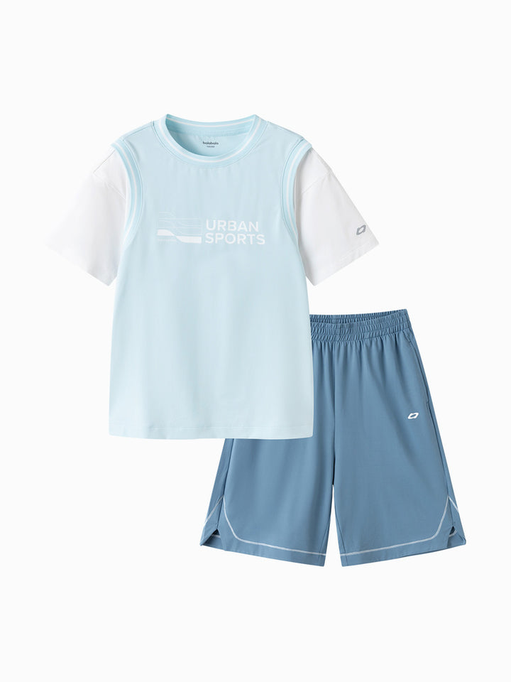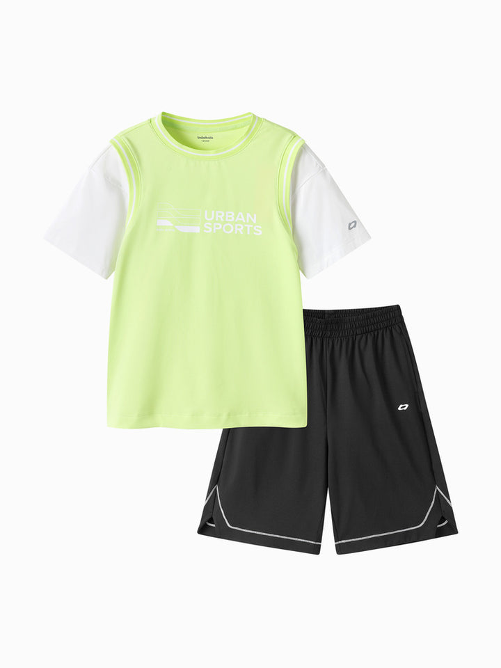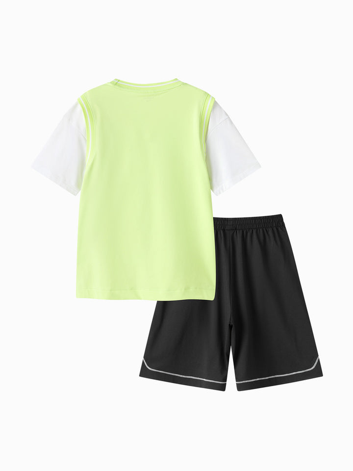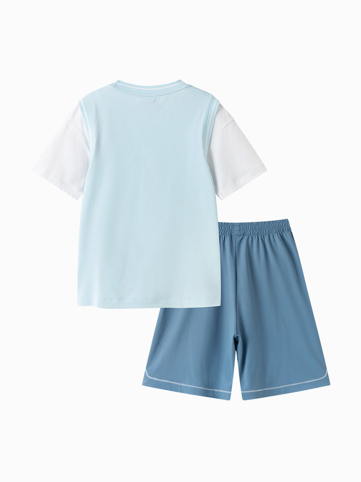طقم ولادي مكون من قطعتين: تيشيرت بأكمام قصيرة بلون متباين وطبعة أمامية وياقة مدورة، وشورت بخطوط رفيعة وطبعة صغيرة مع جيوب وخصر مطاطي لراحة مثالية.