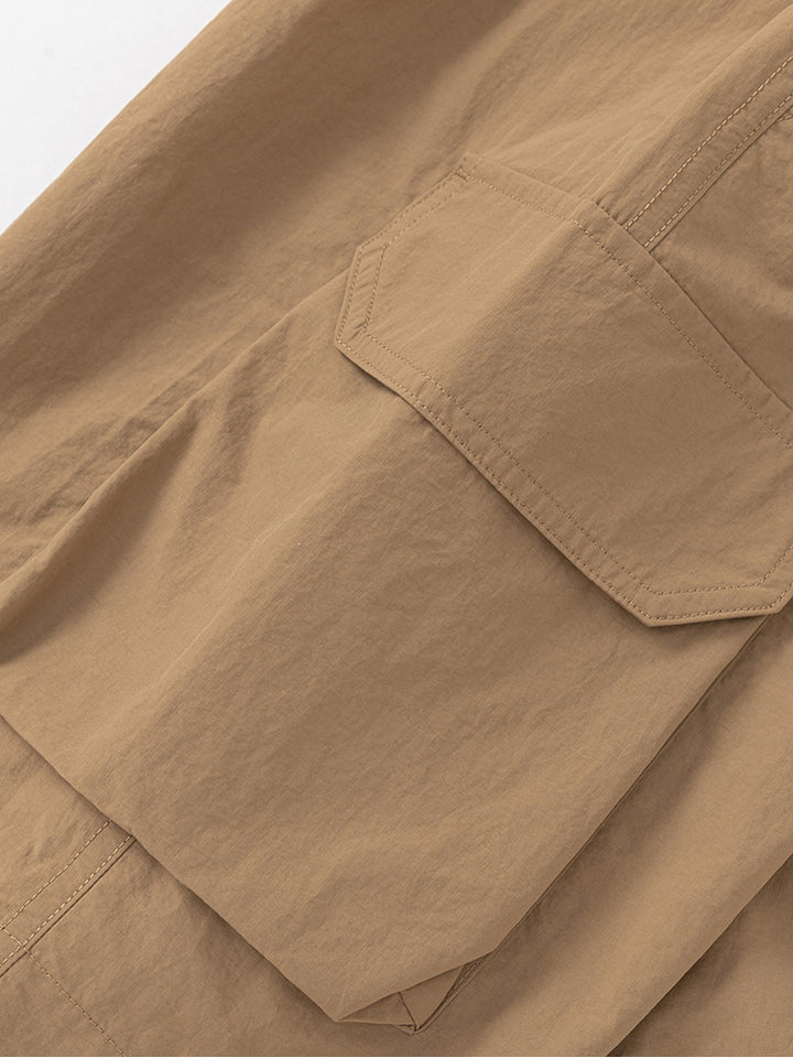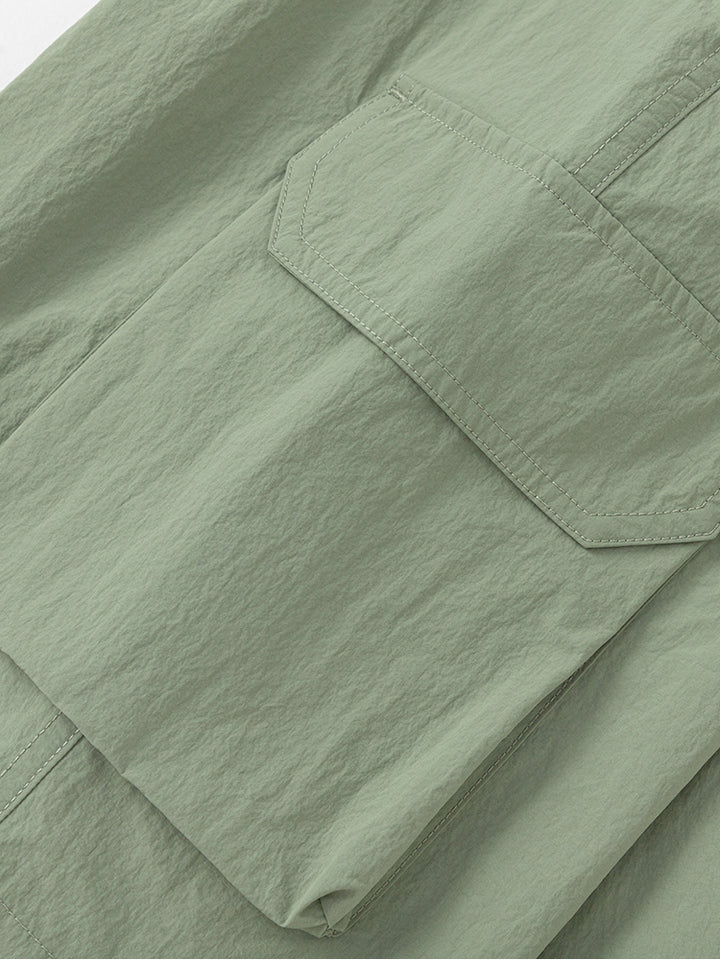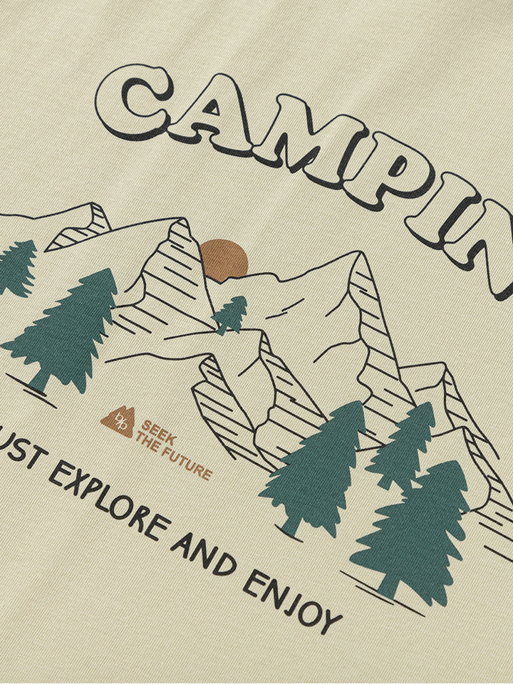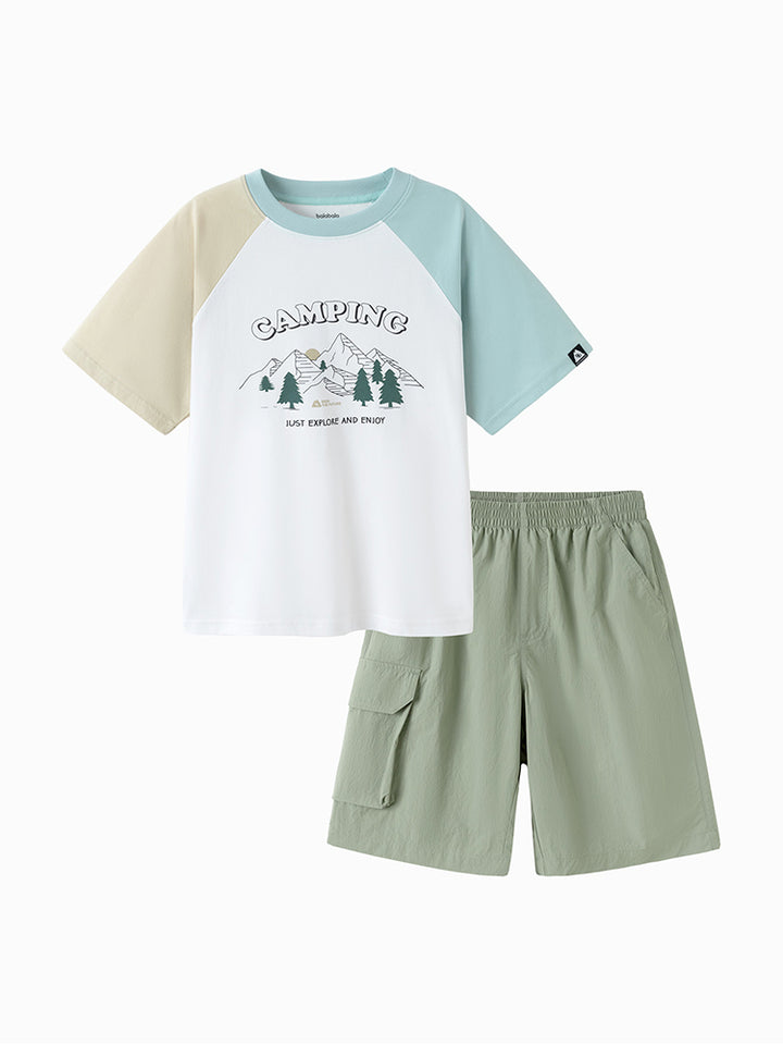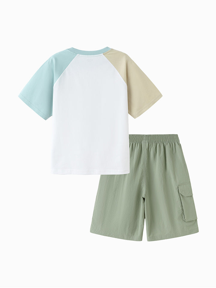 طقم ولادي مكون من قطعتين، تيشيرت كاجوال بأكمام قصيرة مزين بأكمام متباينة اللون وطبعة من الجهة الأمامية، يأتي بياقة مدورة الشكل، وشورت بنمط لون موحد سادة، يأتي بجيوب أمامية وجيب قلاب على جانب أحد الساقين وبخصر مطاطي مريح