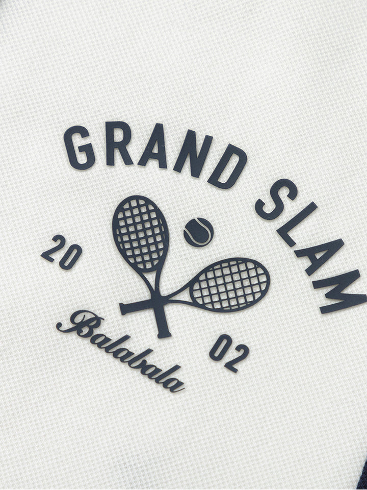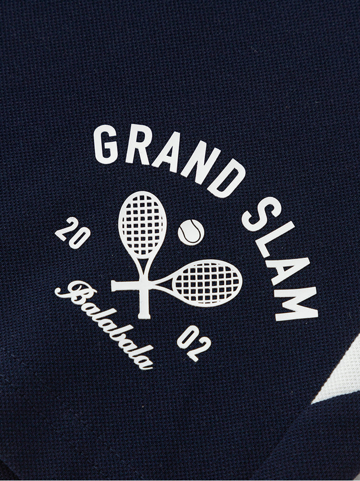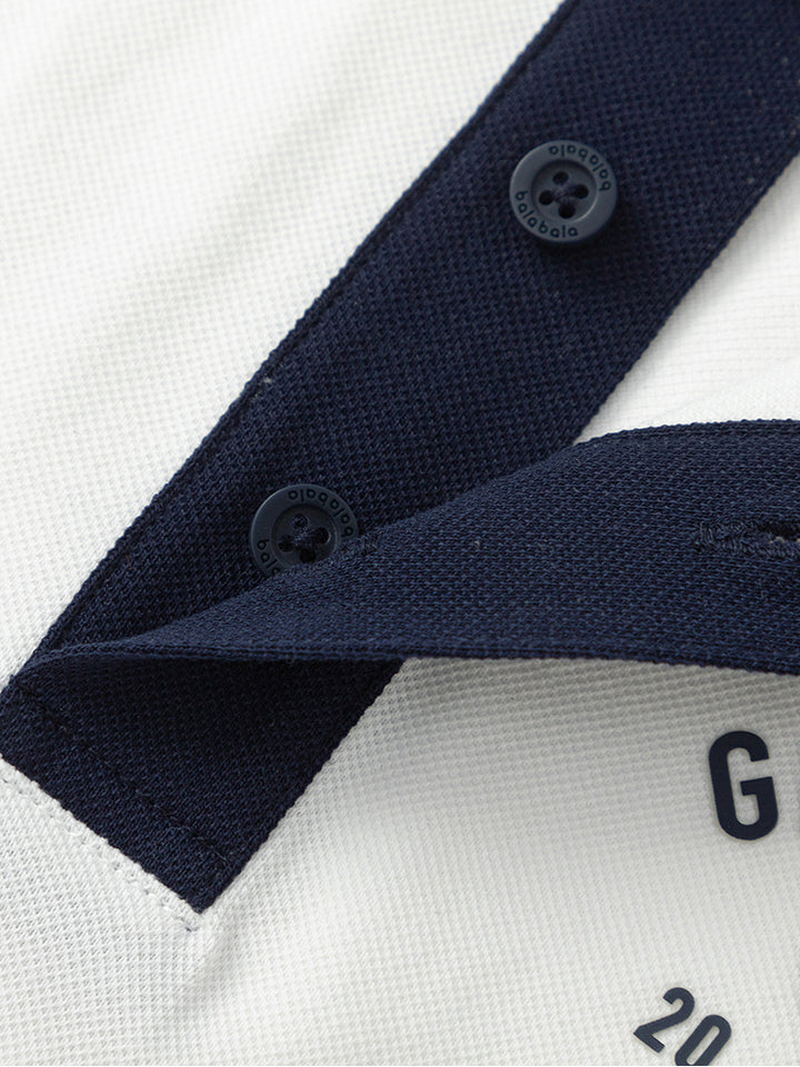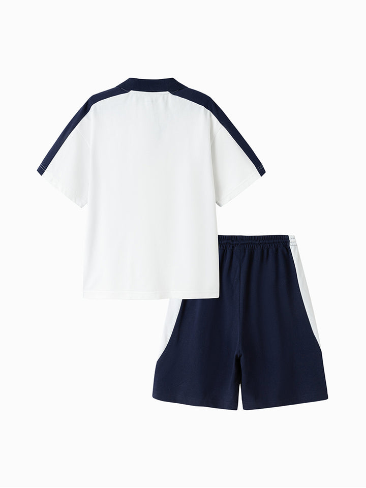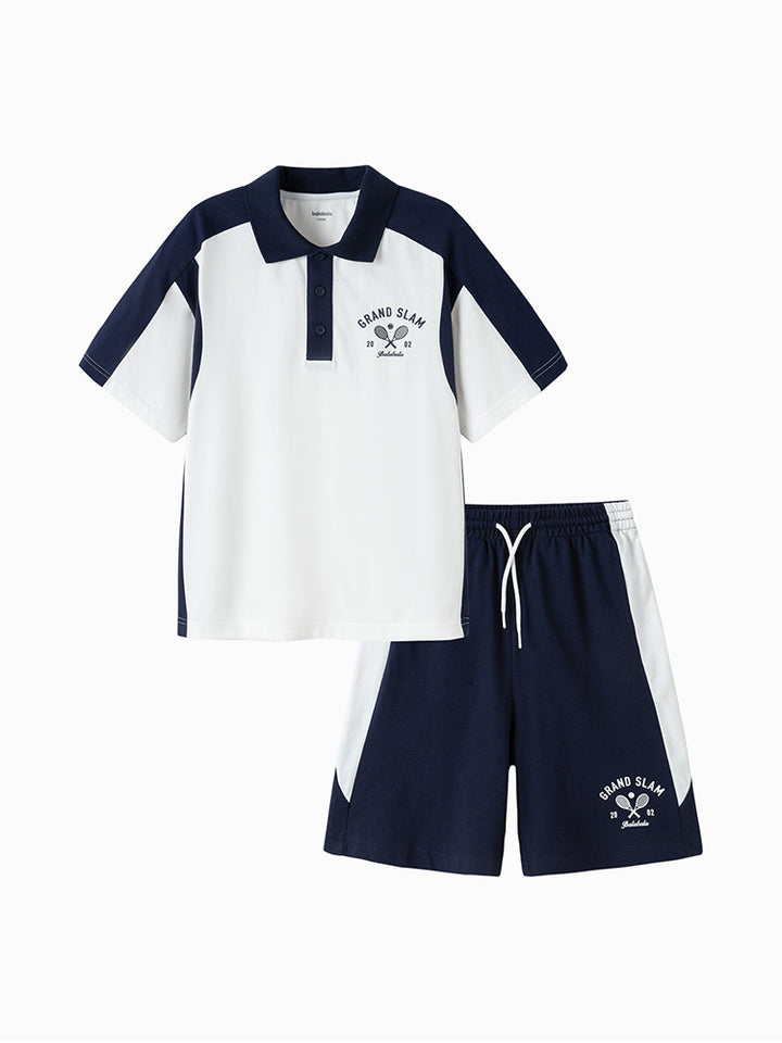 طقم ولادي مكون من قطعتين، تيشيرت بولو كاجوال بأكمام قصيرة مزين بتفاصيل متباينة اللون وطبعة من الجهة الأمامية، يأتي بأزرار أمامية وبياقة كلاسيكية مطوية، وشورت بنمط متباين اللون ومزين بطبعة على أحد الساقين من الجهة الأمامية، يأتي بجيوب أمامية، خصر مطاطي مريح ورباط قابل للتعديل على الخصر