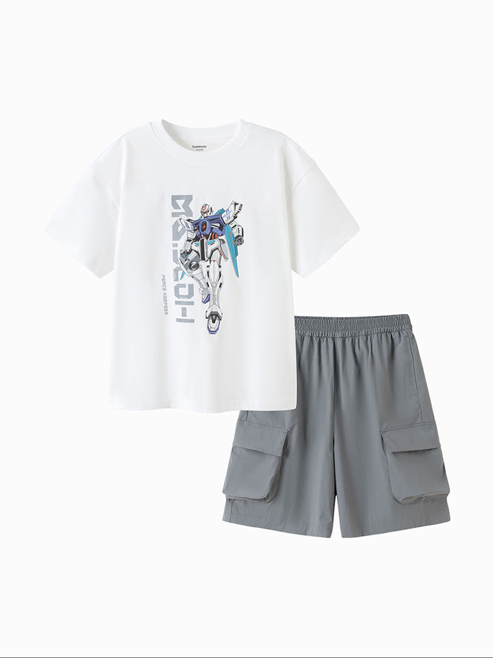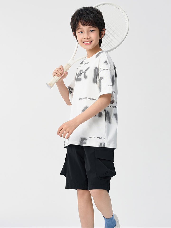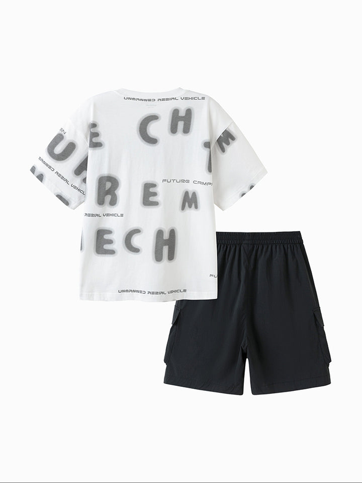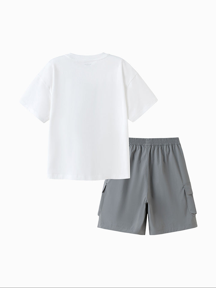 يتضمن هذا الطقم الأنيق تي شيرت بأكمام قصيرة ونقش مطبوع كامل مع ياقة دائرية، بالإضافة إلى شورت بتصميم بلون موحد مع جيوب جانبية بغطاء، وحزام مرن للراحة التامة. مثالي للنزهات أو أوقات اللعب، يجمع هذا الطقم بين الأناقة والعملية