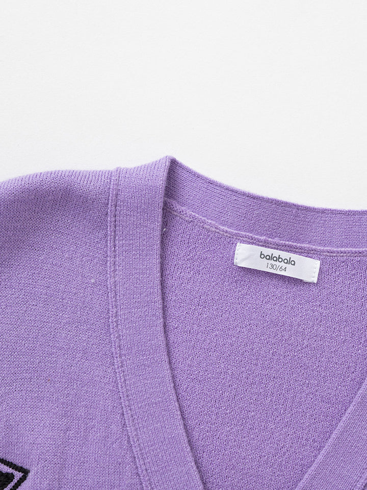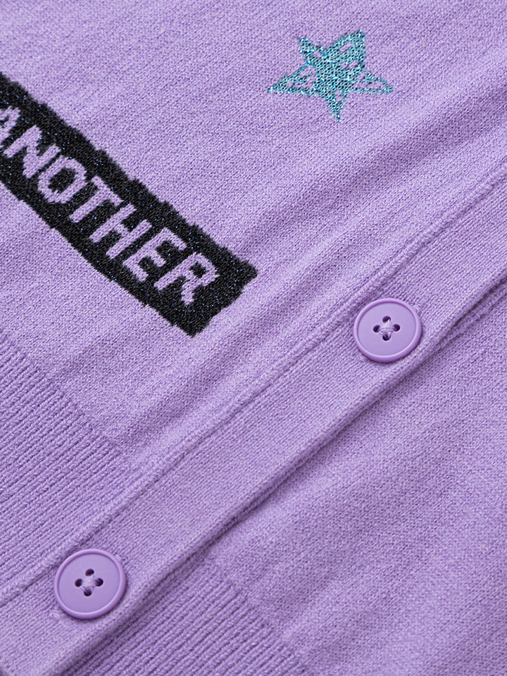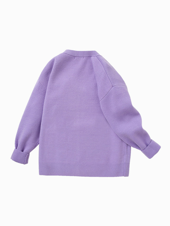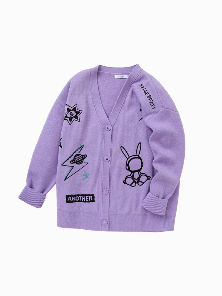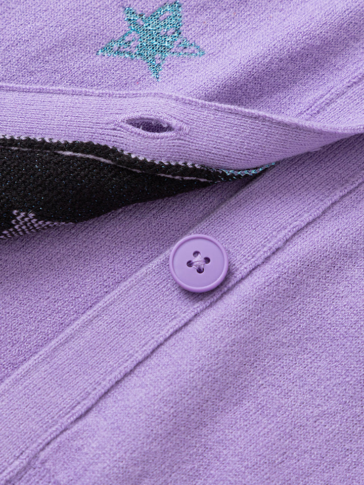 جاكيت كارديغان بأكمام طويلة وبنسيج صوف محبوك، مزين بطبع متعددة من الجهة الأمامية، يأتي بأزرار للإغلاق من الجهة الأمامية وبياقة على شكل V