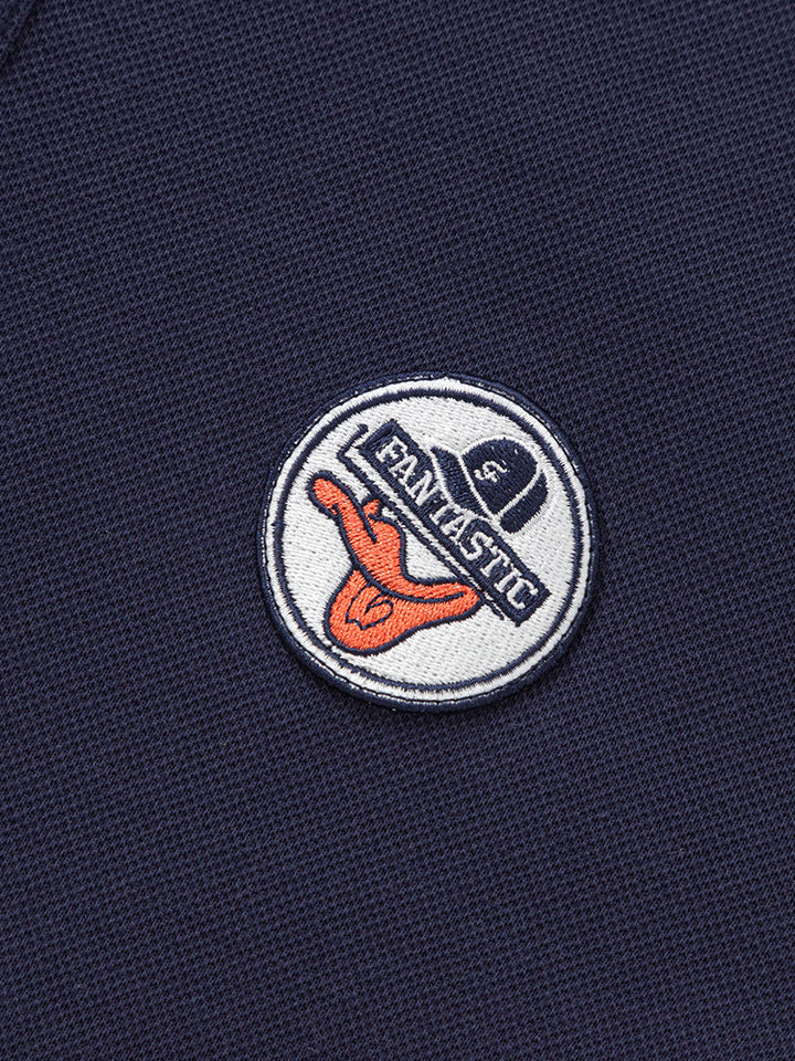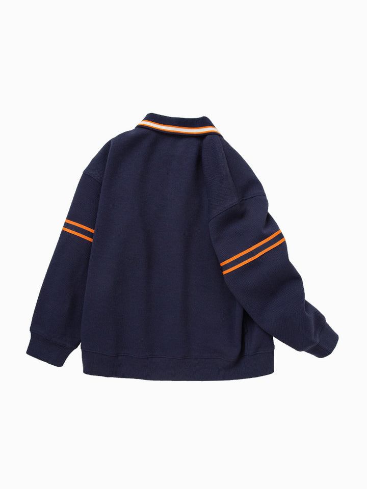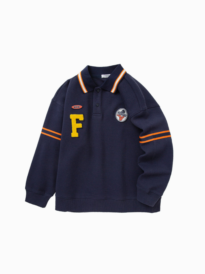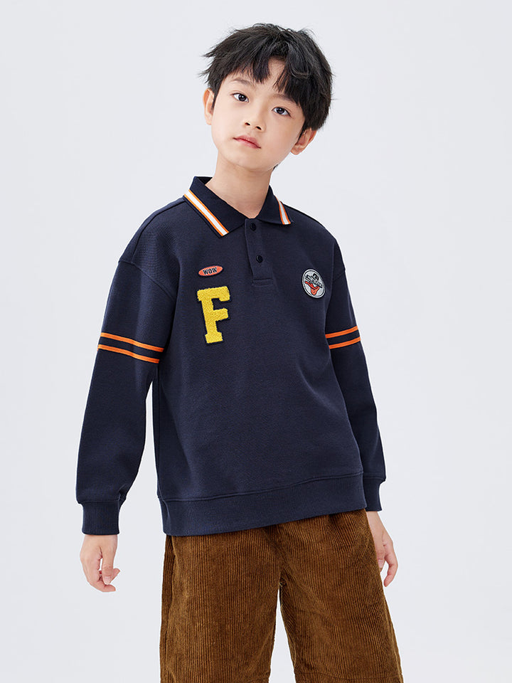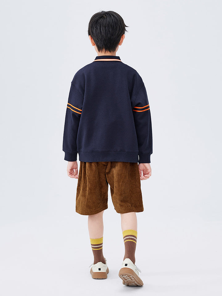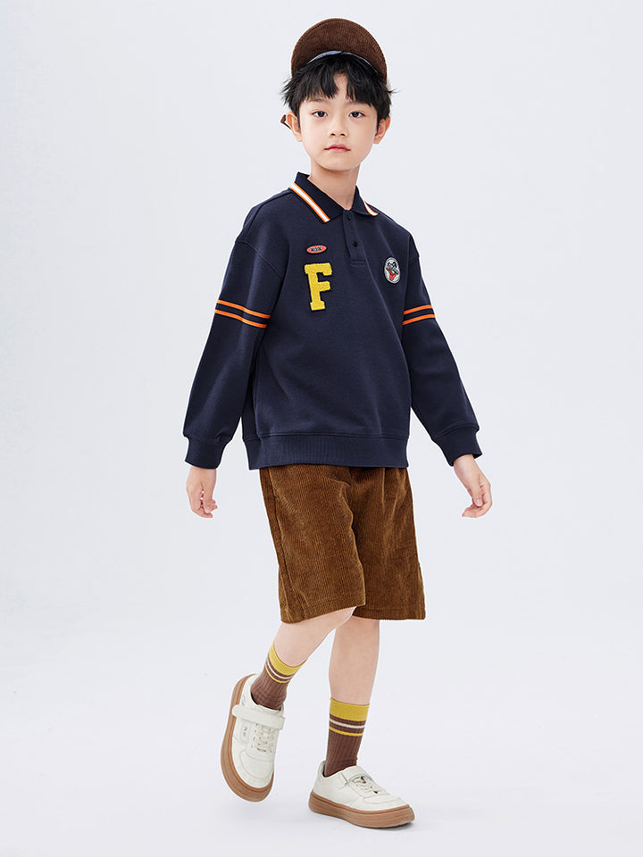 بلوزة سويت شيرت ولادي بأكمام طويلة، مزينة بتفاصيل رقعات من الجهة الأمامية وخطوط على الأكمام، تأتي بازارار للإغلاق من الجهة الأمامية وبياقة كلاسيكية عادية