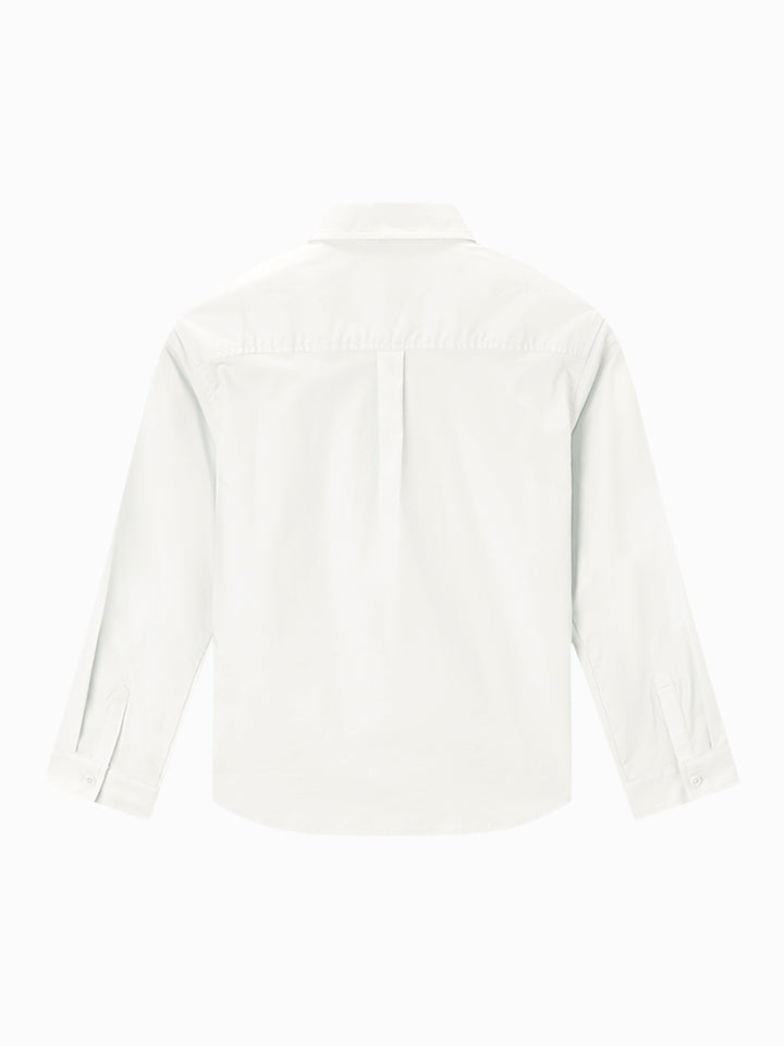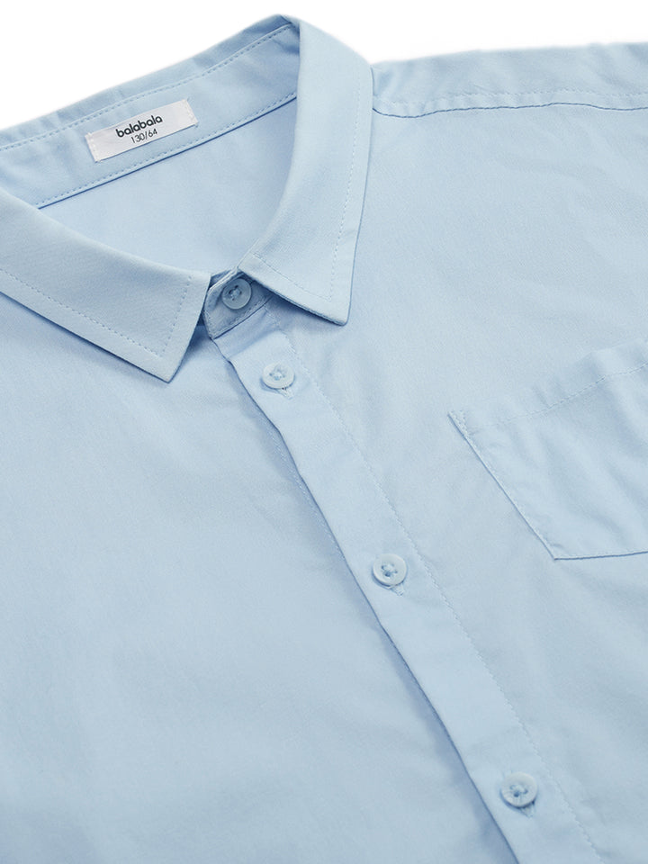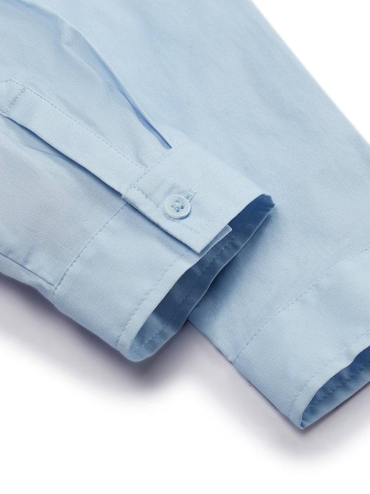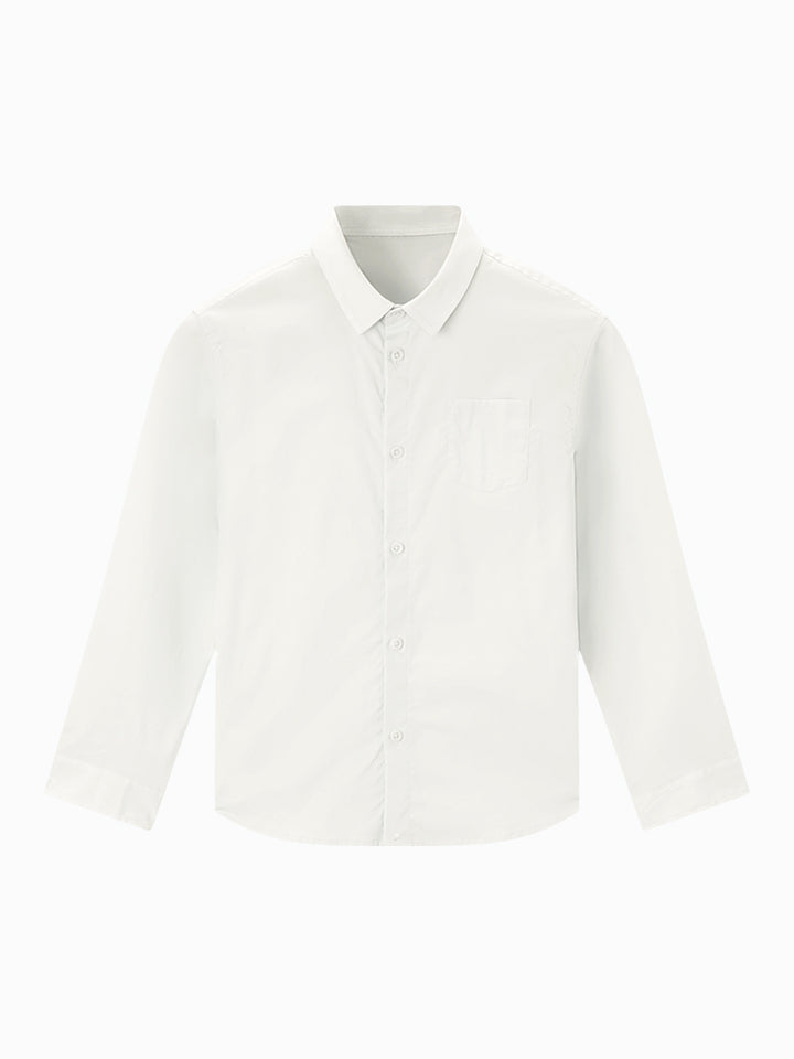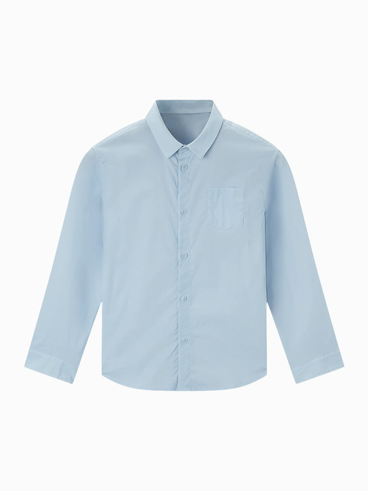 قميص ولادي بأكمام طويلة، ذو لون موحد سادة، يأتي بجيب من الجهة الأمامية، أزرار أمامية للإغلاق وبياقة كلاسيكية عادية