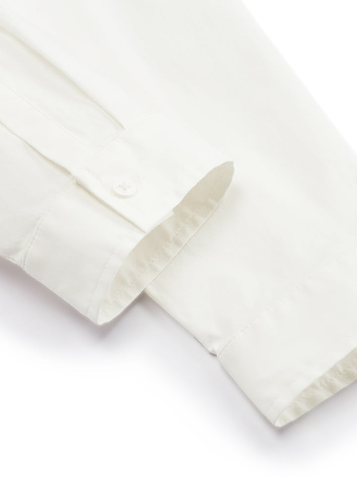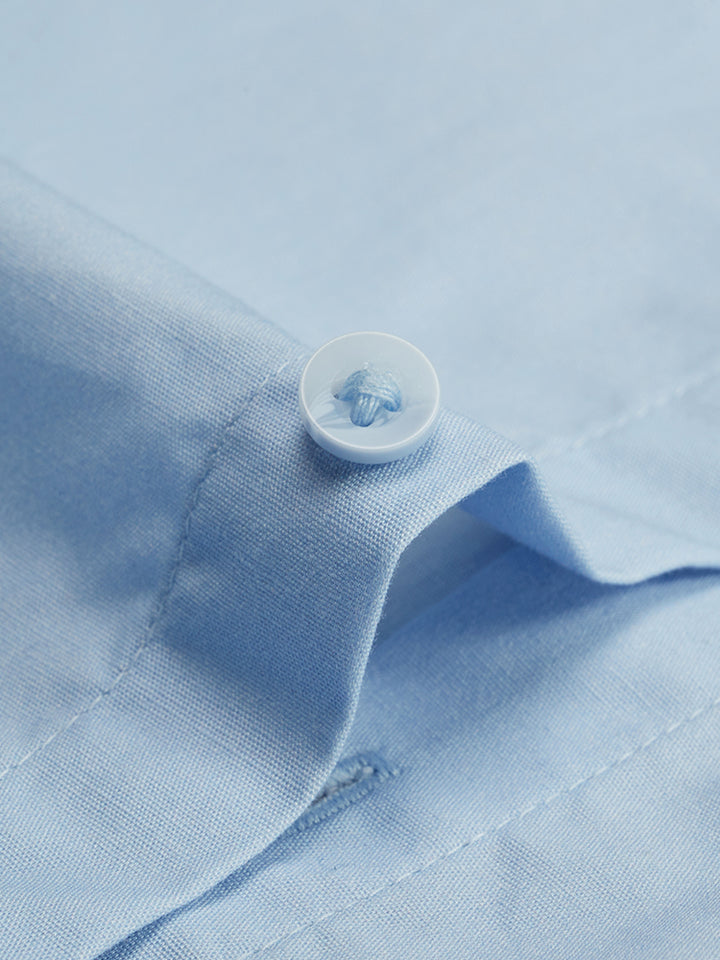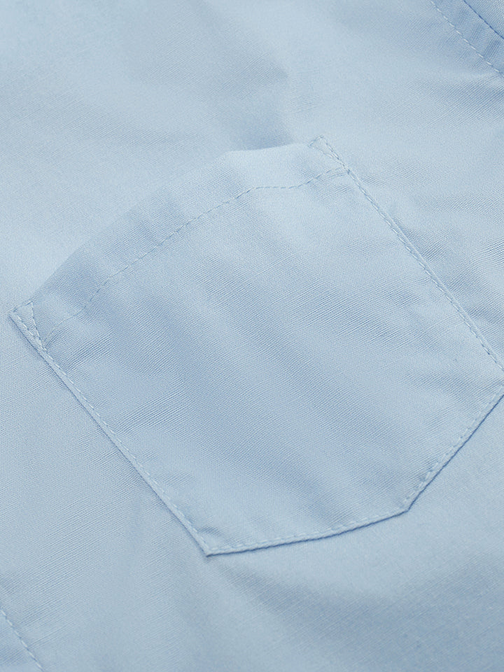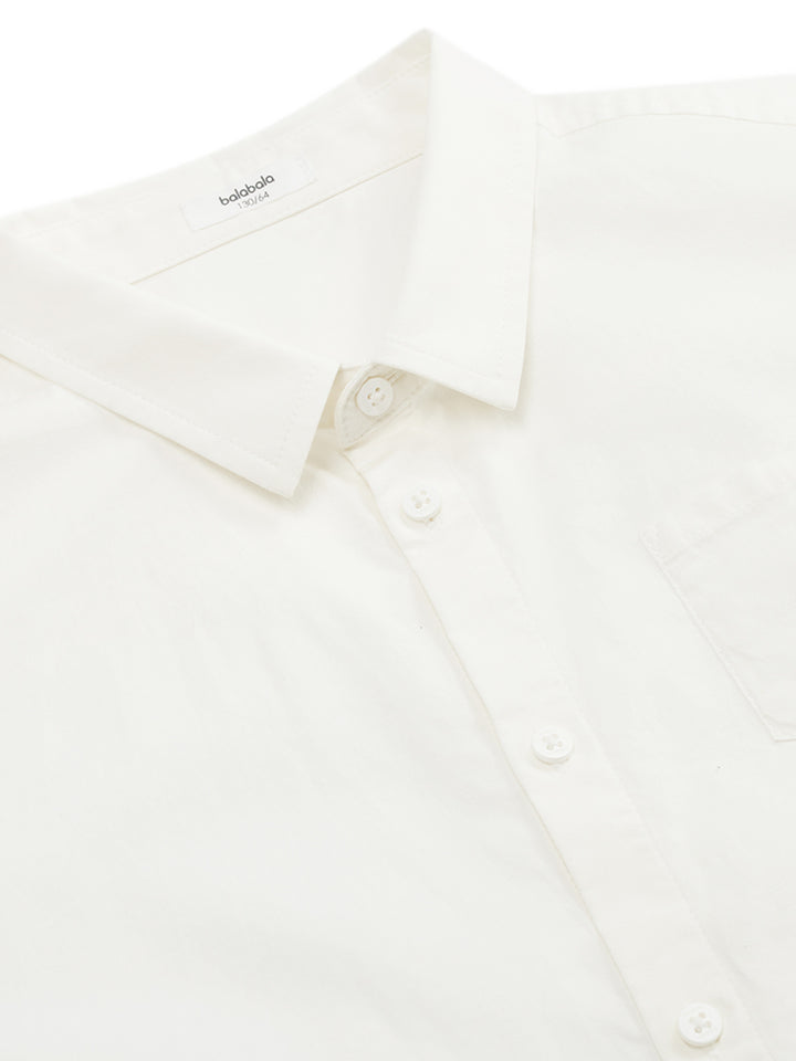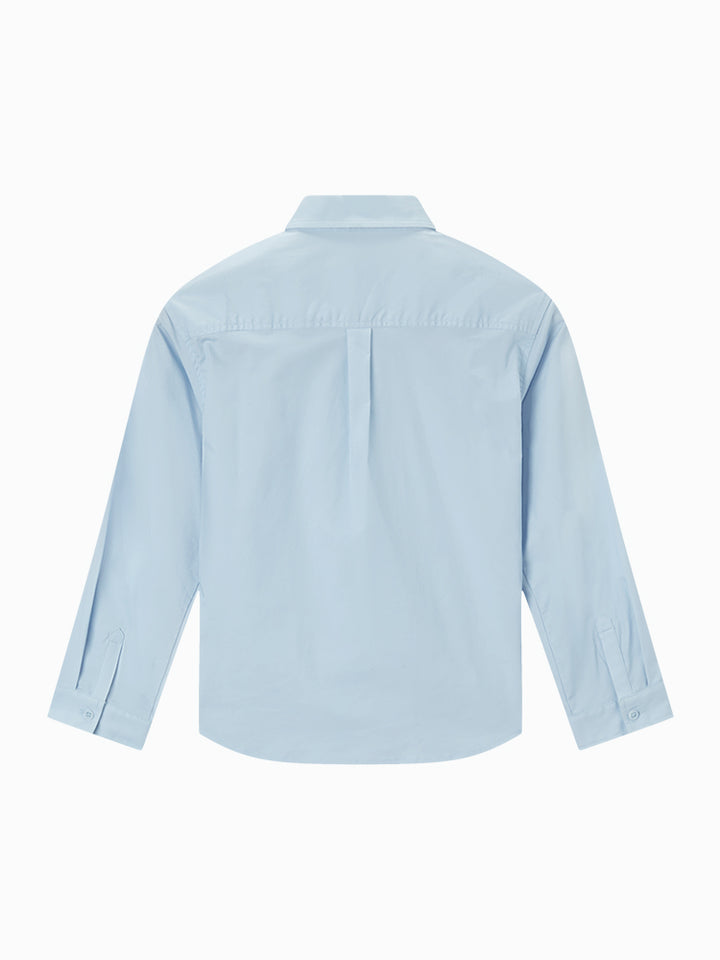 قميص ولادي بأكمام طويلة، ذو لون موحد سادة، يأتي بجيب من الجهة الأمامية، أزرار أمامية للإغلاق وبياقة كلاسيكية عادية
