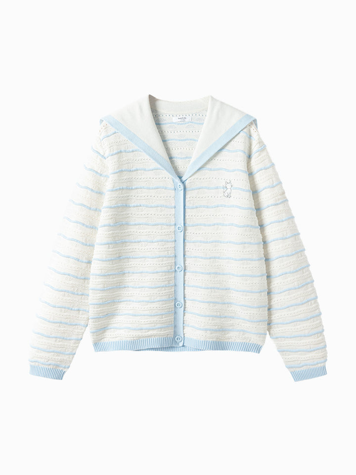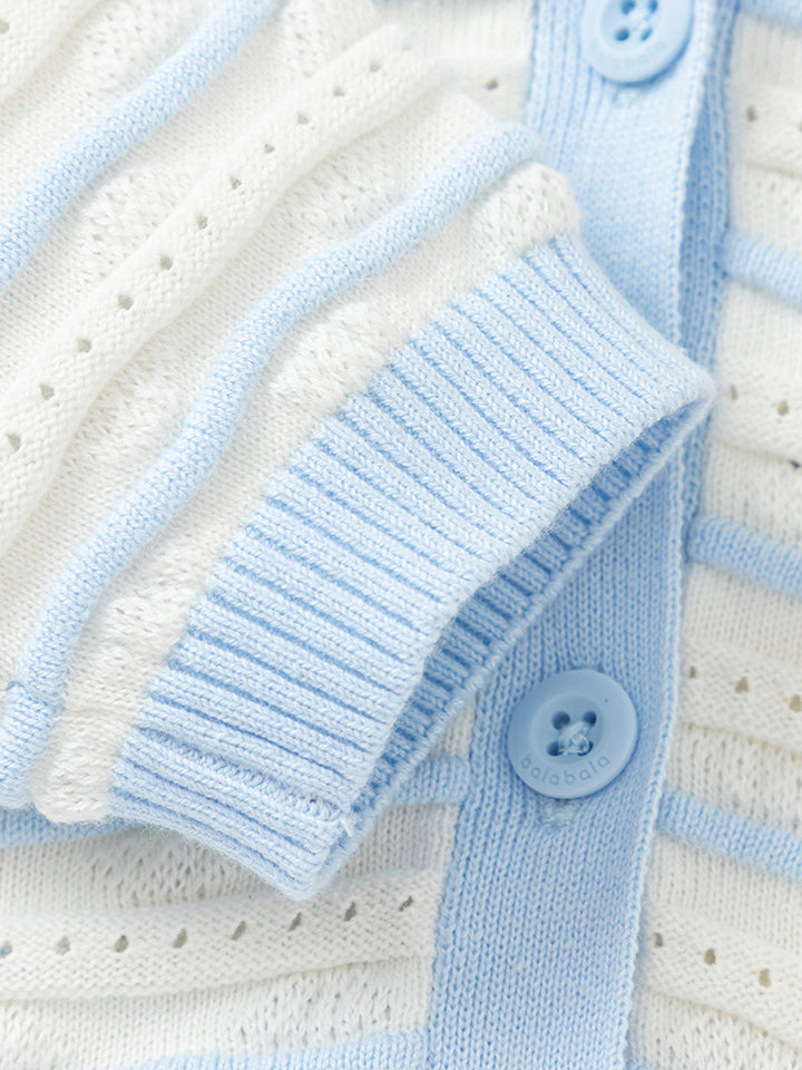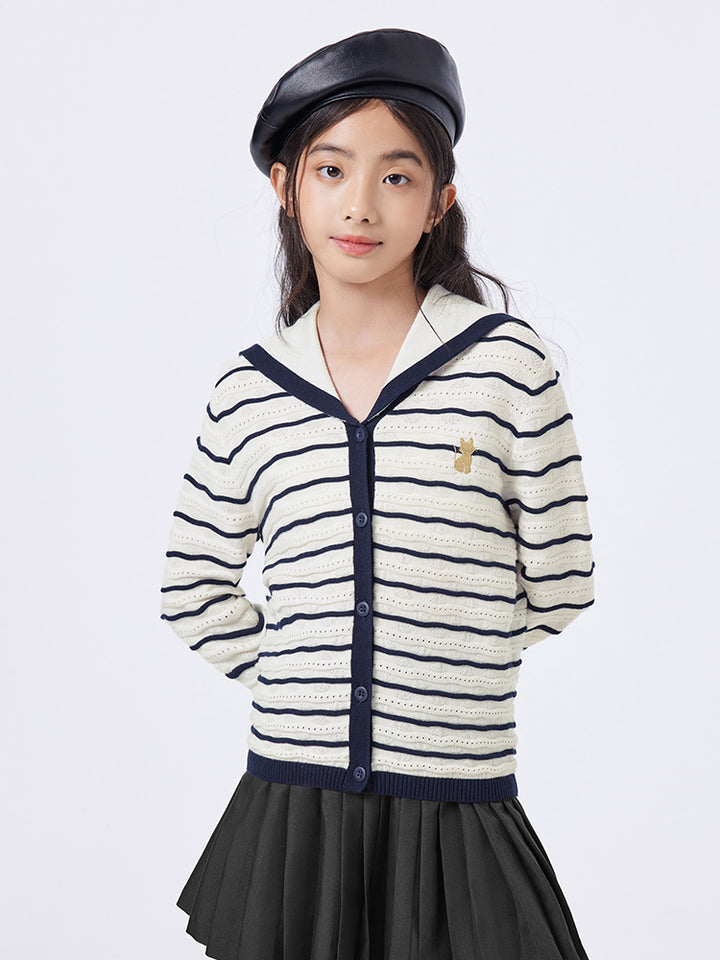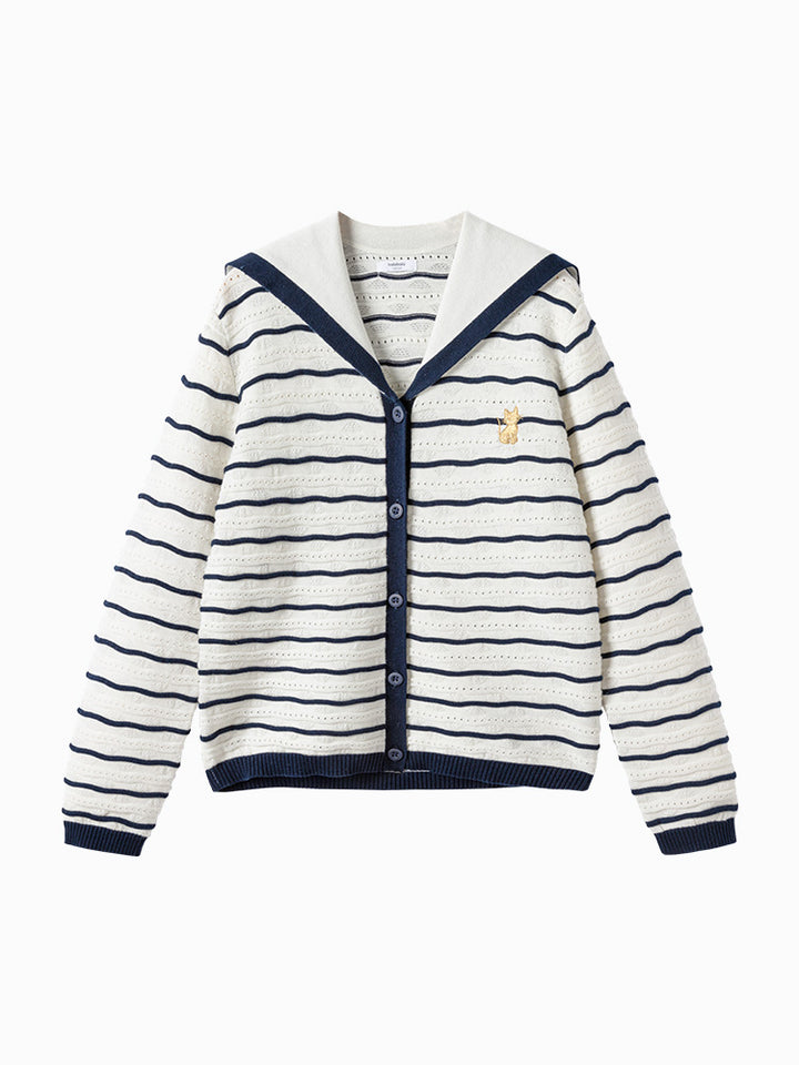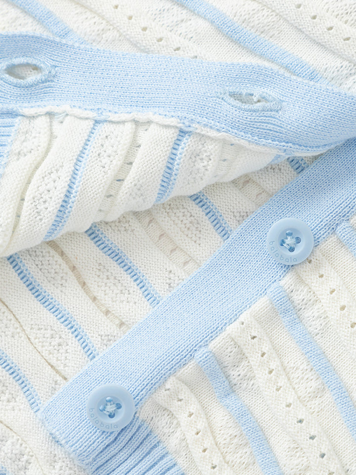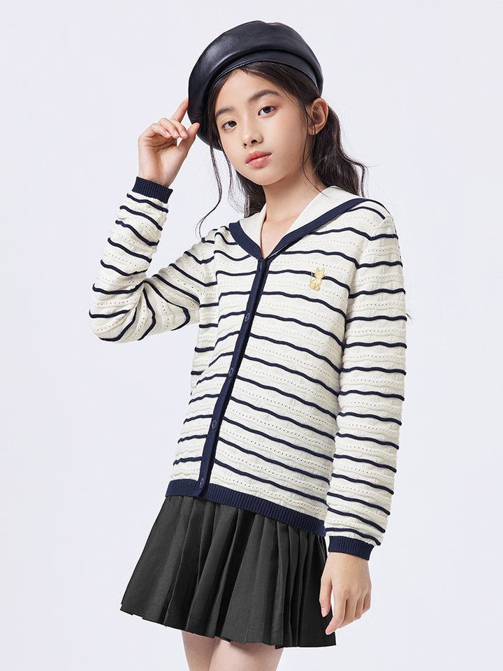جاكيت كارديغان صوف بأكمام طويلة، مزين بنمط مخطط ثنائي اللون وطبعة م؛بوكة من الجهة الخلفية، يأتي بأزرار للإغلاق من الجهة الأمامية وبياقة كلاسيكية ذات قصة عريضة