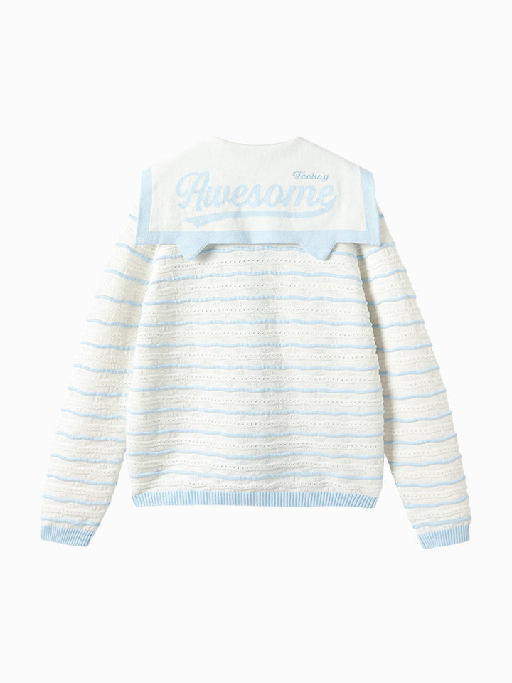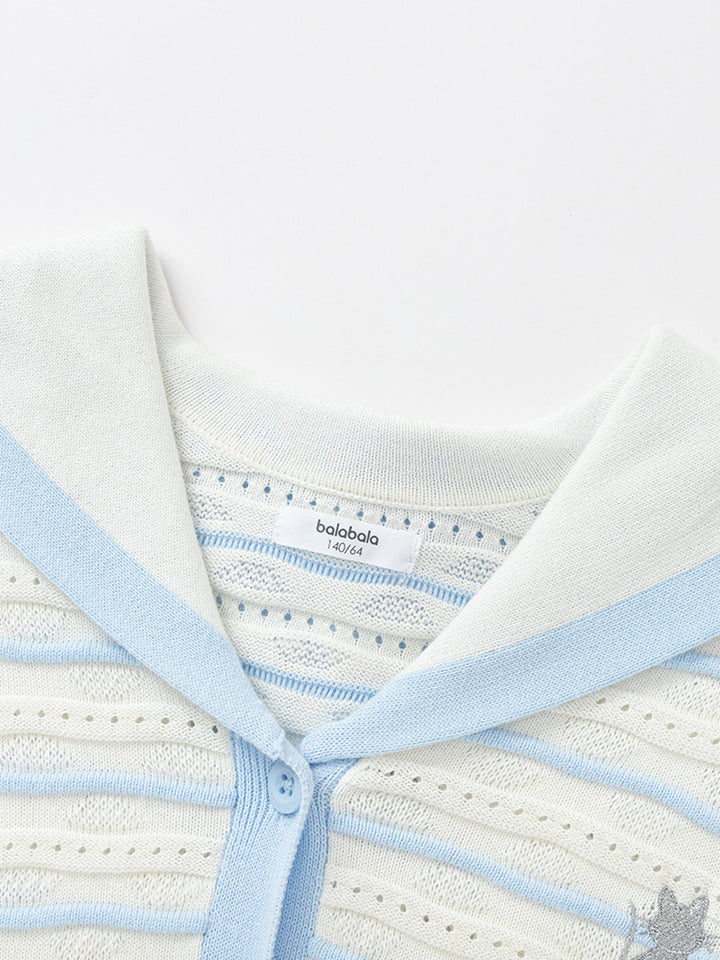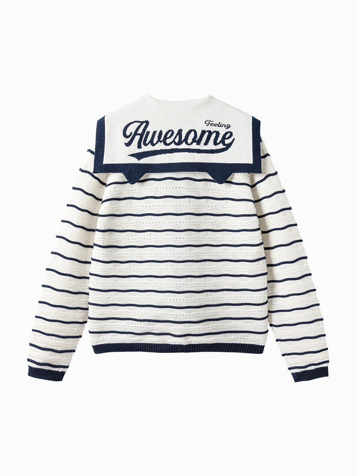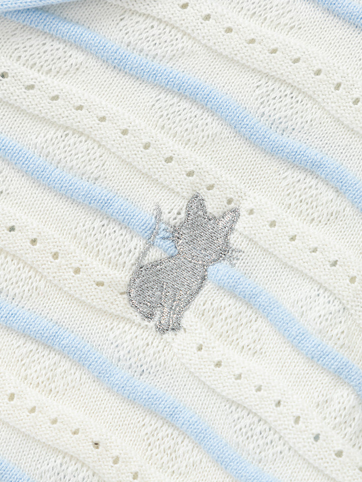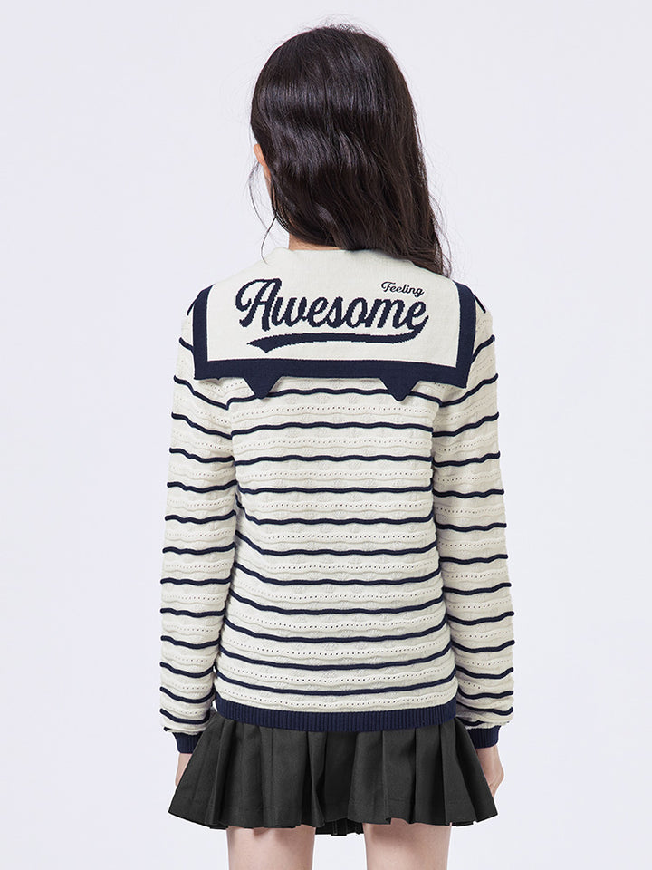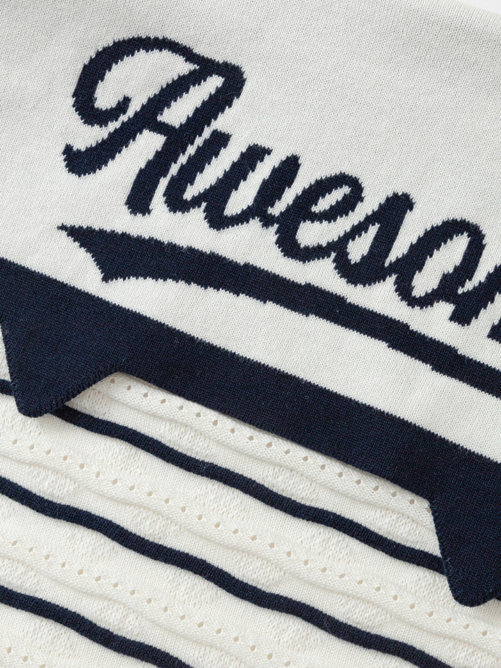 جاكيت كارديغان صوف بأكمام طويلة، مزين بنمط مخطط ثنائي اللون وطبعة م؛بوكة من الجهة الخلفية، يأتي بأزرار للإغلاق من الجهة الأمامية وبياقة كلاسيكية ذات قصة عريضة