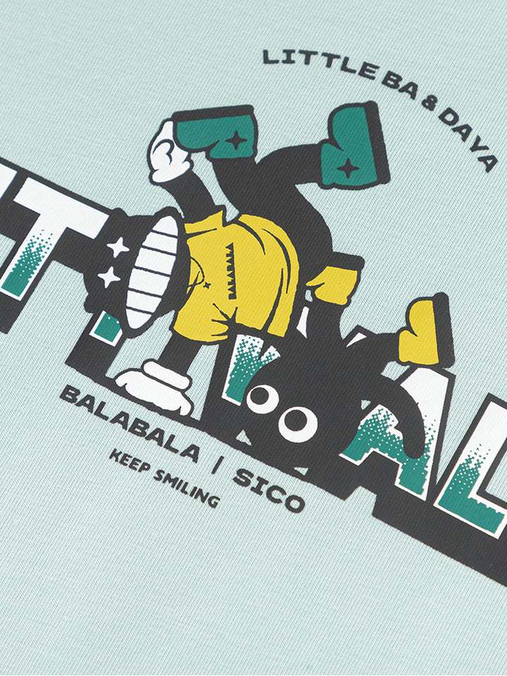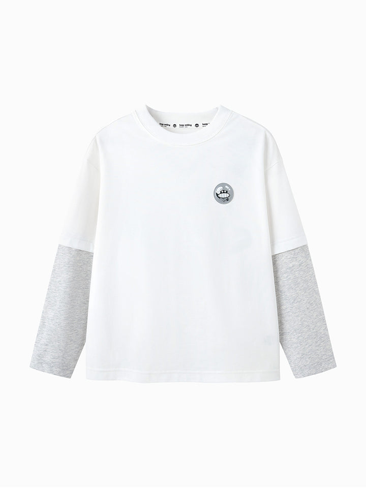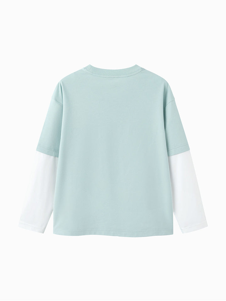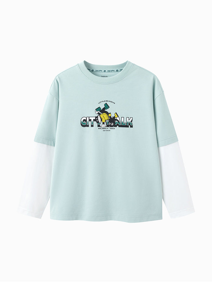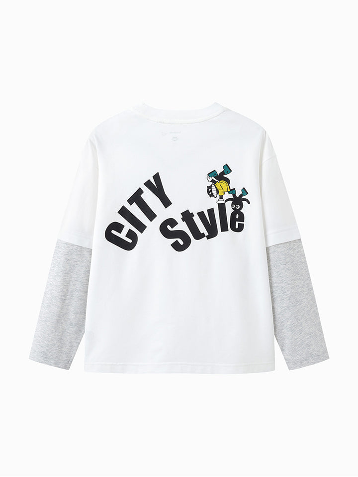 تيشيرت ولادي بأكمام طويلة مزينة بطبعة خلفية وأكمام متباينة اللون يأتي بياقة مدورة الشكل