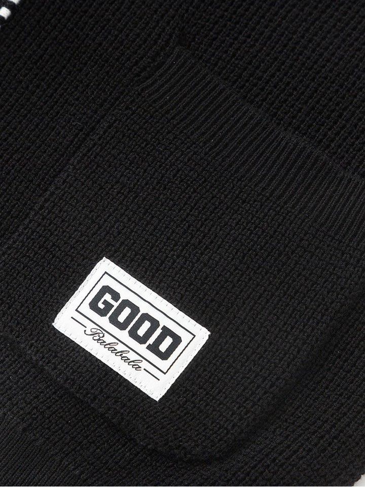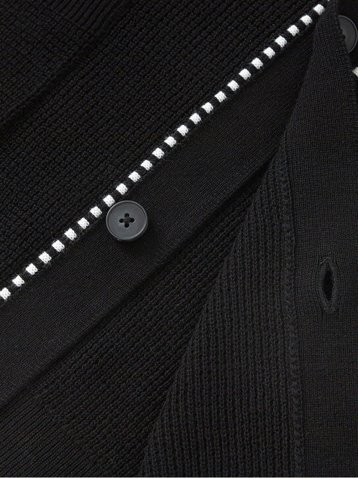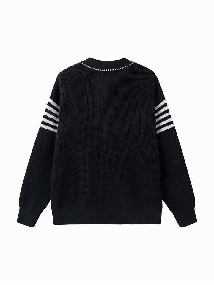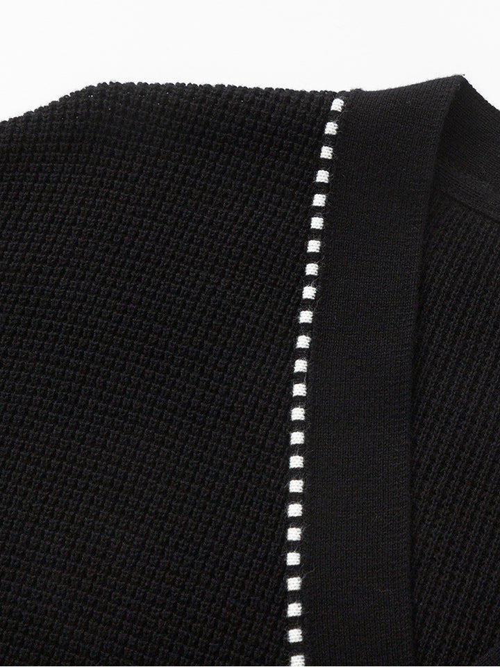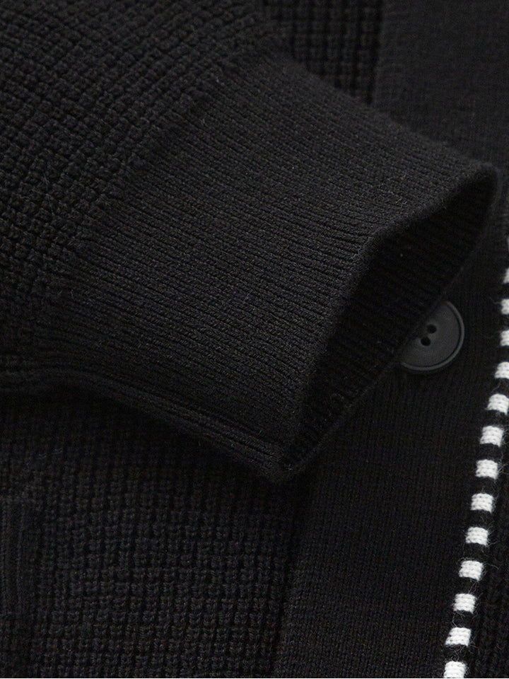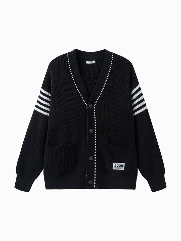 جاكيت كارديغان صوف بأكمام طويلة، مزين بتفاصيل خطوط على الأكمام، يأتي بأزرار للإغلاق من الجهة الأمامية وبياقة على شكل V