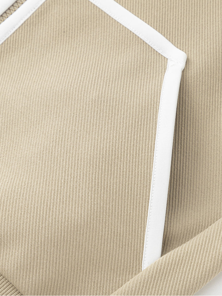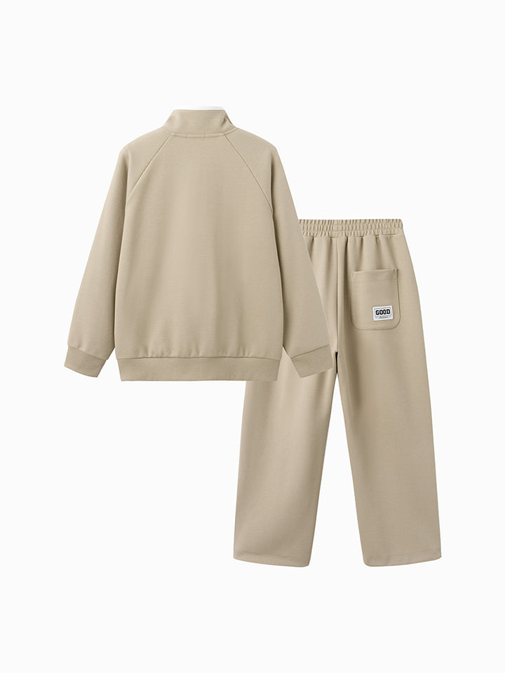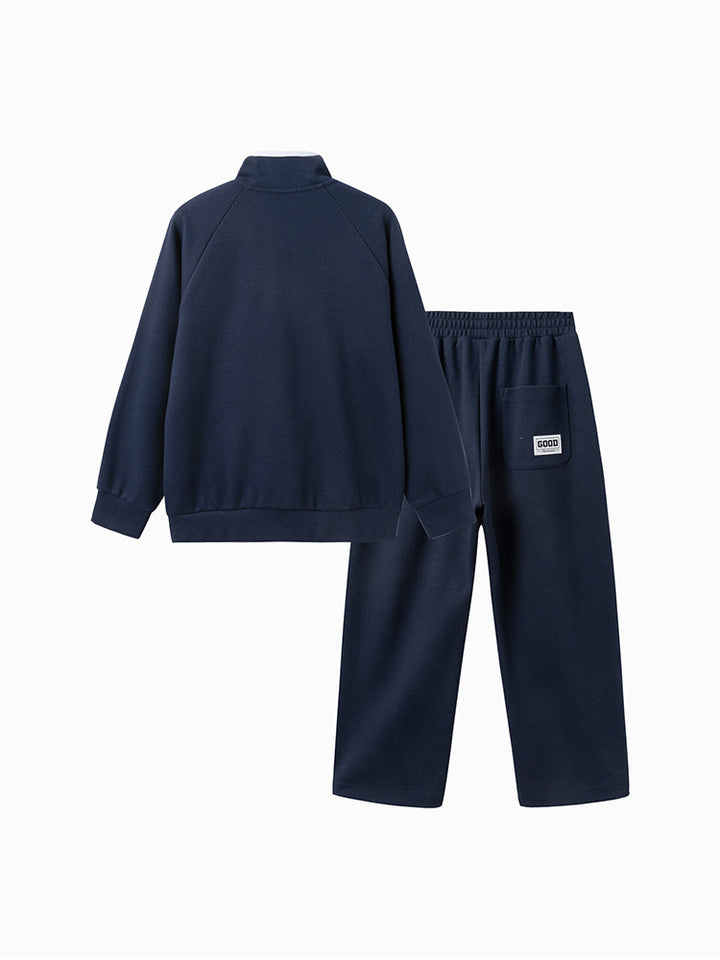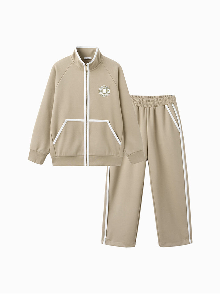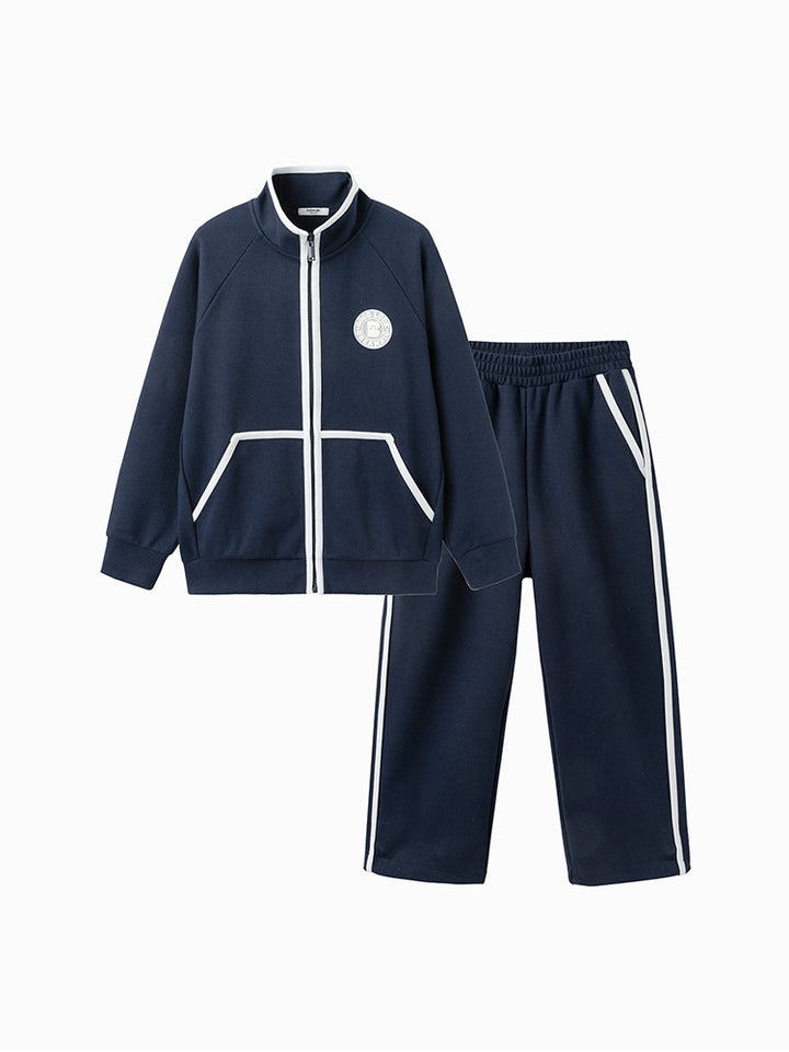 طقم ولادي مكون من قطعتين، جاكيت رياضي بأكمام طويلة مزين بتفاصيل خطوط، ياتي بجيوب وسحاب للإغلاق وبنطلون رياضي مزين بتفاصيل خطوط، يأتي بجيوب وبخصر مطاطي