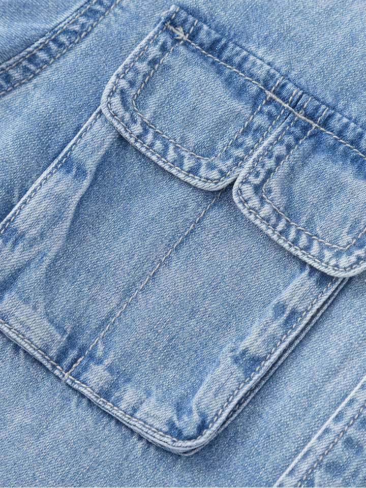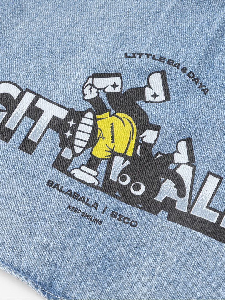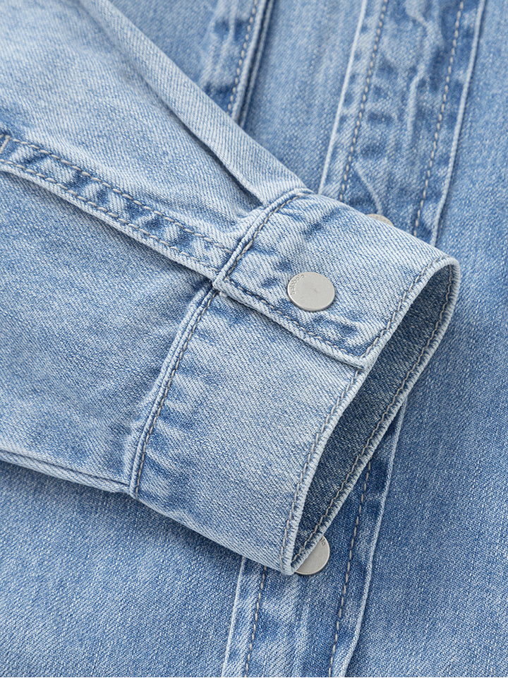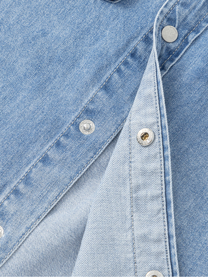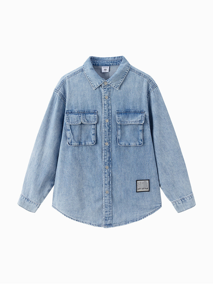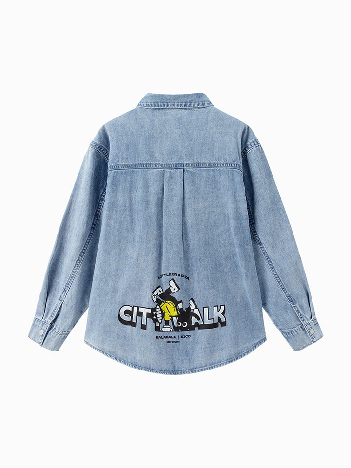 قميص جينز كاجوال بأكمام طويلة، مزين بطبعة من الجهة الخلفية، يأتي بجيوب قلاب من الجهة الأمامية، أزرار أمامية للإغلاق وبياقة كلاسيكية مطوية