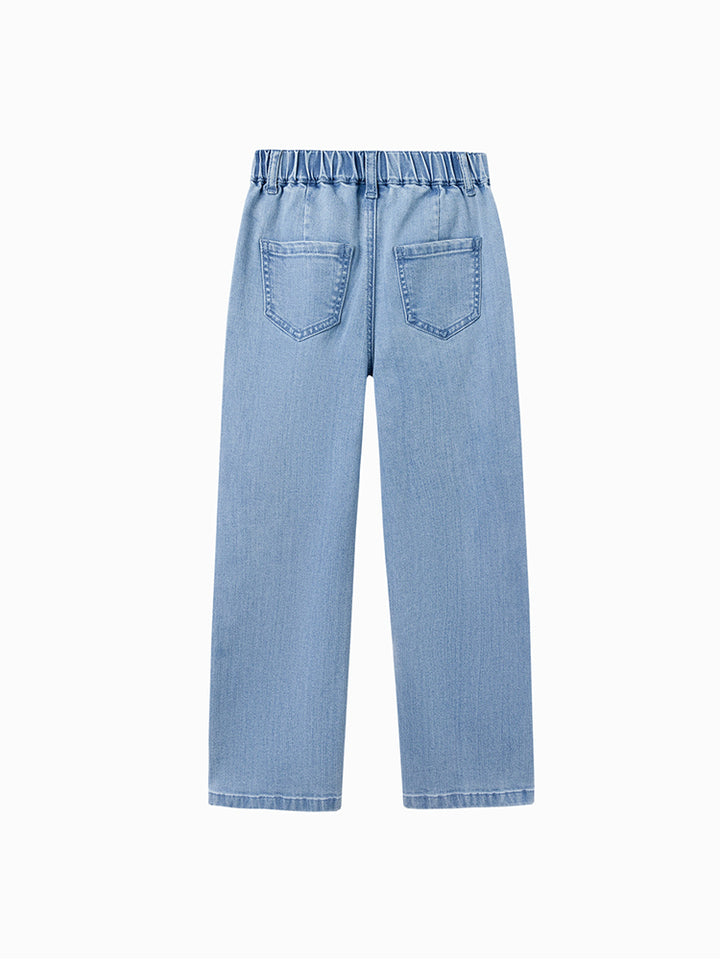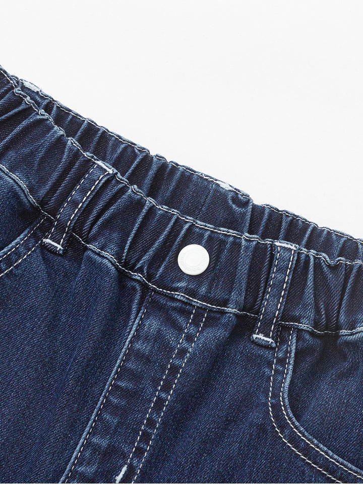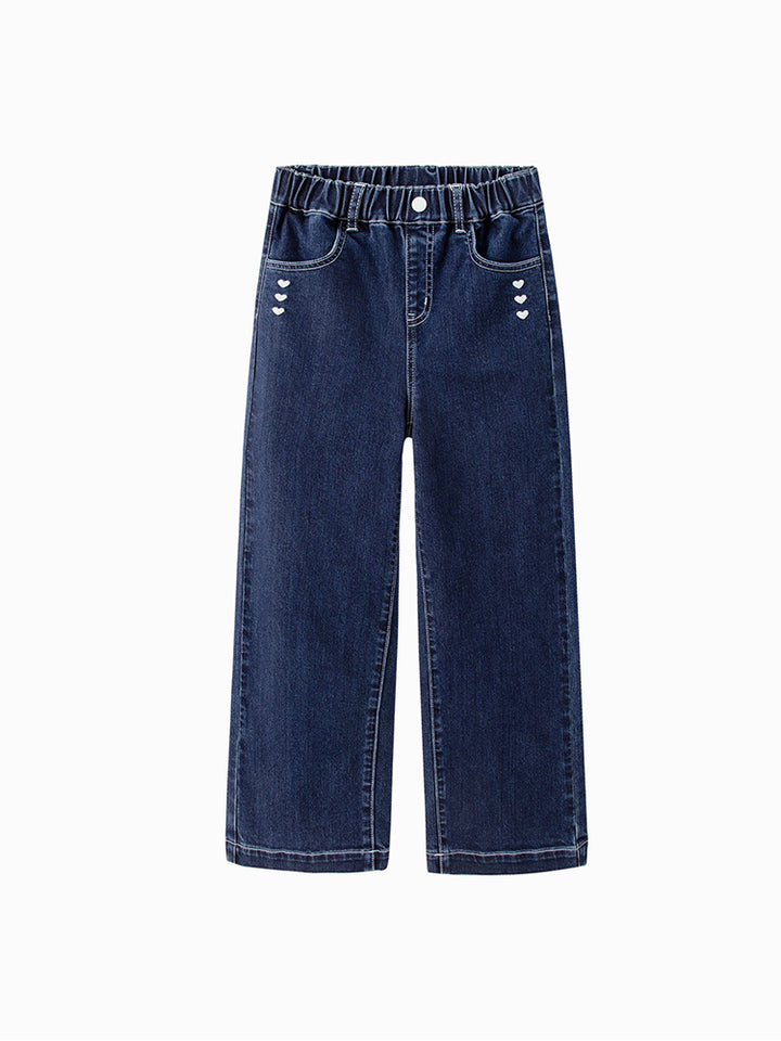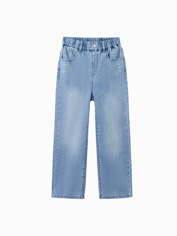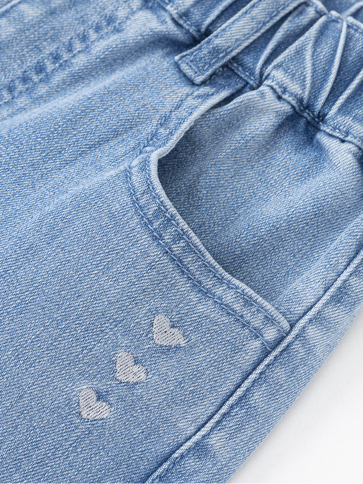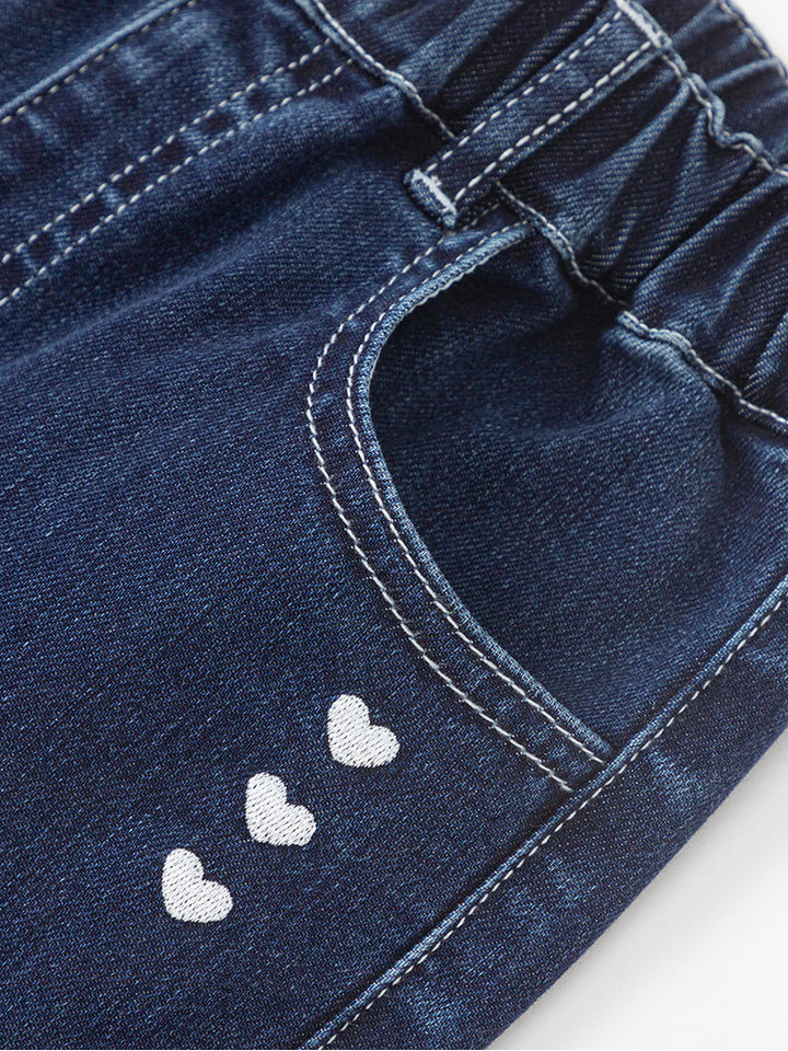 بنطلون جينز بناتي بنمط ذو لون موحد، مزين بتفاصيل تطريز ويأتي بجيوب وخصر مطاطي مريح