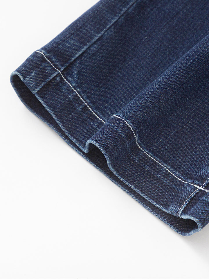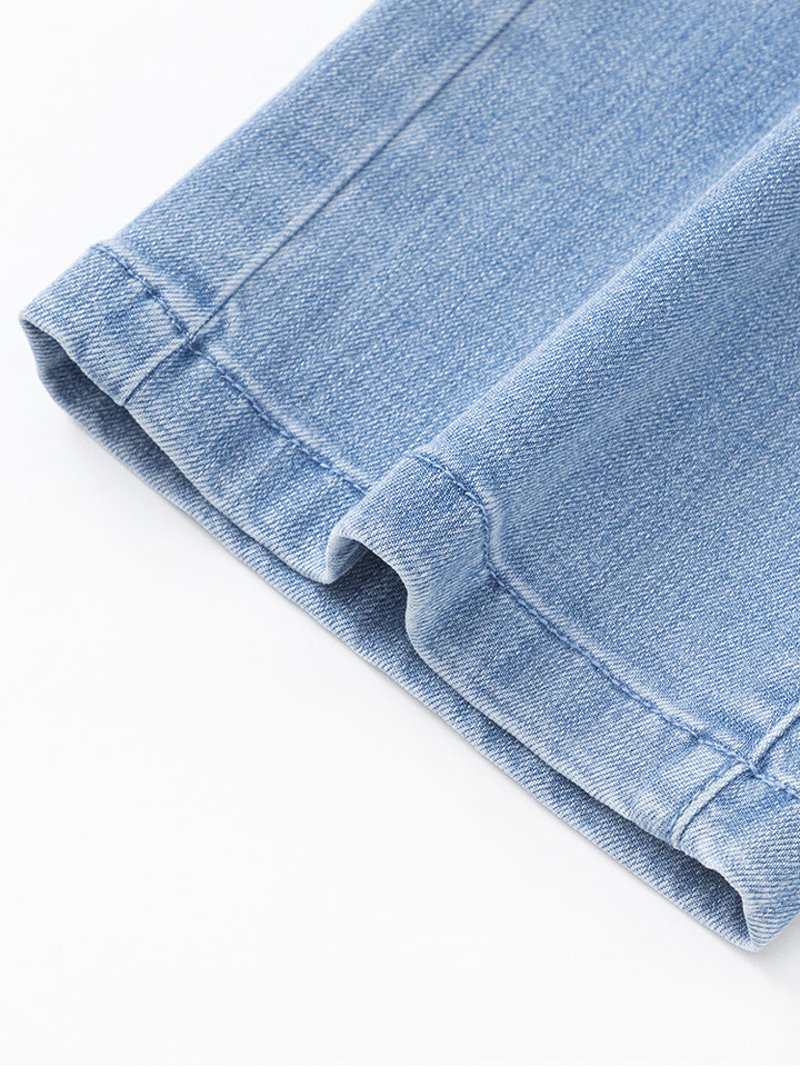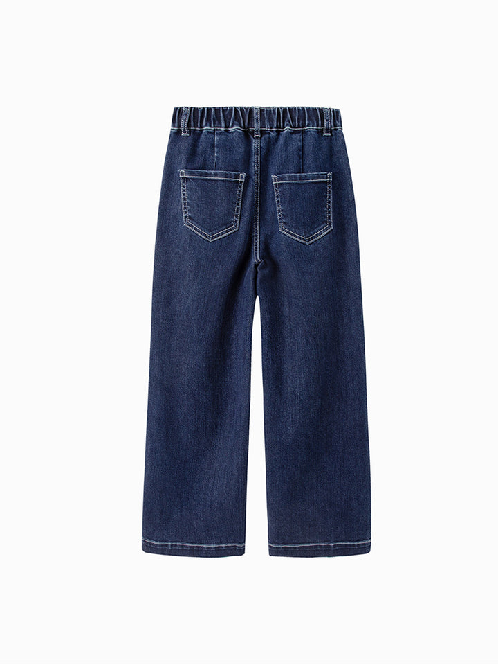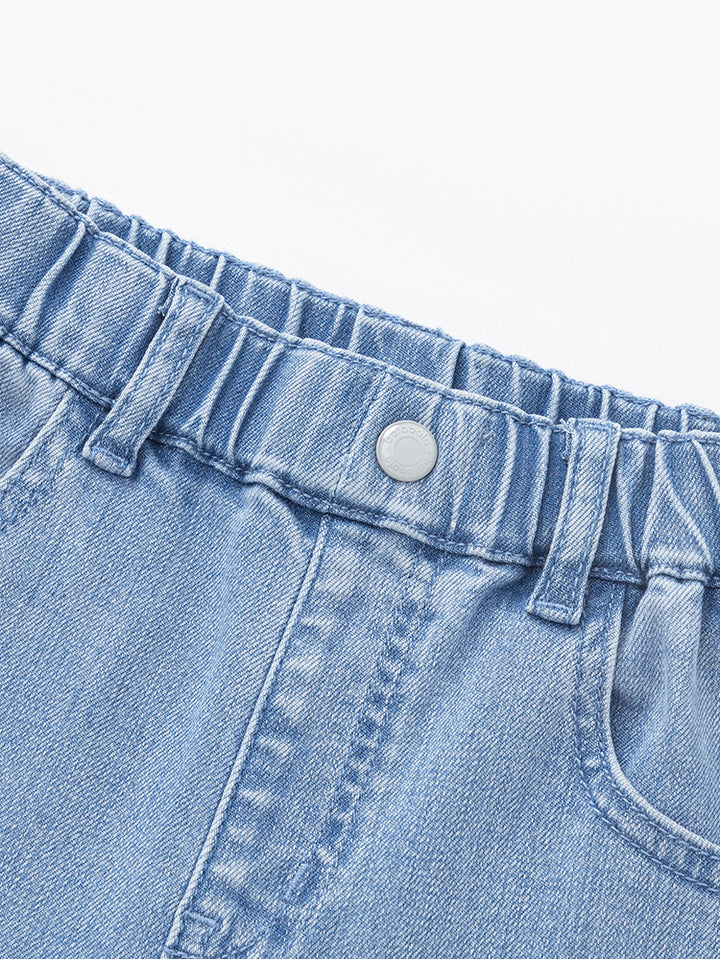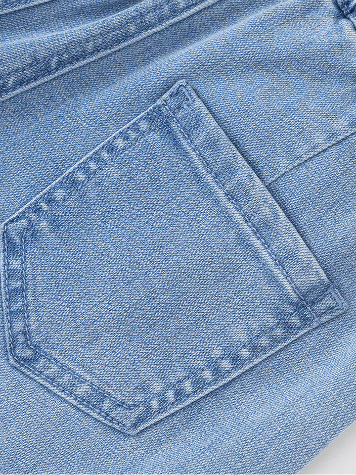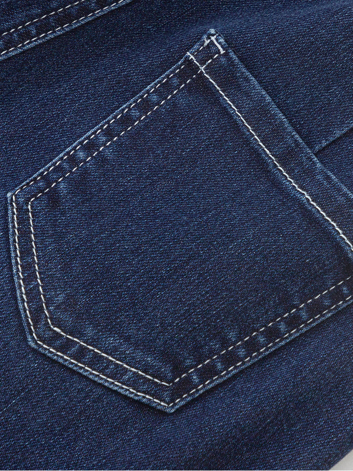 بنطلون جينز بناتي بنمط ذو لون موحد، مزين بتفاصيل تطريز ويأتي بجيوب وخصر مطاطي مريح