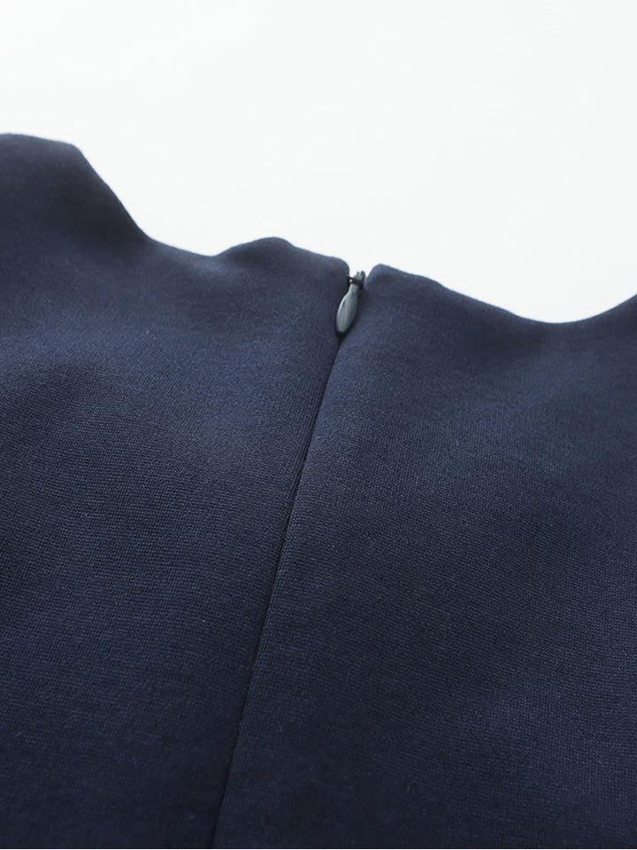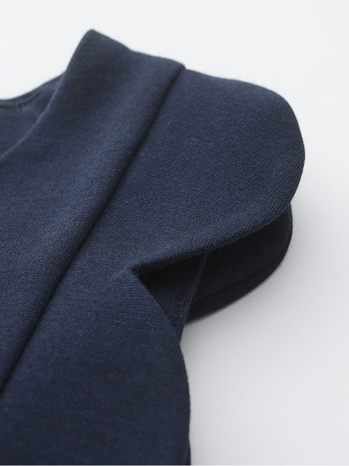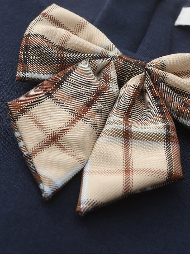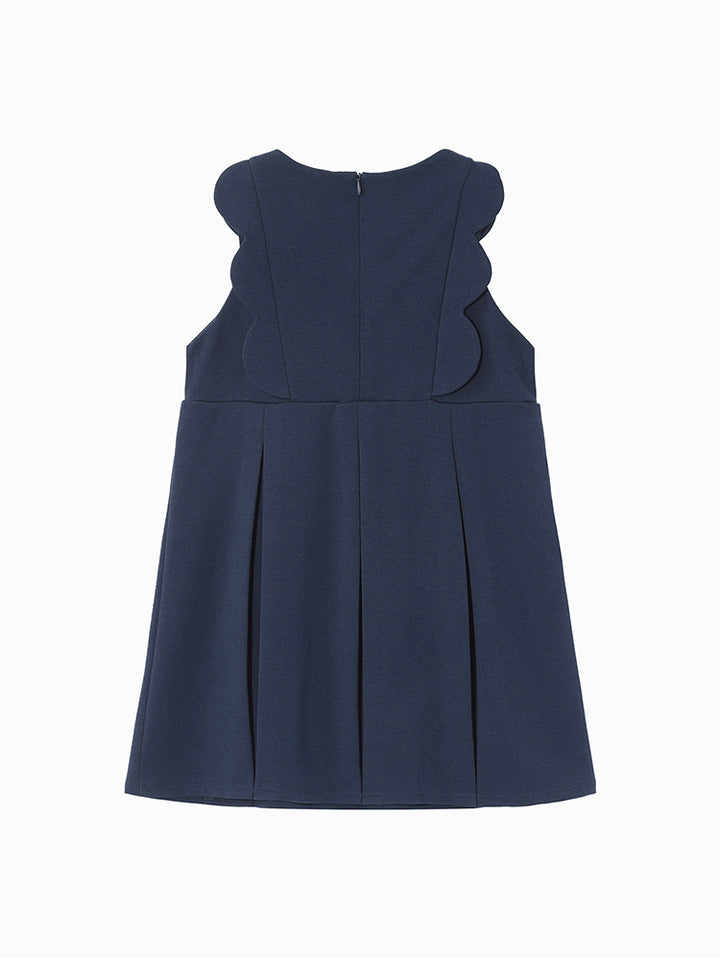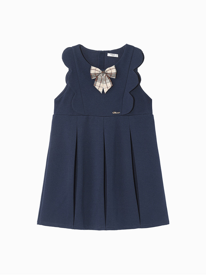 فستان بناتي بدون أكمام، مزين بتفاصيل ببيونة من الجهة الأمامية وكسرات على الجزء السفلي، يأتي بسحاب للإغلاق من الجهة الخلفية وبياقة مدورة الشكل
