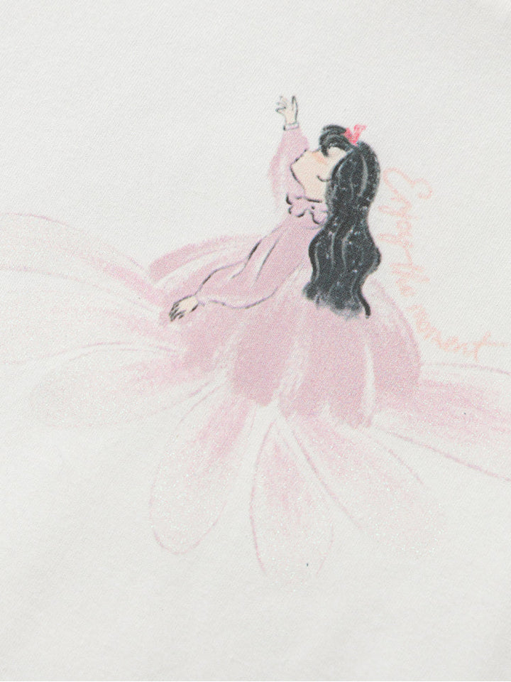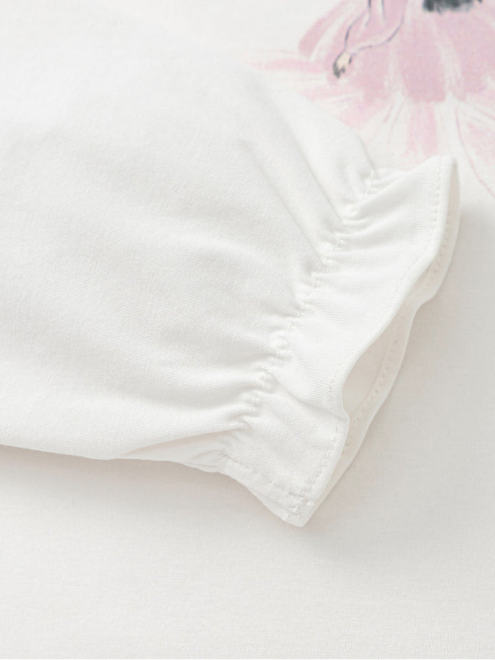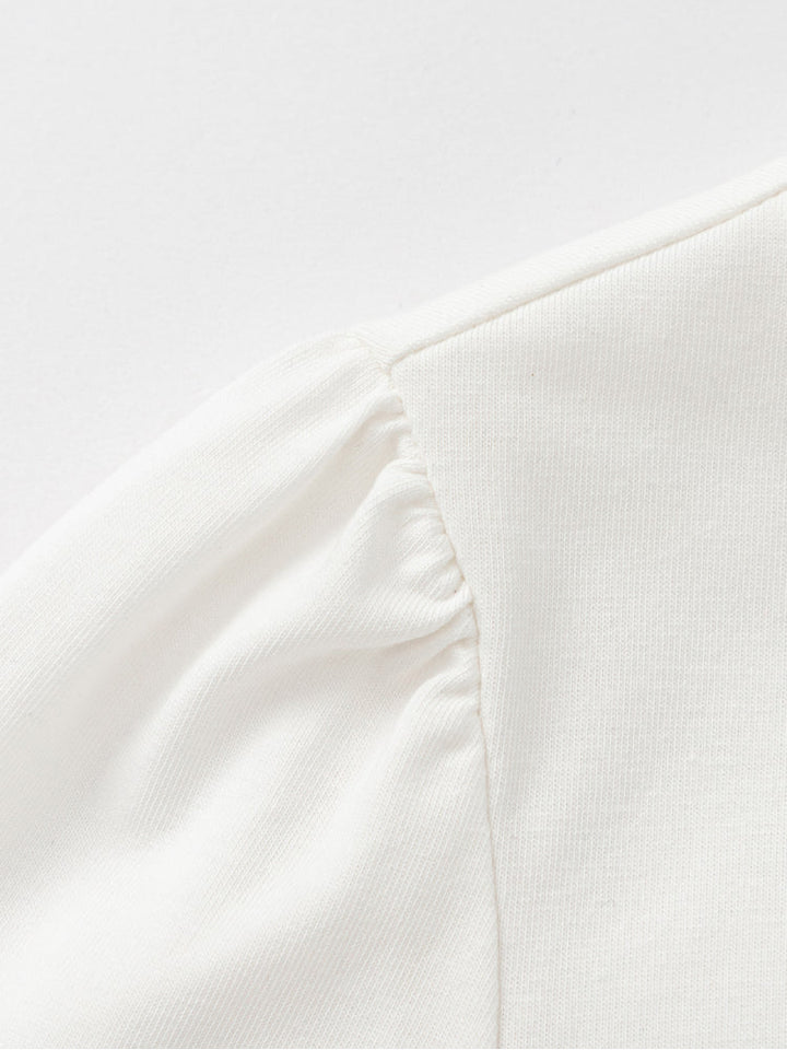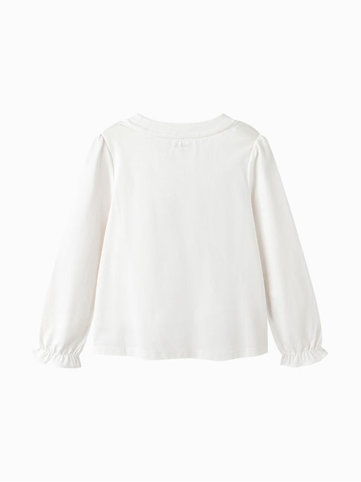 توب بأكمام طويلة مكشكشة بخفة وطبعة أمامية جذابة.