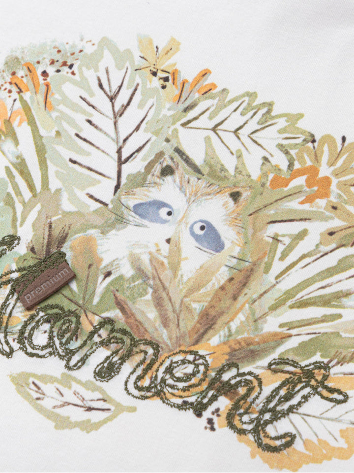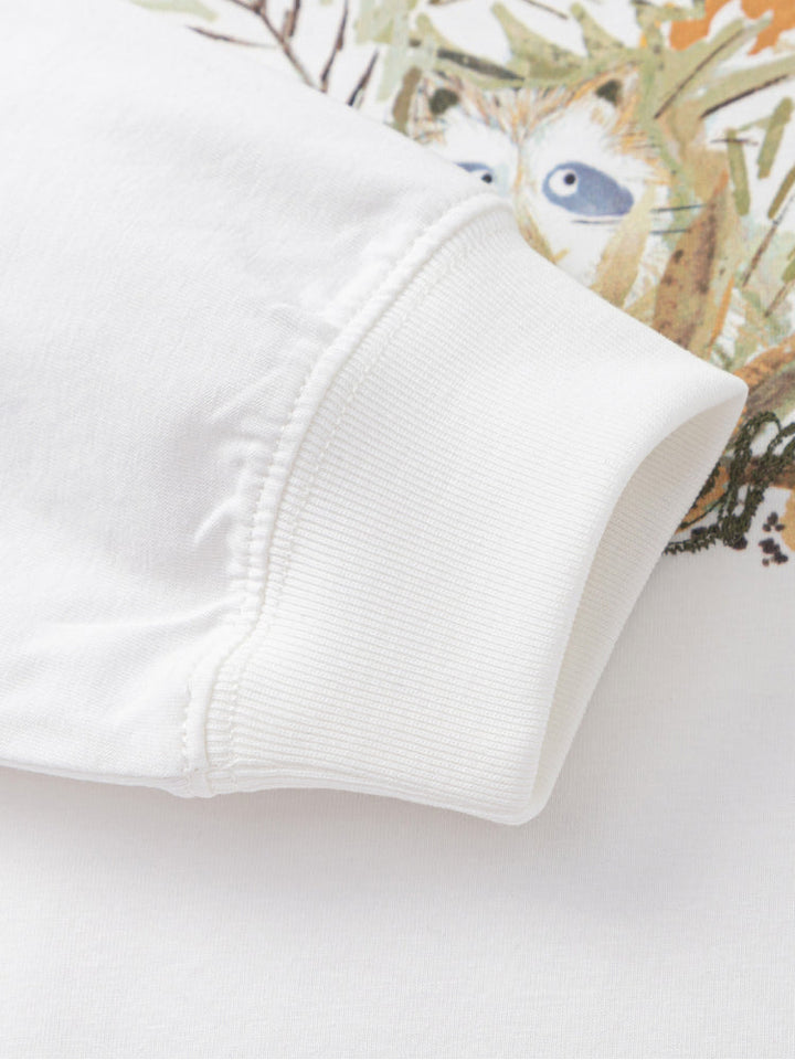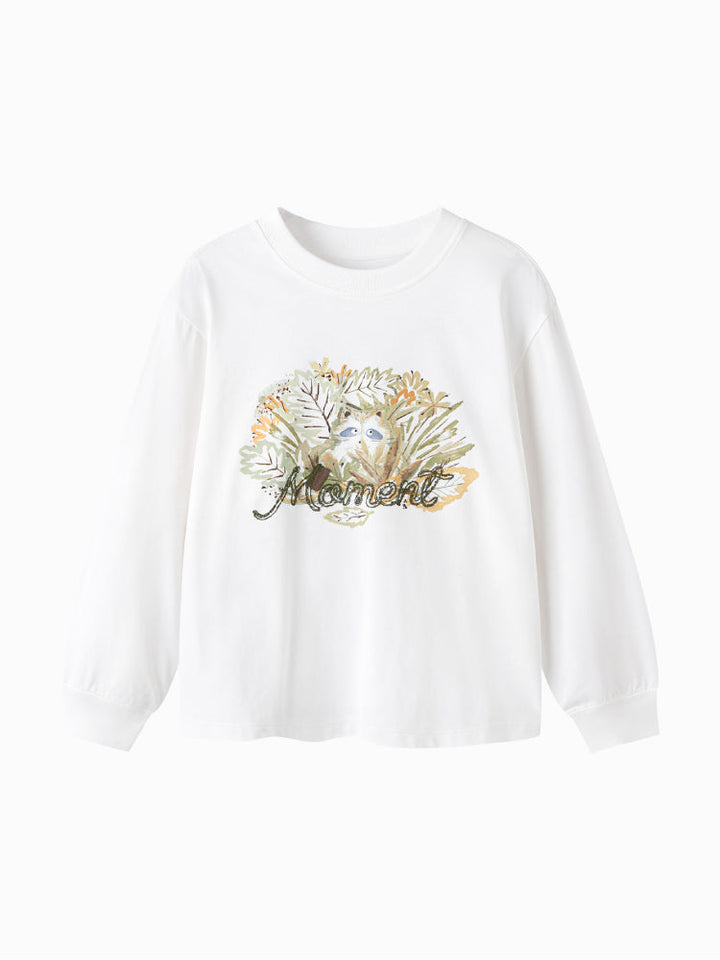 تيشيرت قطن ناعم بأكمام طويلة مع ياقة دائرية، مزين بطبعة أمامية مستوحاة من الطبيعة، مثالي للإطلالة اليومية.