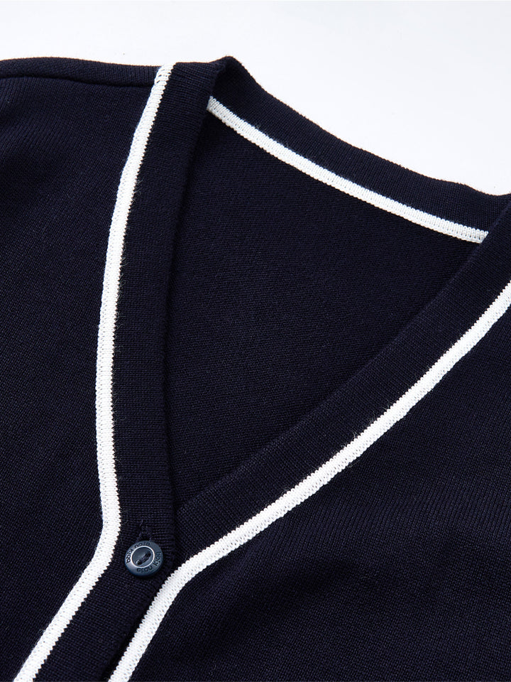 يتميز هذا الكارديغان المحبوك بأكمام طويلة بتفاصيل خطوط متباينة أنيقة وأزرار أمامية تسهل الإغلاق. مثالي للطبقات وإضافة لمسة دافئة وعصرية لإطلالتك.