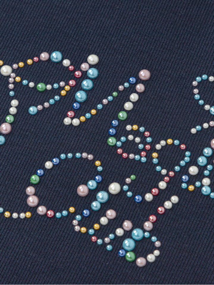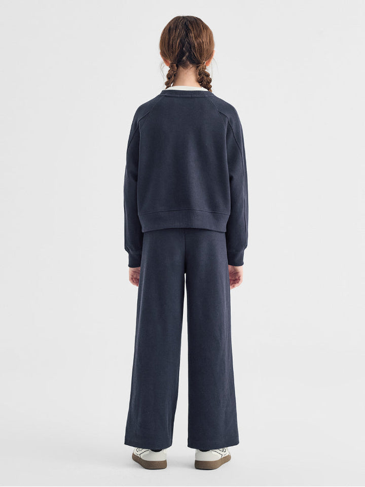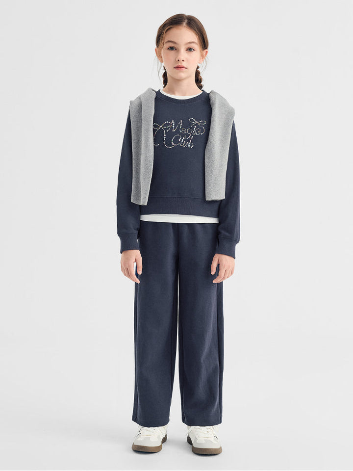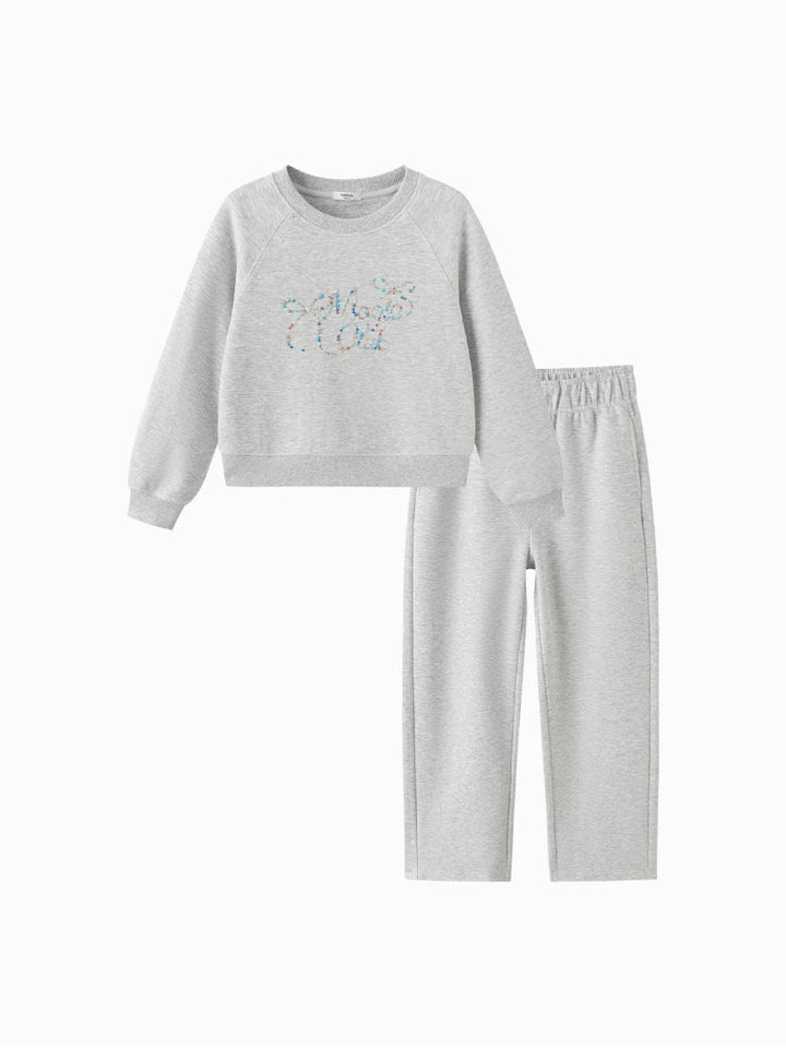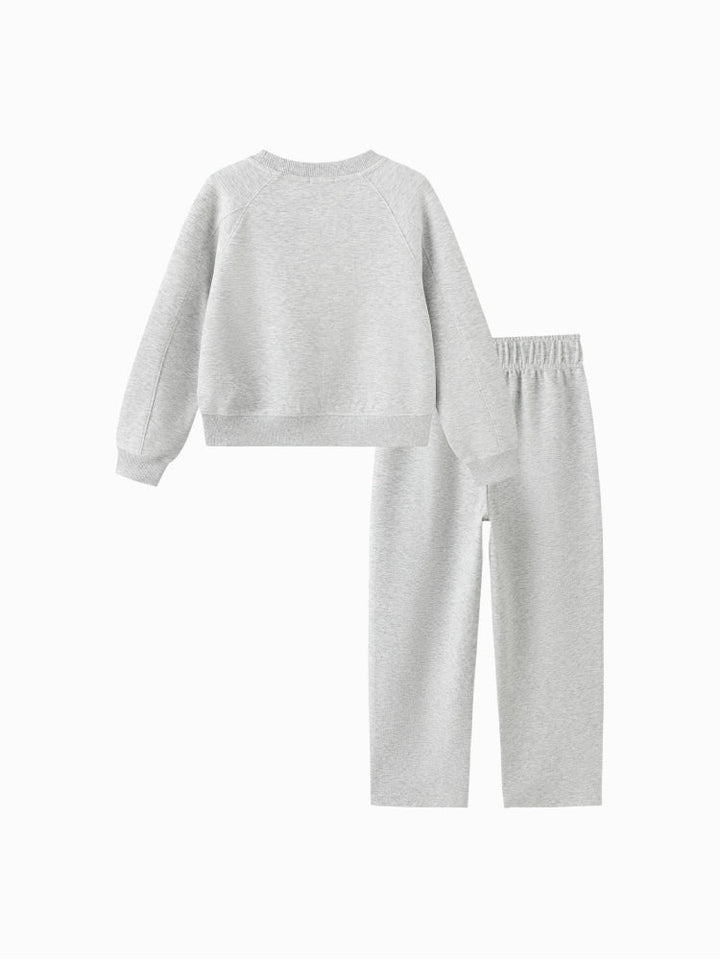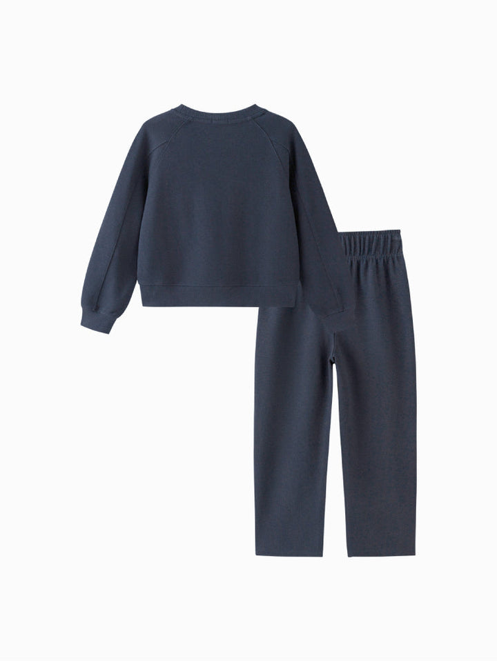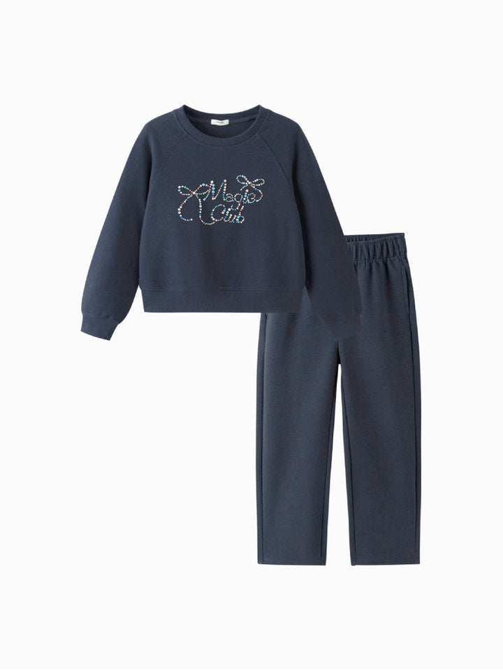 طقم مكون من سويت شيرت مزين بطبعة أمامية لامعة، مع بنطال بخصر مطاطي متناسق، يجمع بين الراحة واللمسة العصرية المرحة.