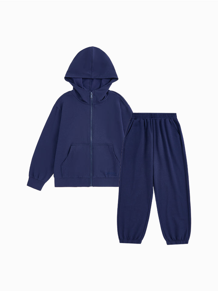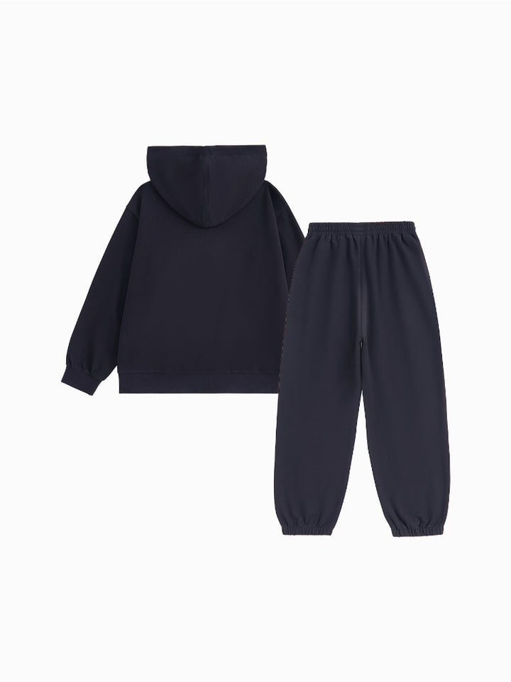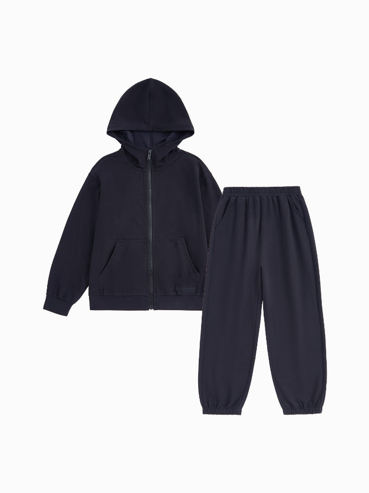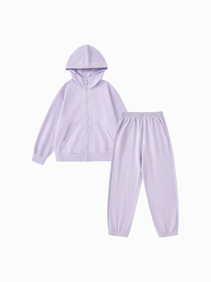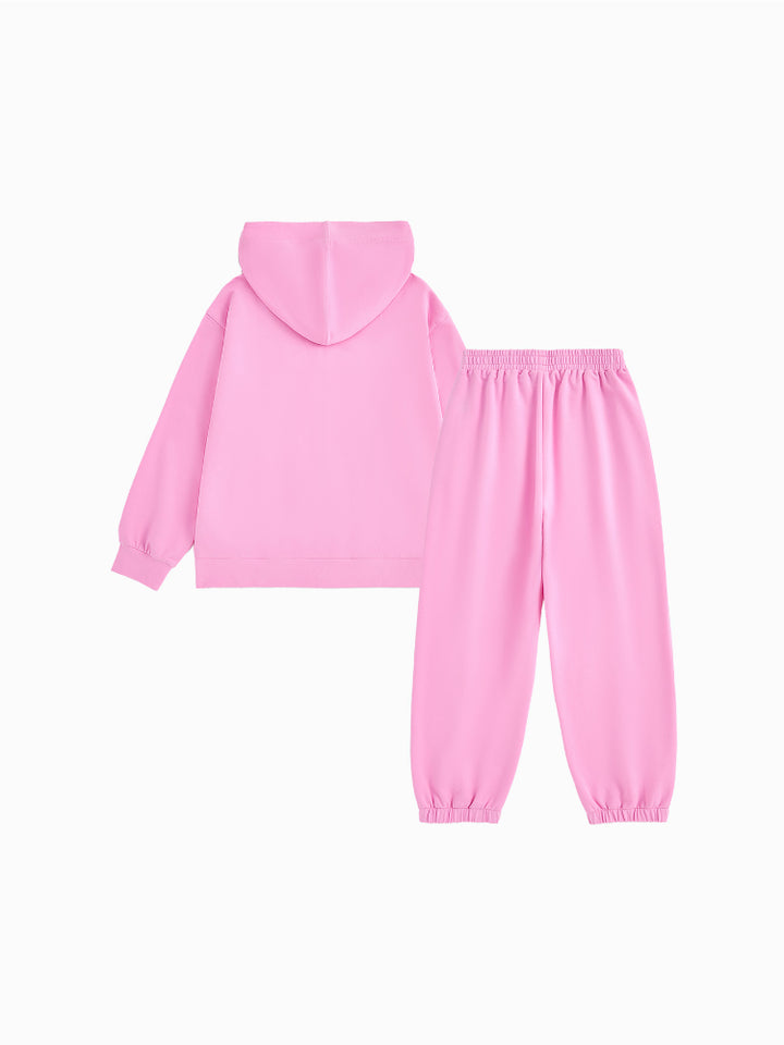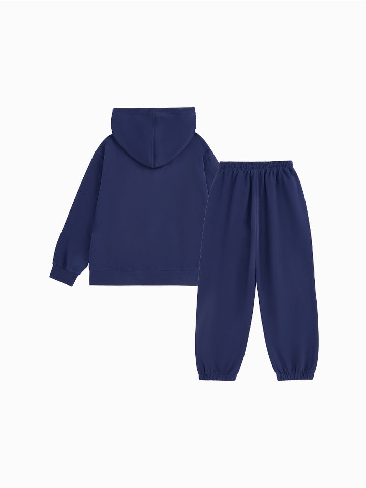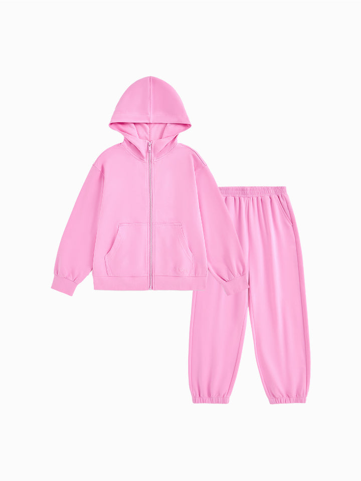 يتكون هذا الطقم المريح من هودي بأكمام طويلة بلون موحد مع تطريز أمامي بنفس اللون، وسحاب أمامي، وجيوب أمامية، وقبعة مرفقة. يأتي مع بنطلون رياضي كاجوال بلون متناسق، مزود بجيوب وخصر مطاطي لراحة ومرونة طوال اليوم.