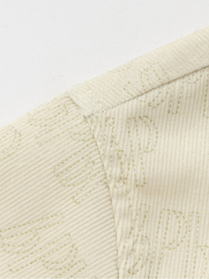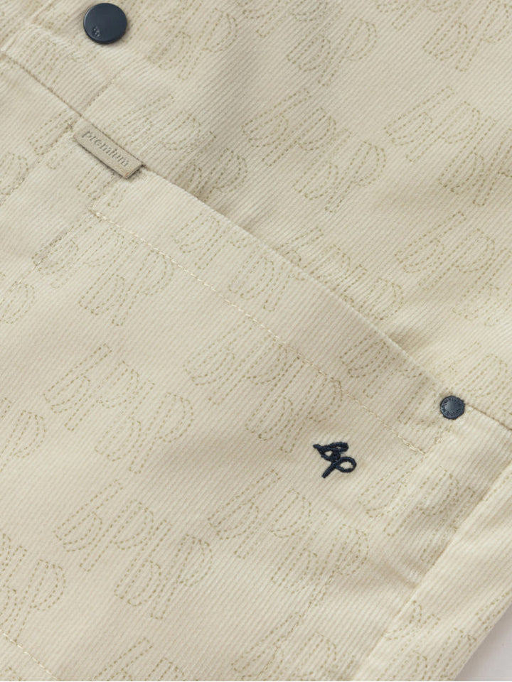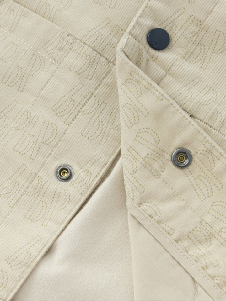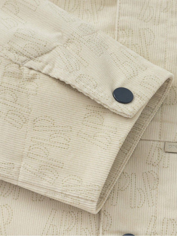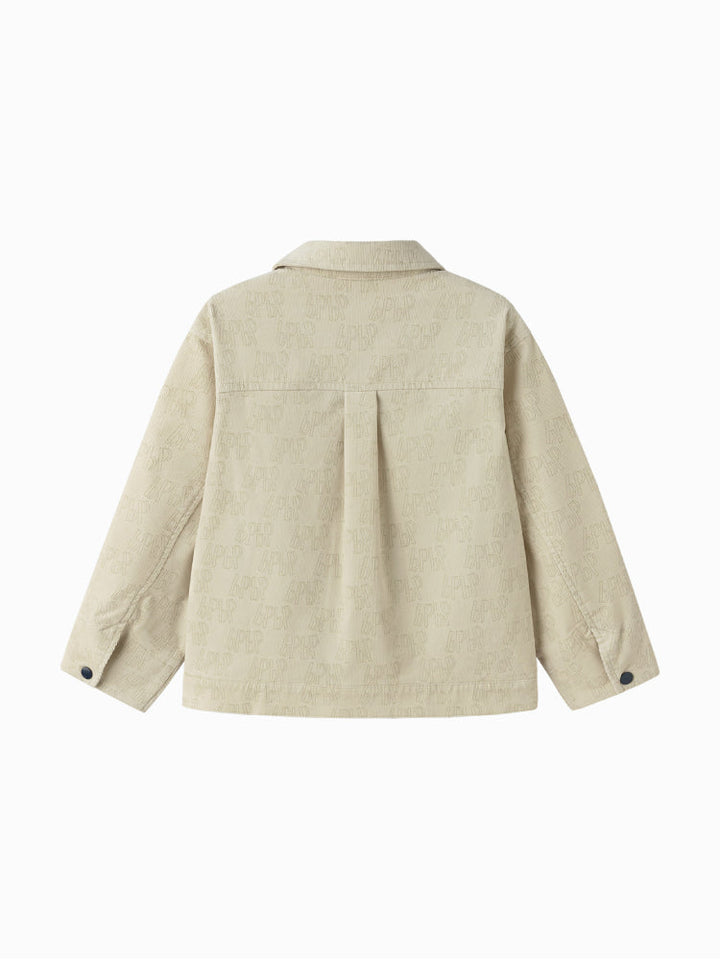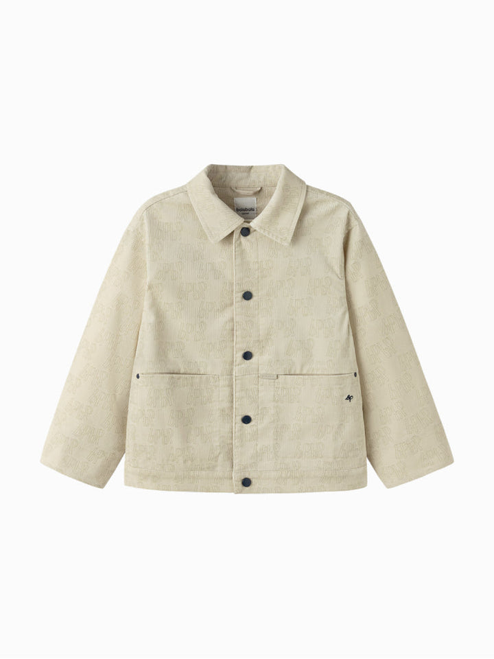 جاكيت خفيف مزين بنقشة شعار ناعمة بكامل التصميم، مزود بإغلاق أمامي بأزرار كبس وياقة كلاسيكية مع جيوب أمامية عملية لإطلالة عصرية ومريحة.