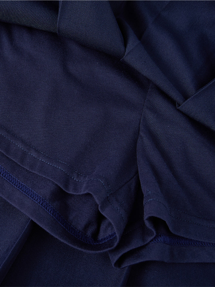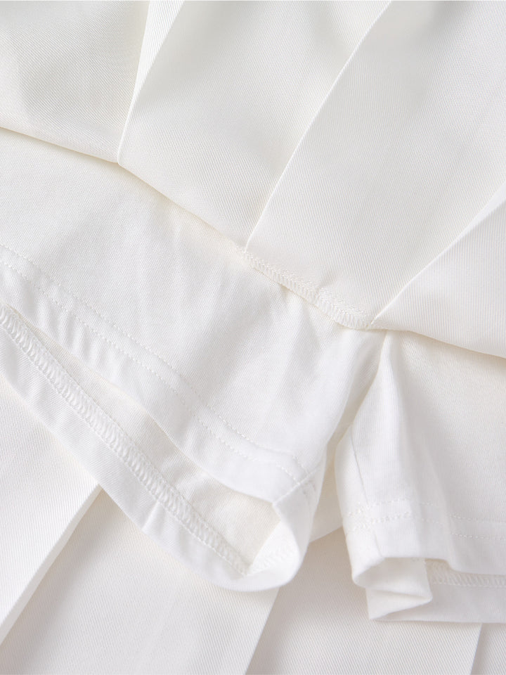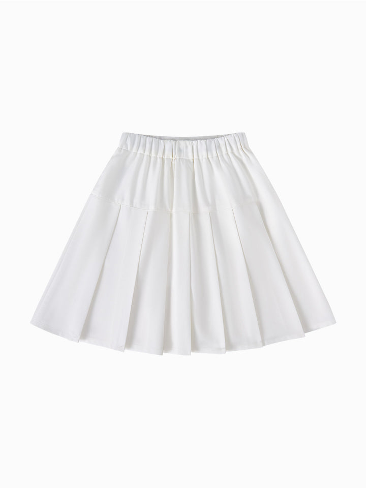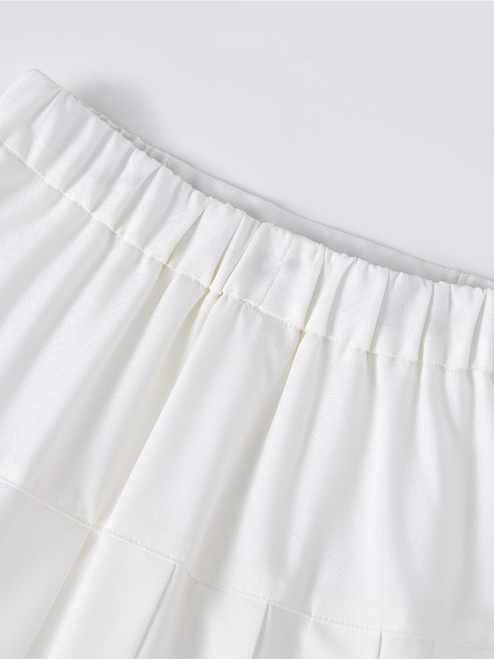 تتميز هذه التنورة القصيرة بتصميم بلون موحد مع طيات ناعمة وتفاصيل شرائط صغيرة على الأمام. تحتوي على خصر مطاطي وشورت داخلي مرفق لراحة وحركة سهلة.
