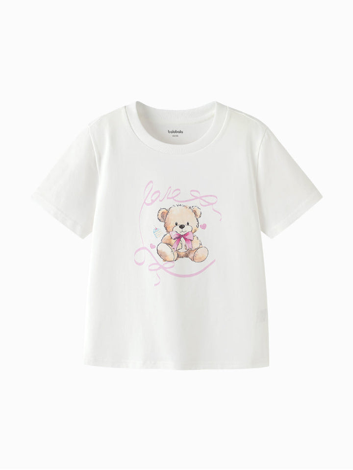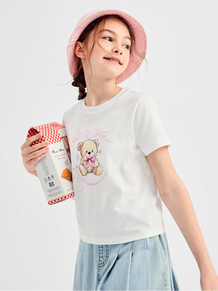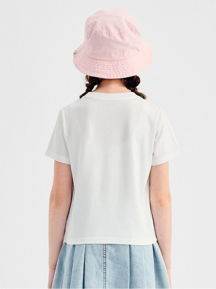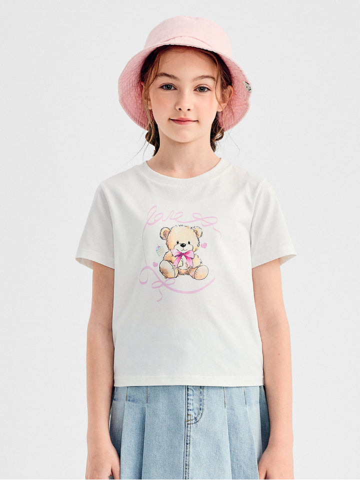 تيشيرت قطني بطباعة أمامية وياقة دائرية للبنات