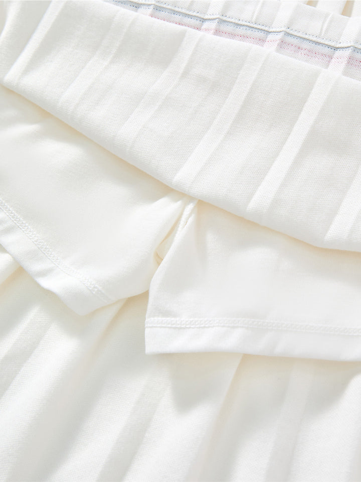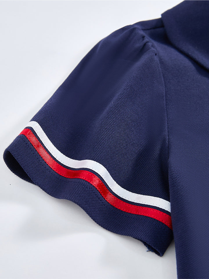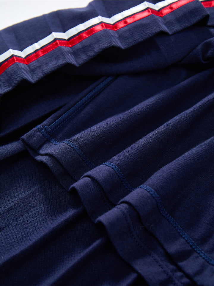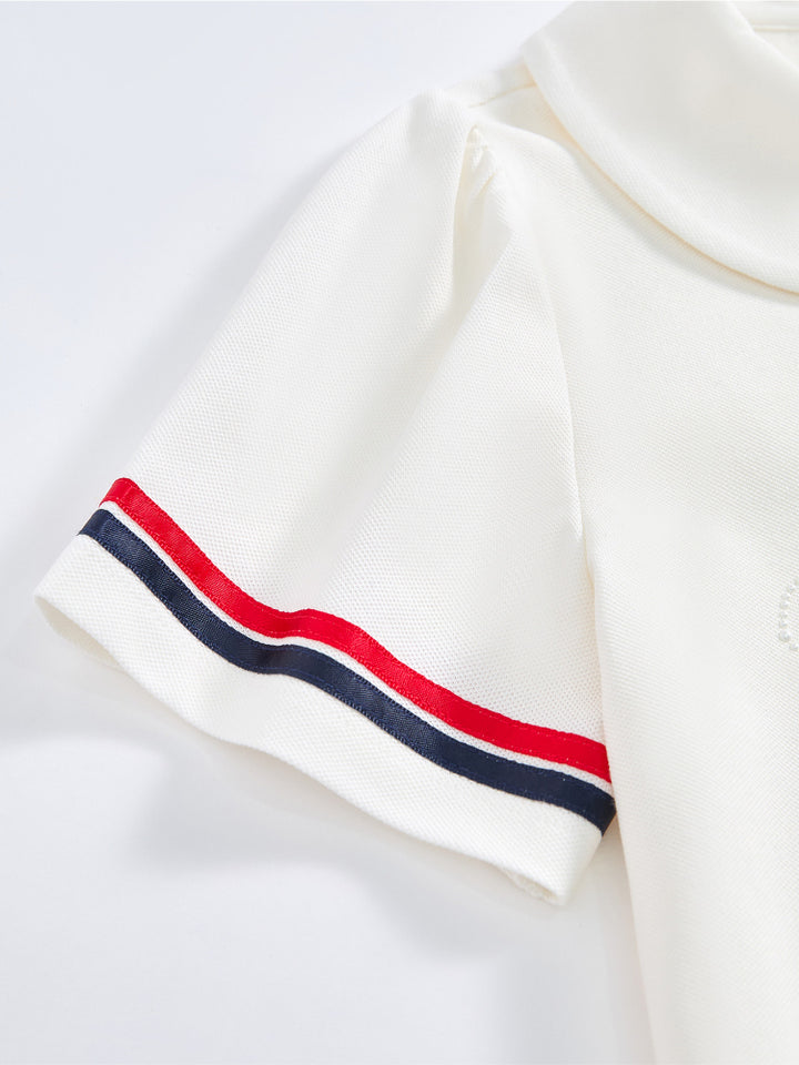 يحتوي هذا الطقم اللطيف للأطفال على تيشيرت بولو بأكمام قصيرة مع تفاصيل خطوط على أطراف الأكمام، وطبعة نقاط على الأمام، وأزرار أمامية عند الرقبة وياقة كلاسيكية. يأتي مع تنورة قصيرة بطيات كاملة، وتفاصيل خطوط على الأسفل، وخصر مطاطي، وشورت داخلي مرفق للراحة.