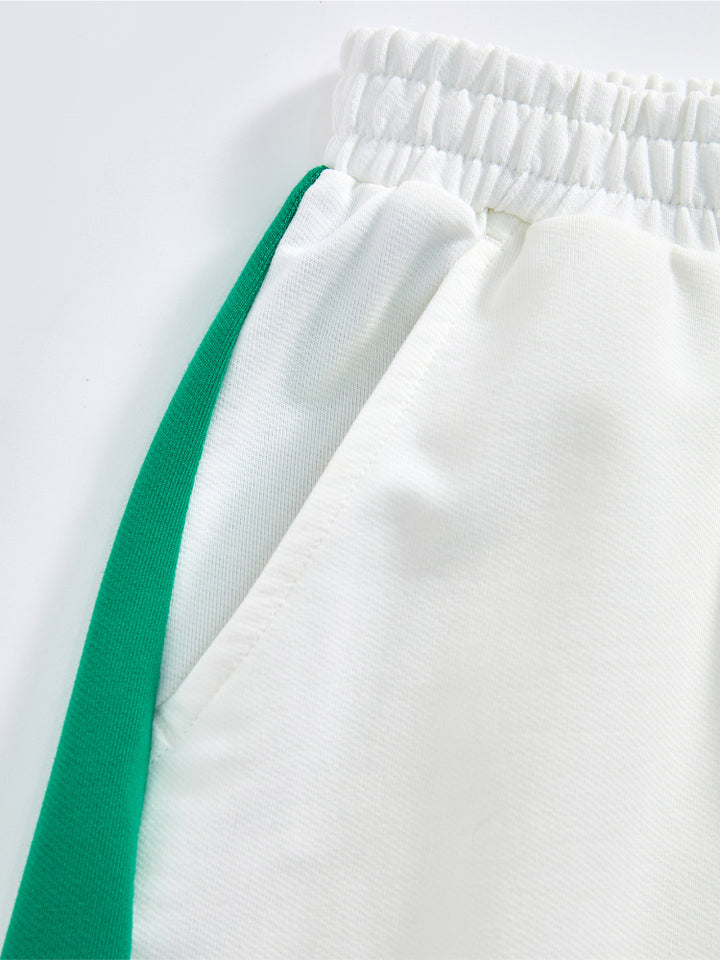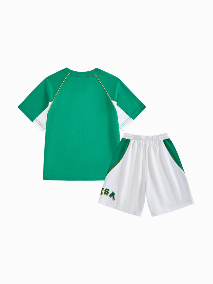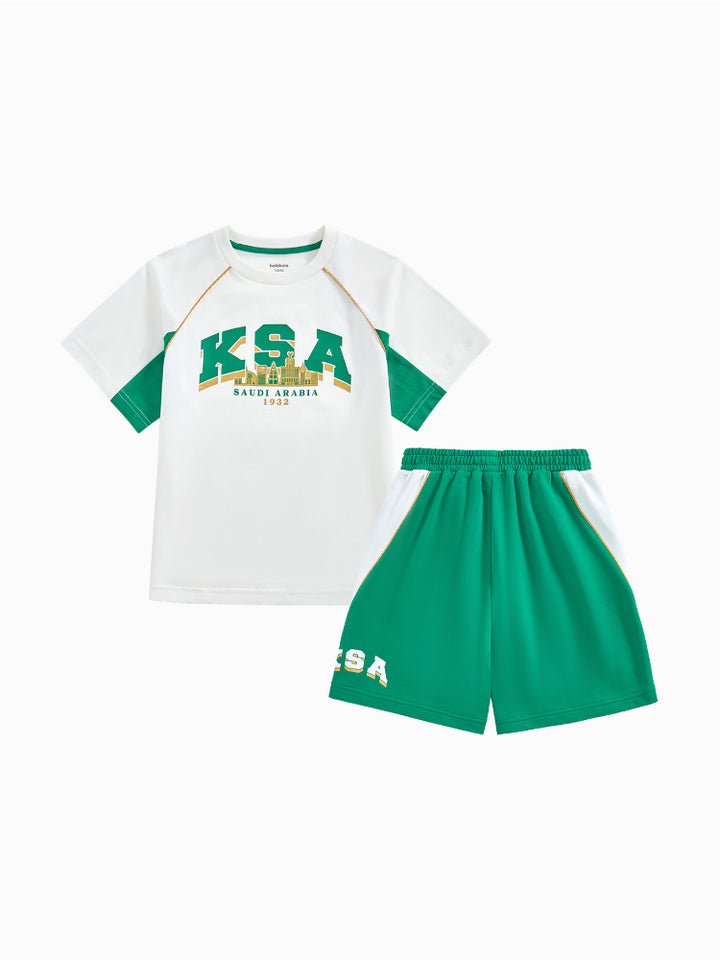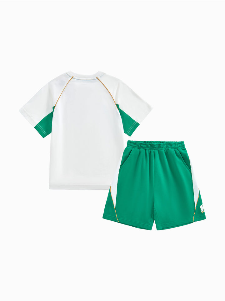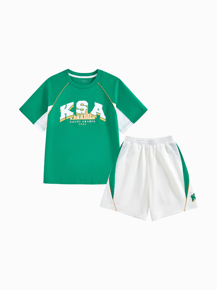 يحتوي هذا الطقم اللطيف للأطفال على تيشيرت بأكمام قصيرة مع تفاصيل متباينة على الأكمام وطبعة أمامية، يأتي مع شورت مزود بتفاصيل متباينة على الجوانب وطبعة أمامية وجيوب وخصر مطاطي لراحة قصوى.