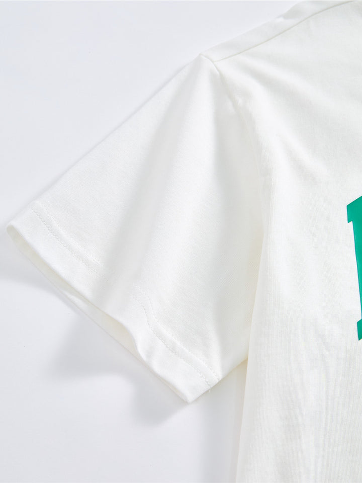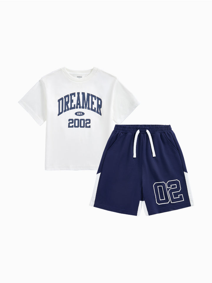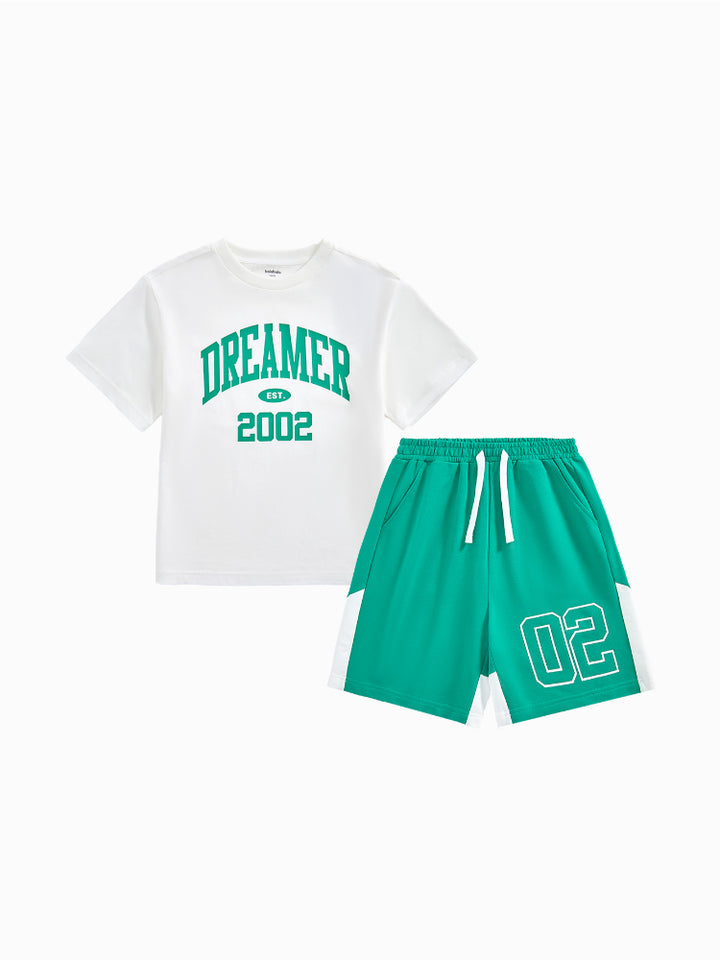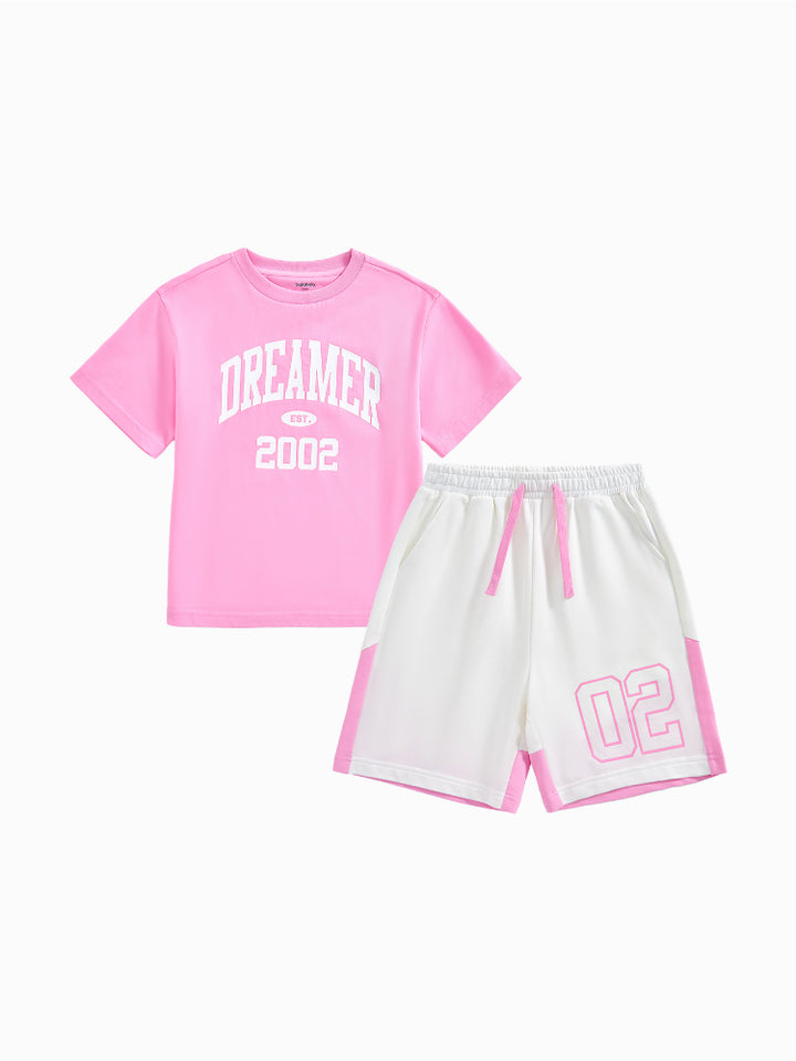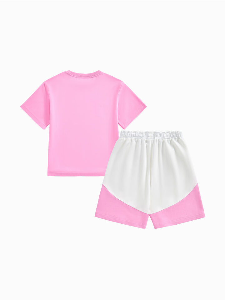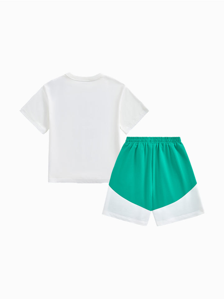 طقم من قطعتين - تيشيرت مطبوع وشورت بتفاصيل متباينة للجنسين