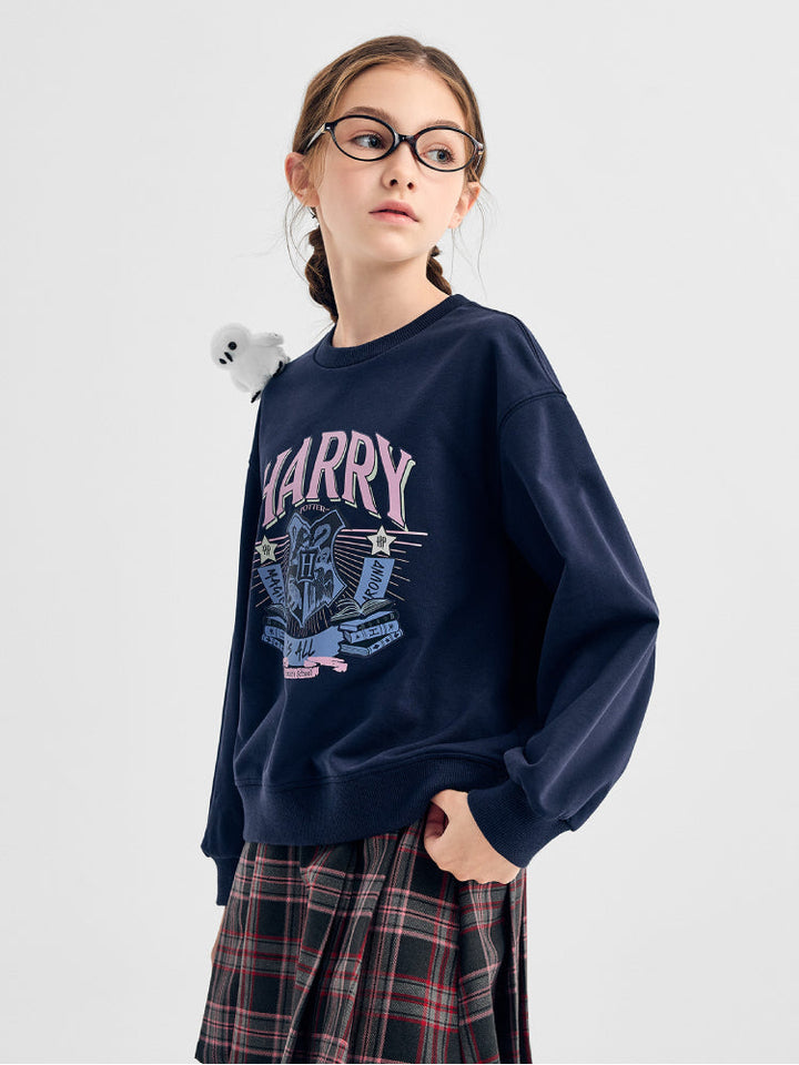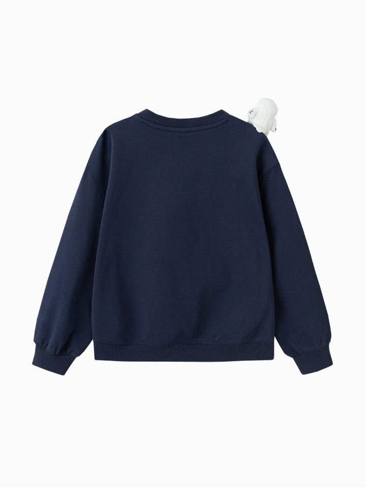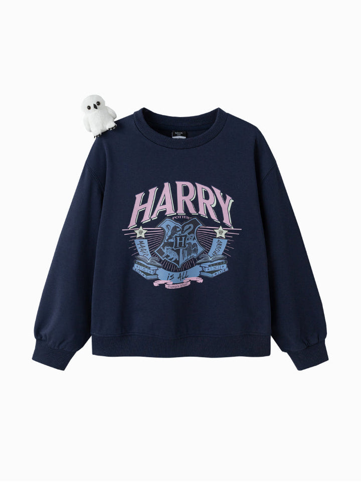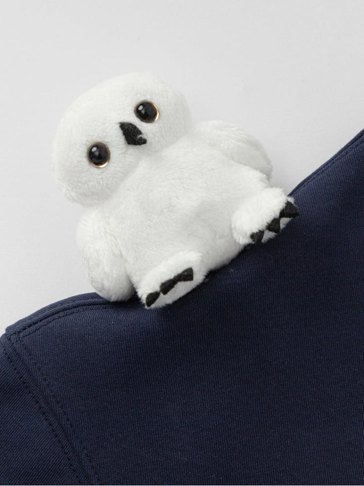 سويت شيرت بقصة مريحة وياقة دائرية، مزود بأطراف وأكمام مطاطية. يتميز بطبعة جرافيك بارزة في الأمام مع دمية بومة قابلة للإزالة على الكتف تمنحه لمسة مرحة ومميزة.