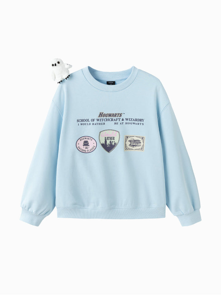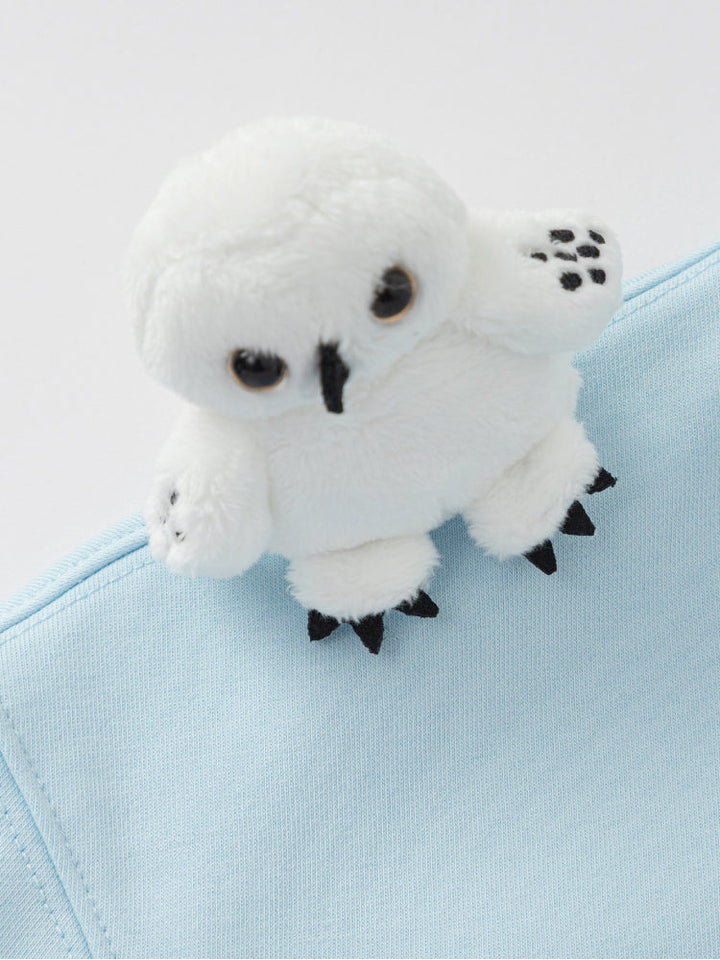 سويت شيرت بقصة مريحة وياقة دائرية، مزود بأطراف وأكمام مطاطية. يتميز بطبعة جرافيك بارزة في الأمام مع دمية بومة قابلة للإزالة على الكتف تمنحه لمسة مرحة ومميزة.