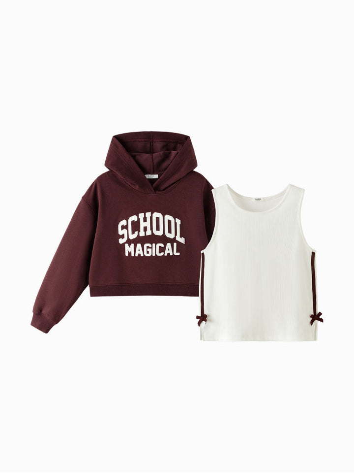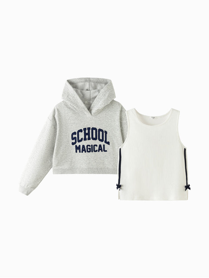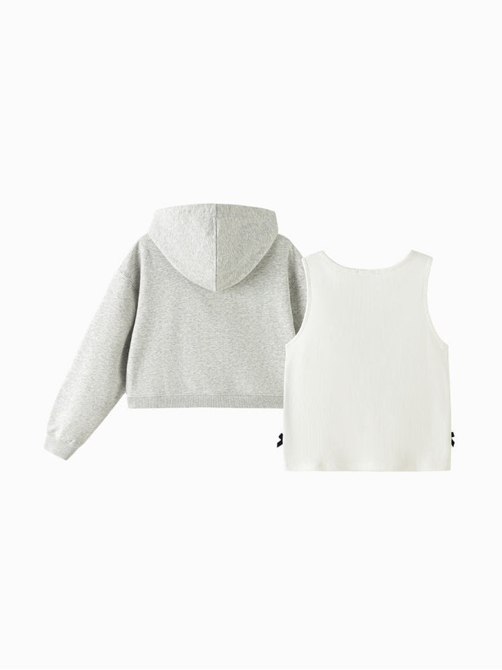 طقم مكون من قطعتين يضم هودي بتفاصيل مطبوعة في الأمام وتوب بدون أكمام مزود بربطات جانبية أنيقة. تصميم عملي يمكن ارتداؤه معًا أو بشكل منفصل لإطلالات متنوعة.