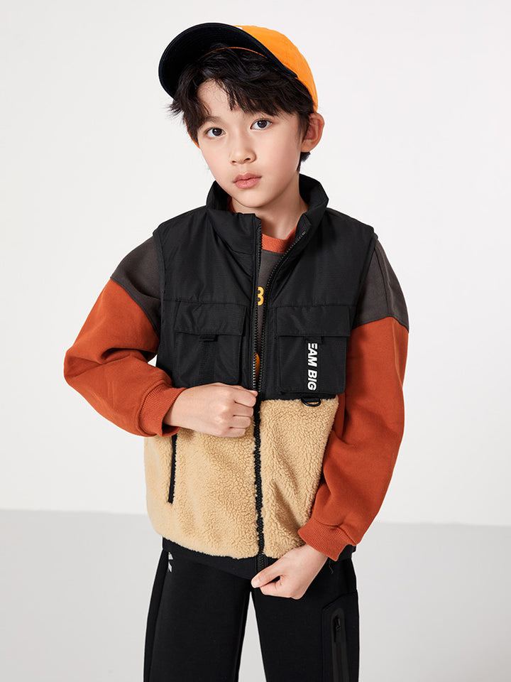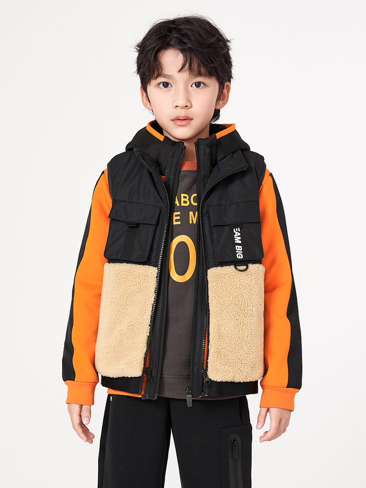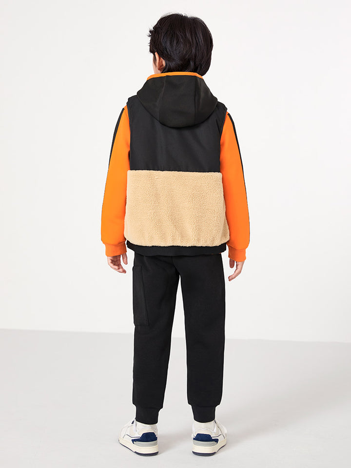 طقم مكون من جاكيت وفيست شتوي، فيست بدون أكمام بنمط متباين الخامة والألوان، مزين بطبعة من الجهة الأمامية، يأتي بجيوب قلاب وجيوب عادية من الجهة الأمامية، سحاب للإغلاق من الجهة الأمامية وياقة مرتفعة، وجاكيت رياضي كاجوال بأكمام طويلة، مزين بتفاصيل خطوط متباينة اللون على الأكمام، يأتي بجيوب من الجهة الأمامية، سحاب أمامي للإغلاق وبياقة هودي متصلة