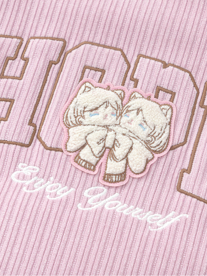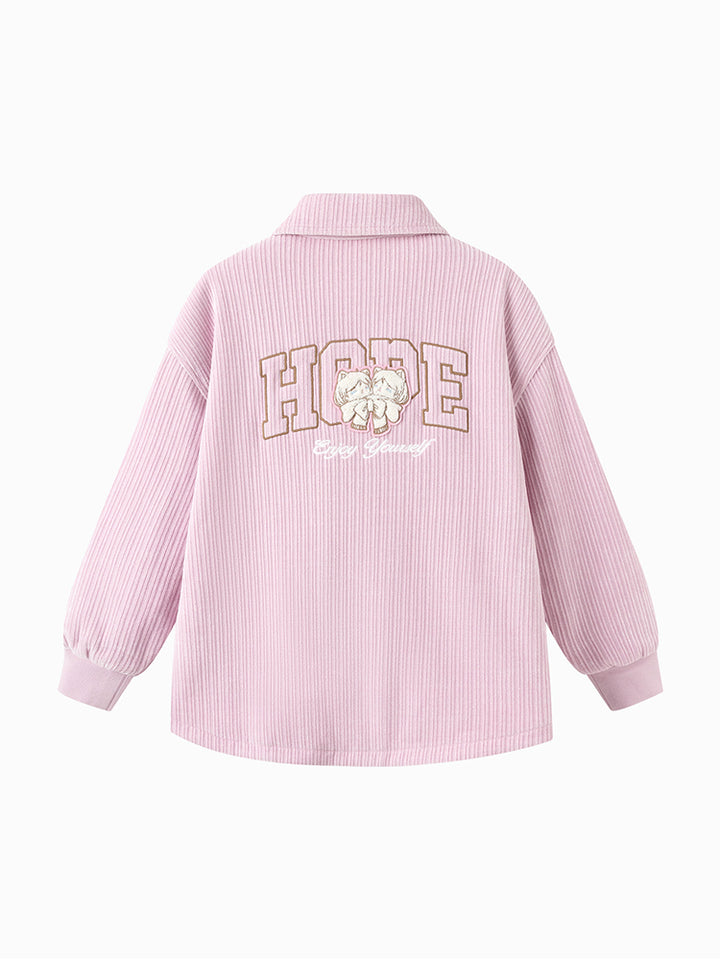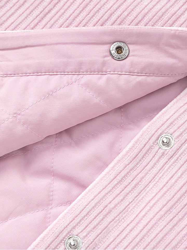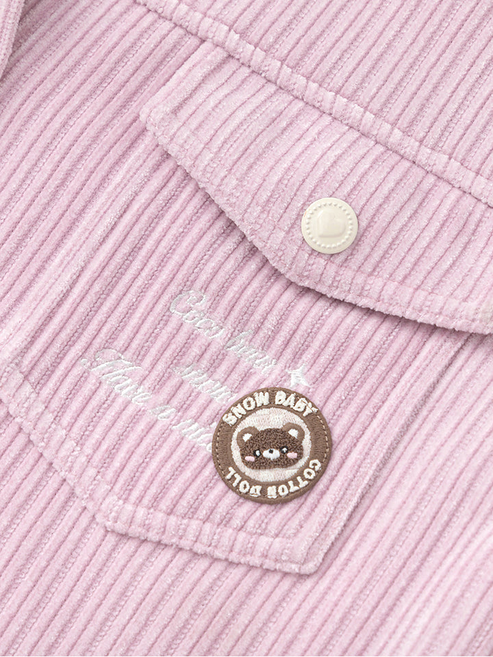 جاكيت شتوي بأكمام طويلة وخامة كوردروي بنقشة مضلعة، مزين بتفاصيل مطرزة من الجهتين الأمامية والخلفية، يأتي بجيوب قلاب أمامية، أزرار أمامية للإغلاق وبياقة مطوية
