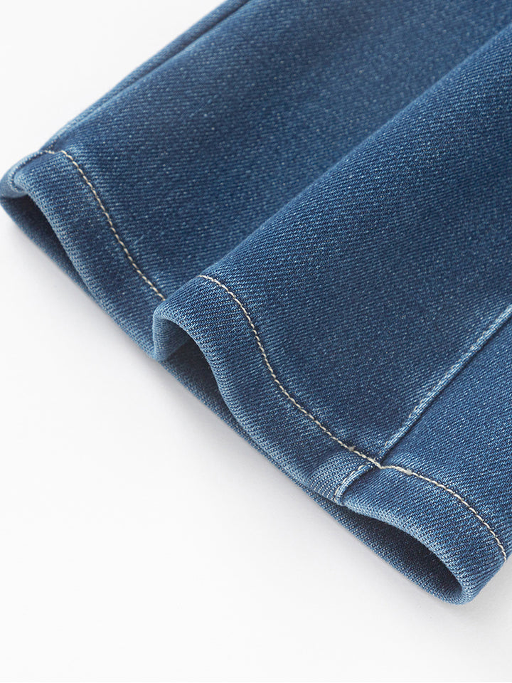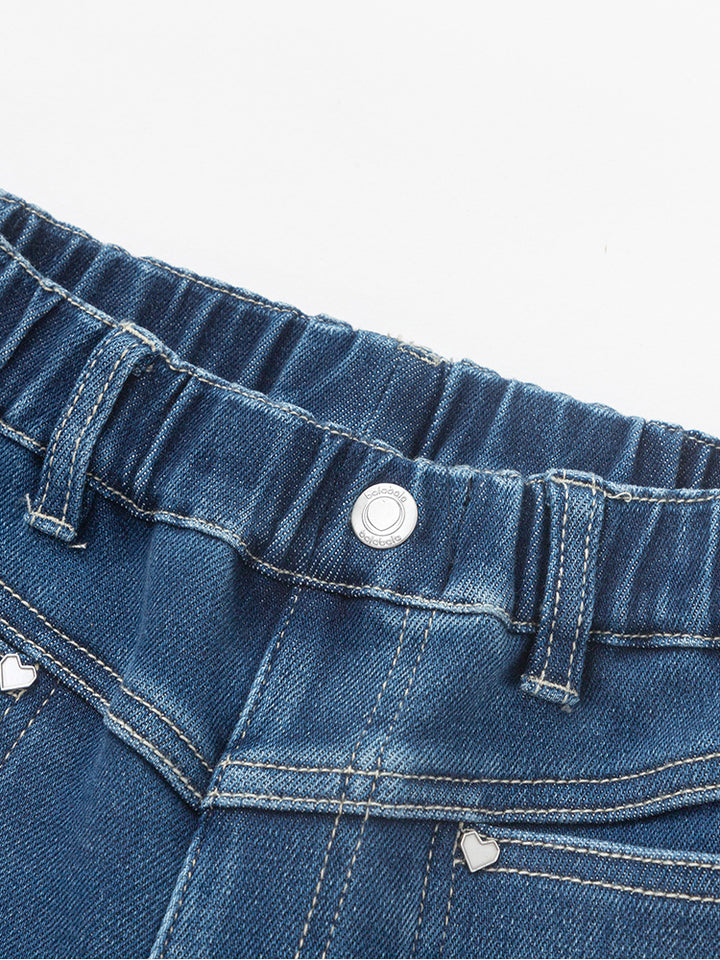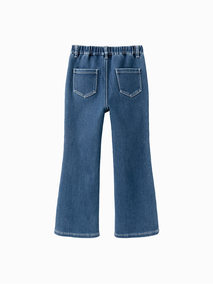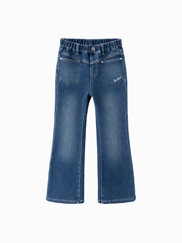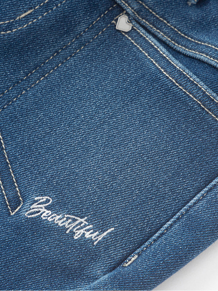 بنطلون جينز كاجوال مزين بنمط مسحاب باهتة وتفاصيل تطريز من الجهة الأمامية، يأتي بجيوب أمامية وخلفية وبخصر مطاطي مريح